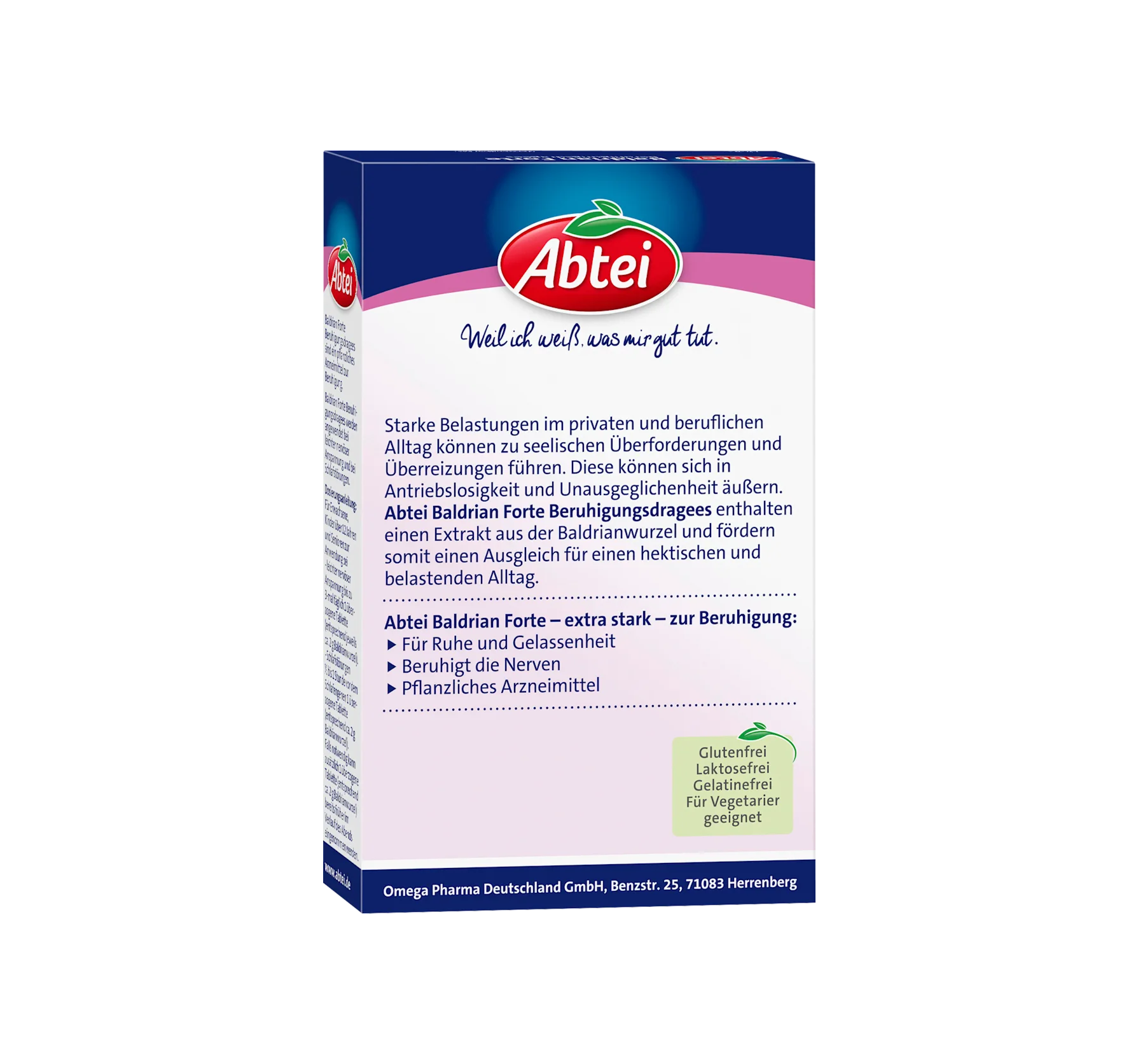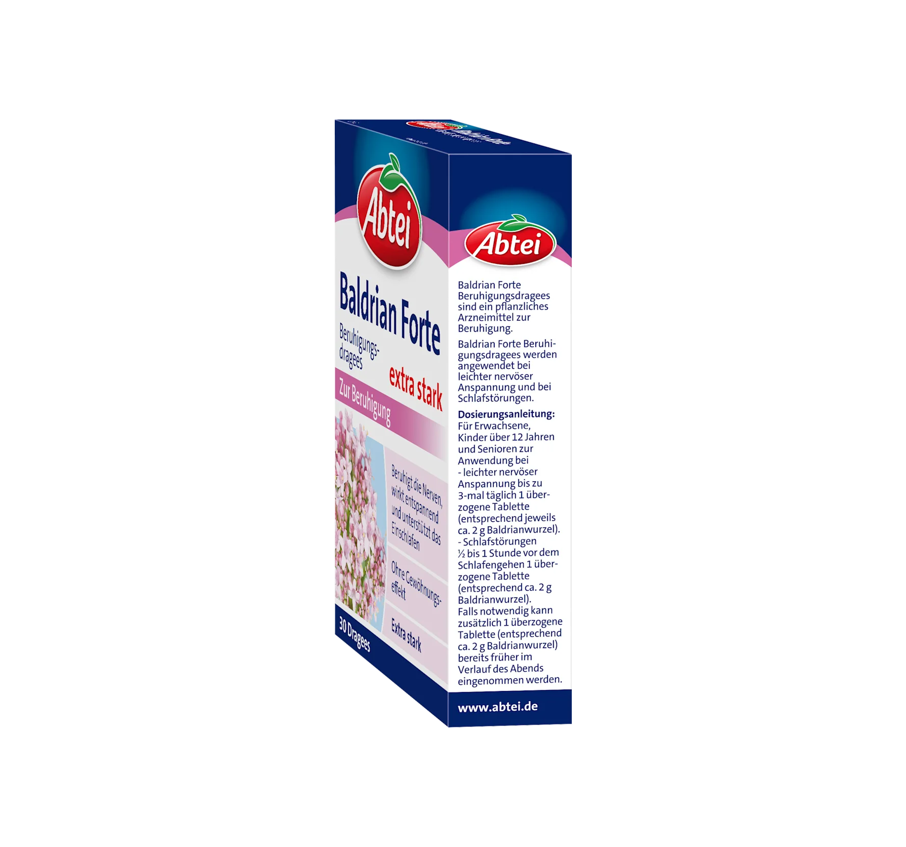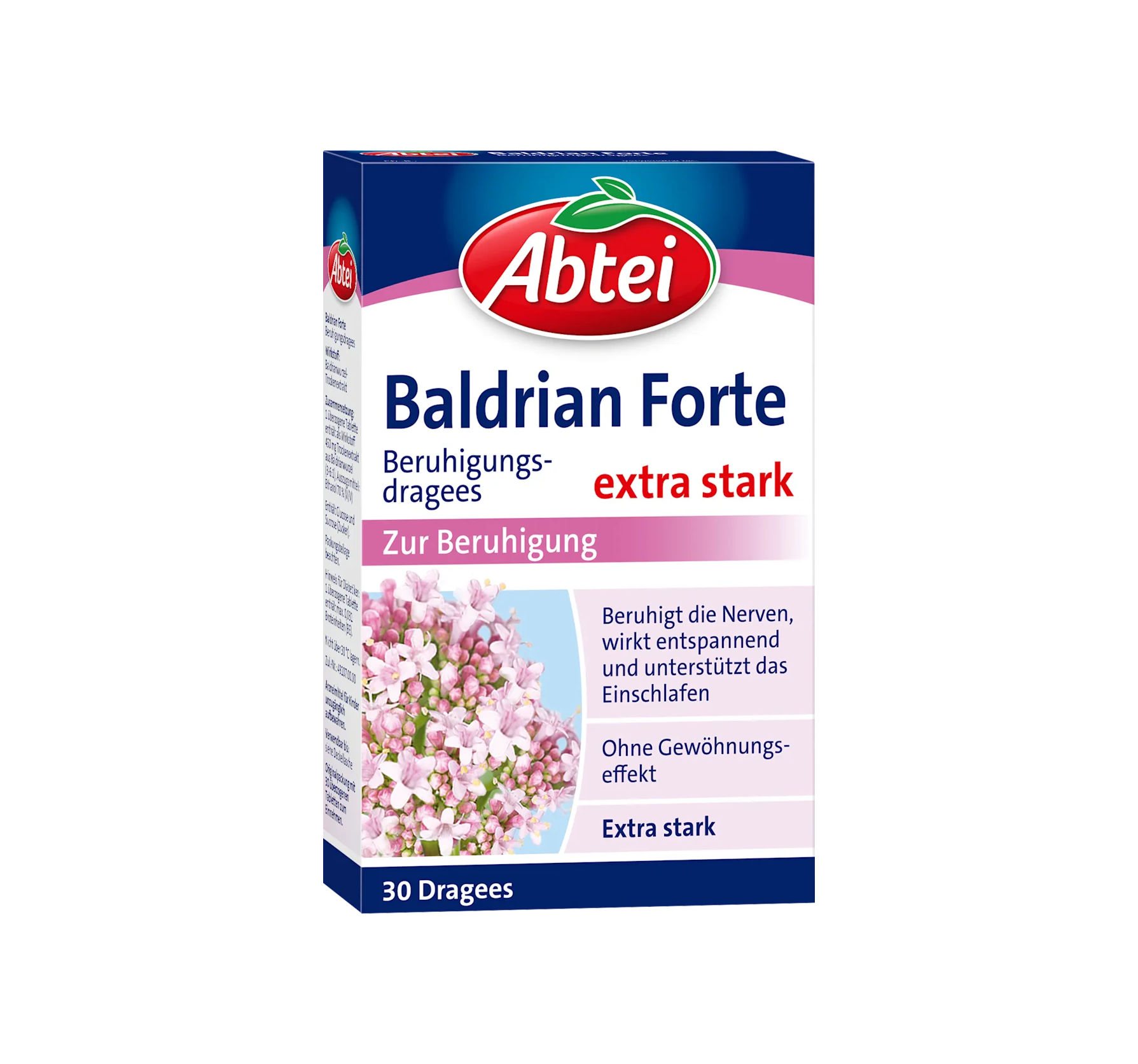 Do not take Valerian Forte Calming Tablets if you are allergic to valerian root or any of the other ingredients of this medicine listed in section 6. Children and adolescents: There are insufficient studies on the use of Valerian Forte Calming Tablets in children under 12 years of age. Use in children in this age group is therefore not recommended. For risks and side effects, read the package insert and ask your doctor or pharmacist. Active ingredients: Valerian root dry extract. Indications: Valerian Forte Calming Coated Tablets are used for mild nervous tension and sleep disorders. Active ingredient concentration: 450 mg dry extract of valerian root (3-6:1), extraction agent: ethanol 70% (v/v). Dosage form: Coated tablets. Exact product name: ABTEI Valerian Forte Calming. Keep this medicine out of the sight and reach of children. Do not use this medicine after the expiry date printed on the carton or container after "Use by." The expiry date refers to the last day of that month. Do not store above 30°C. Never dispose of medicines via wastewater (e.g., not down the toilet or sink). Ask your pharmacist how to dispose of medicines no longer required. This will help protect the environment. Further information can be found at www.bfarm.de/arzneimittelentsorgung.