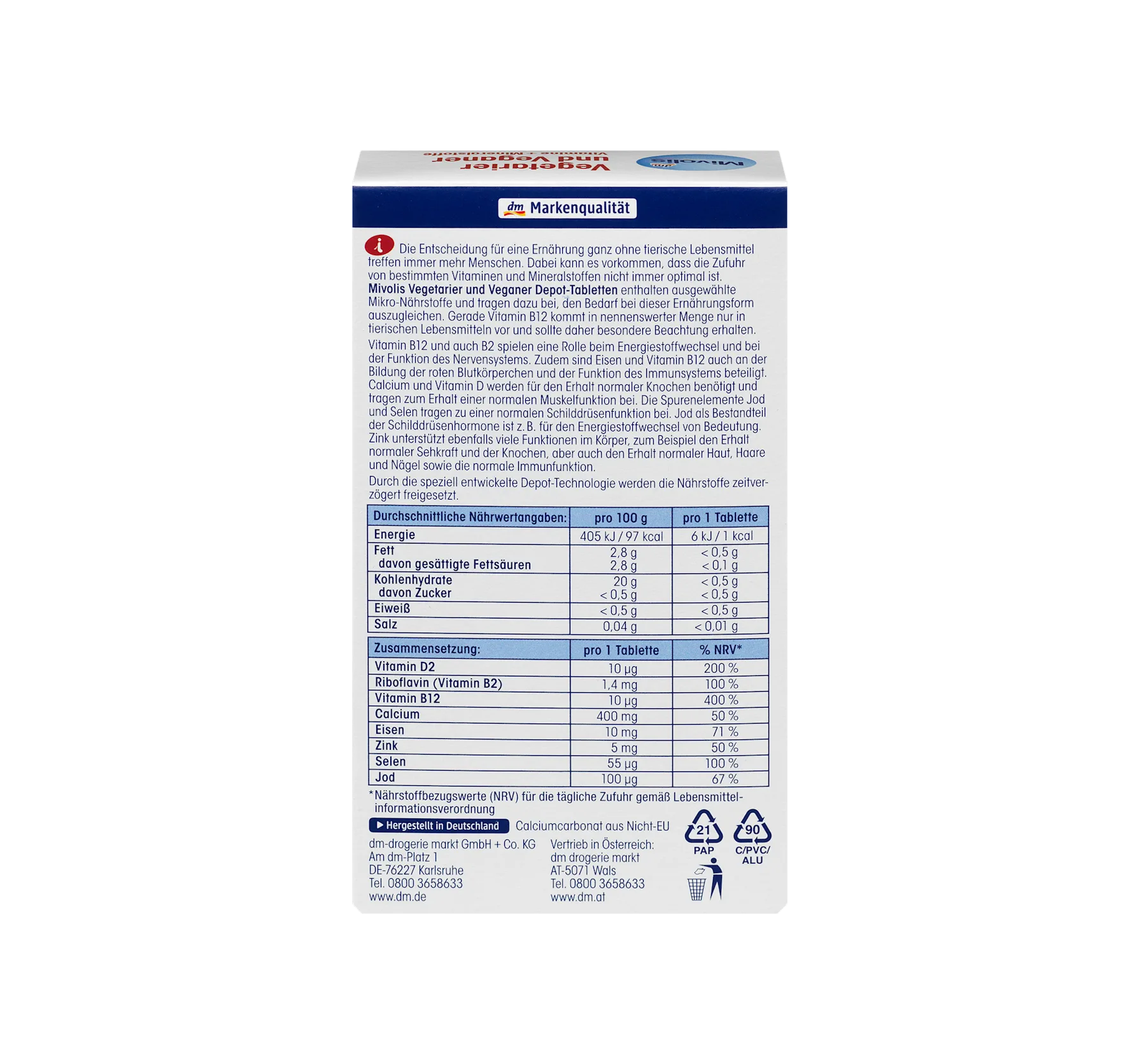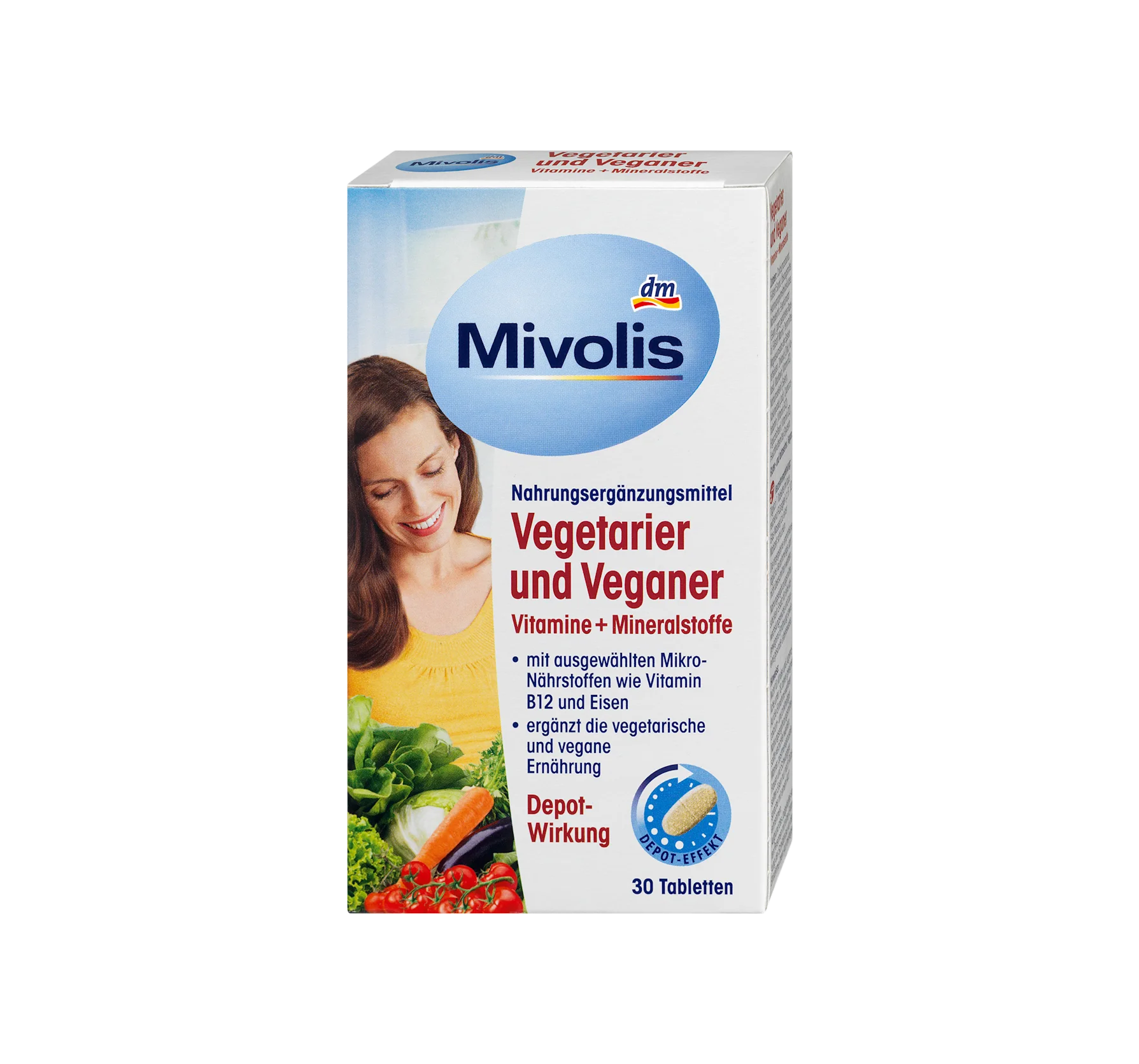 More and more people are choosing a diet without any animal products. However, the intake of certain vitamins and minerals may not always be optimal. Mivolis Vegetarian and Vegan Depot Tablets c...