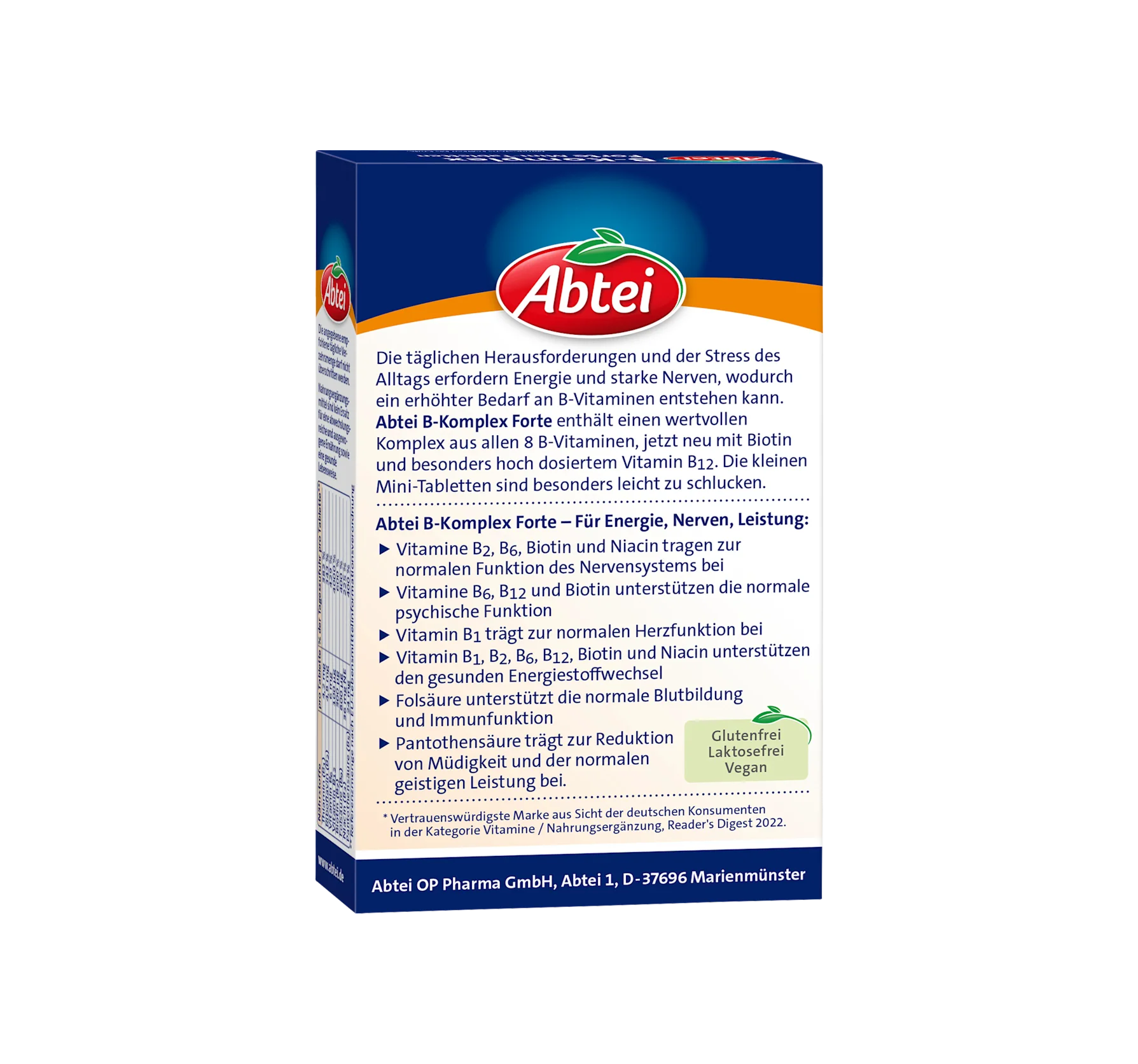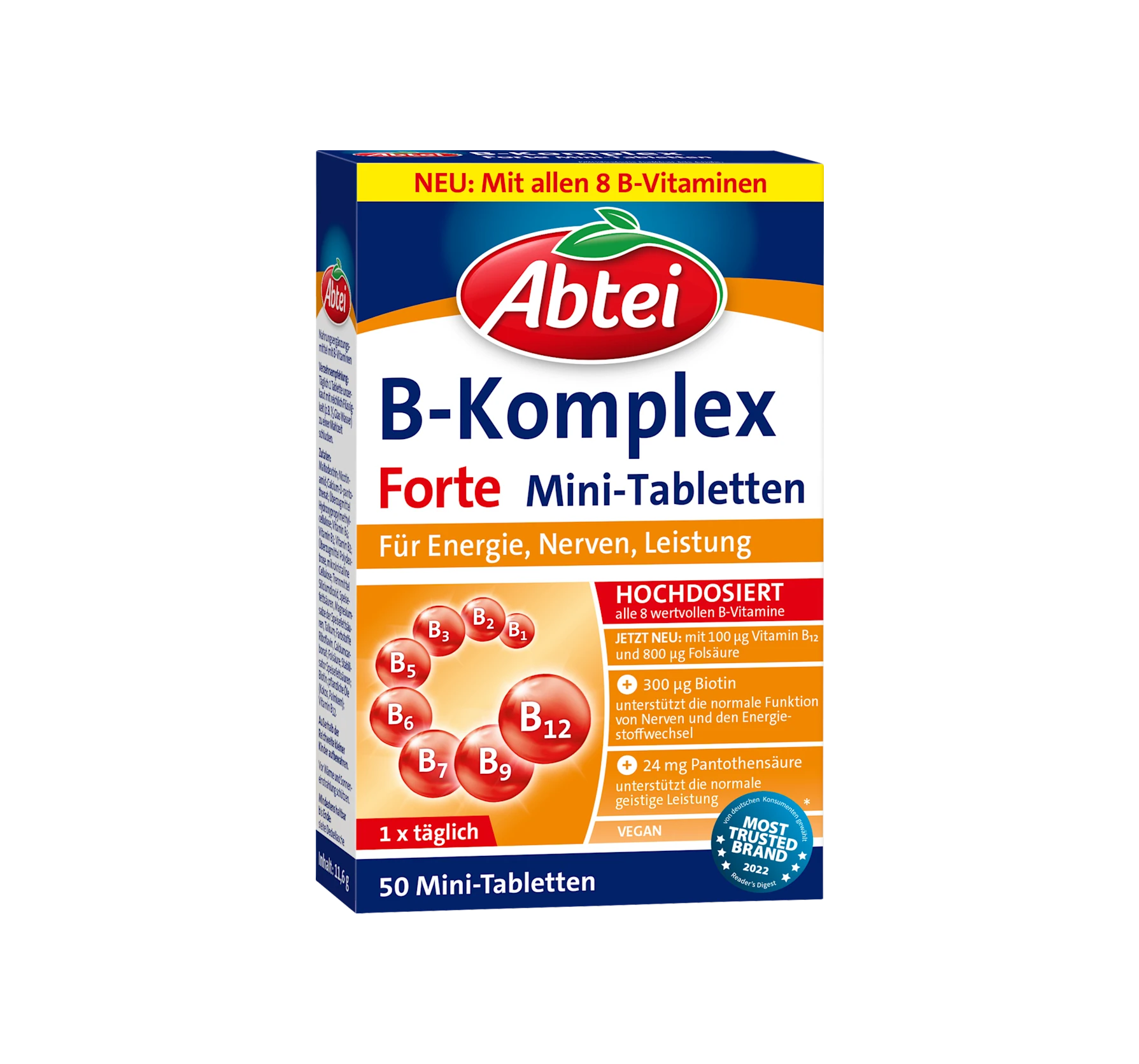Abtei Vitamin B Complex Forte Tablets 50 tablets contain a complex of all 8 B vitamins, now with biotin and a particularly high dose of vitamin B12. Vitamin B1 contributes to normal heart functi...