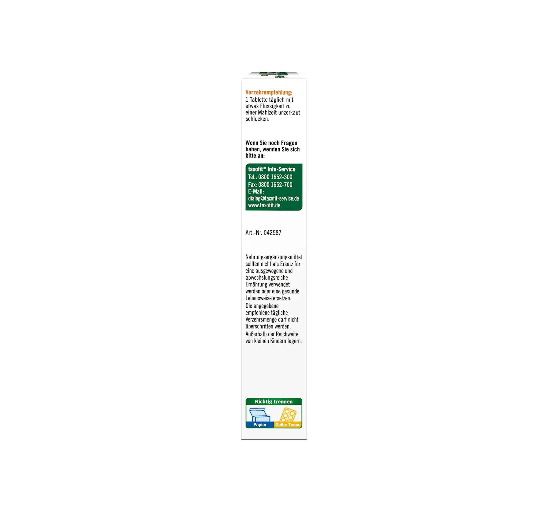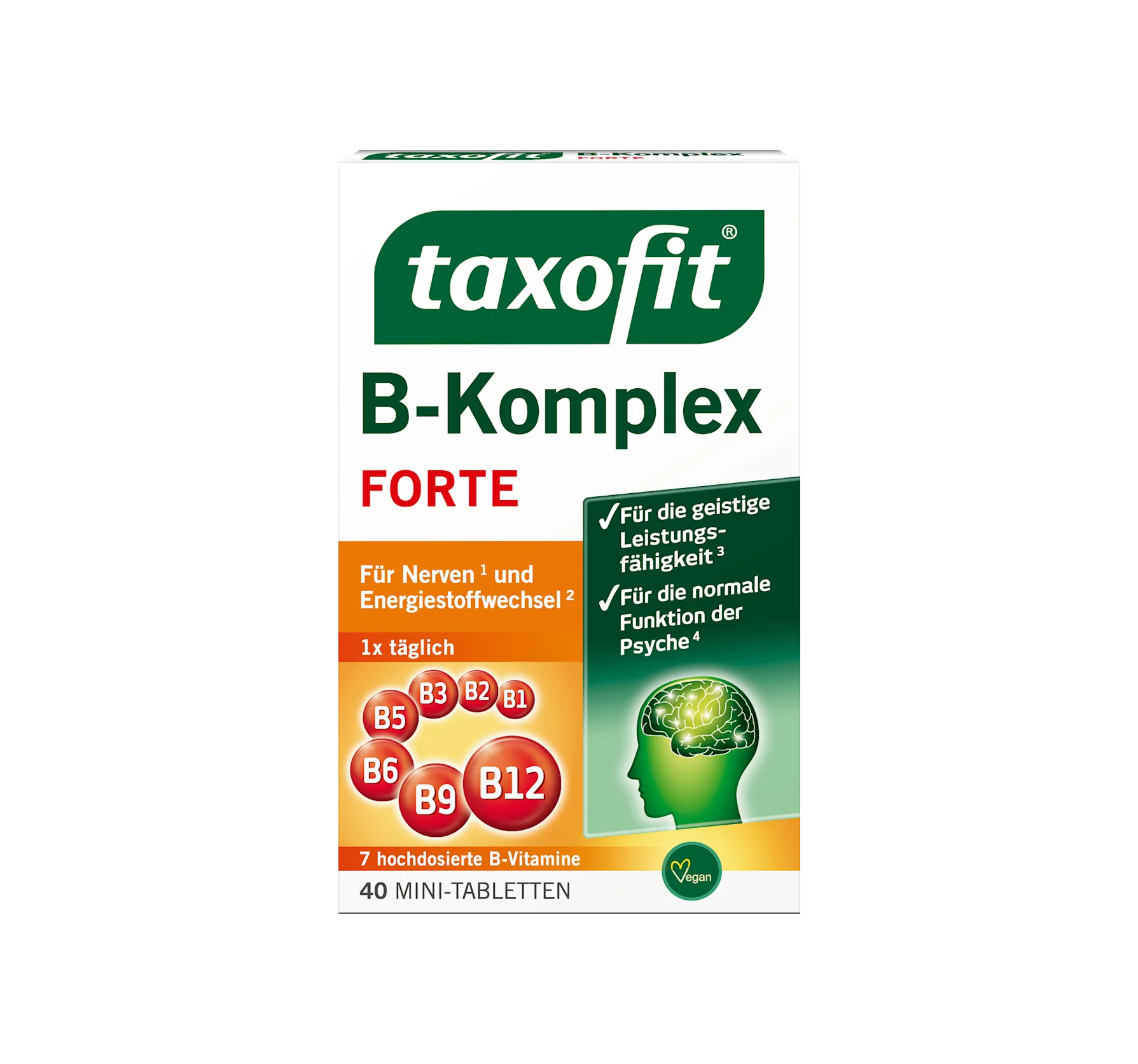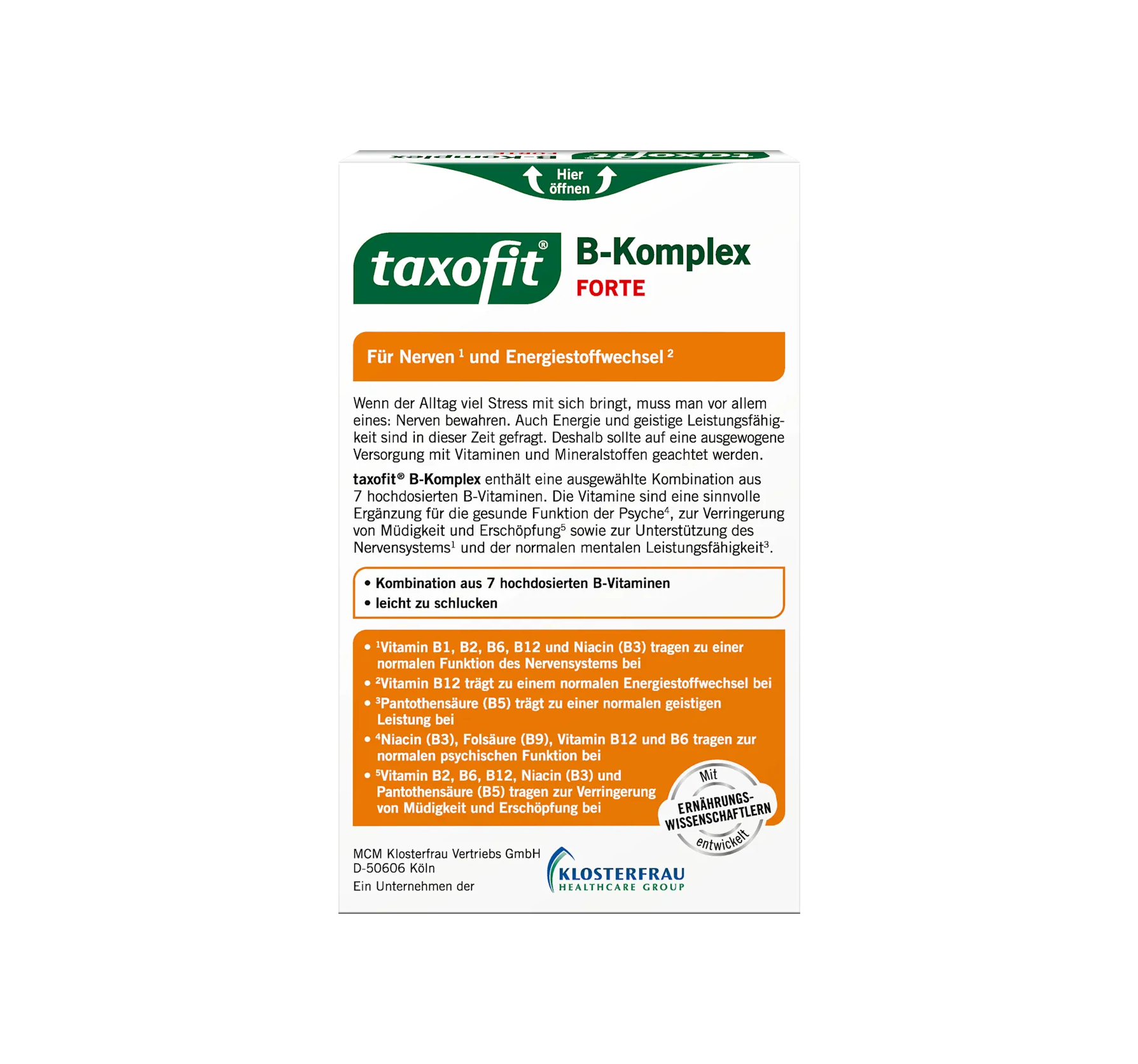 taxofit B-Complex + Folic Acid contains a selected combination of B vitamins. This item is available for express orders or in our dm stores. Highly dosed with 600 µg folic acid.