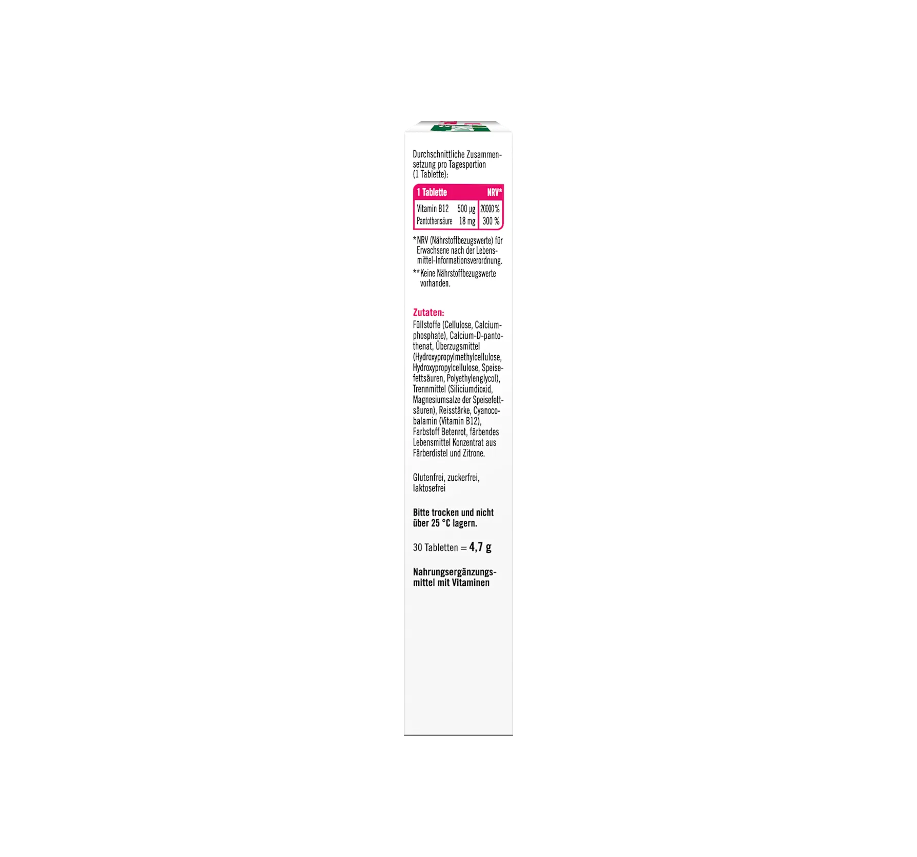 EXACT PRODUCT NAME: FOOD SUPPLEMENT WITH VITAMINS. INGREDIENTS: FILLERS (CELLULOSE, CALCIUM PHOSPHATES), CALCIUM D-PANTOTHENATE, GLAZING AGENTS (HYDROXYPROPYLMETHYLCELLULOSE, HYDROXYPROPYLCELLULOSE, FATTY ACIDS, POLYETHYLENE GLYCOL), ANTI-CAKING AGENTS (SILICON DIOXIDE, MAGNESIUM SALTS OF FATTY ACIDS), RICE STARCH, CYANOCOBALAMIN (VITAMIN B12), BEETROOT RED COLOR, COLORING FOOD CONCENTRATE FROM SAFFLOWER AND LEMON. PLEASE NOTE THE ALLERGEN INFORMATION.