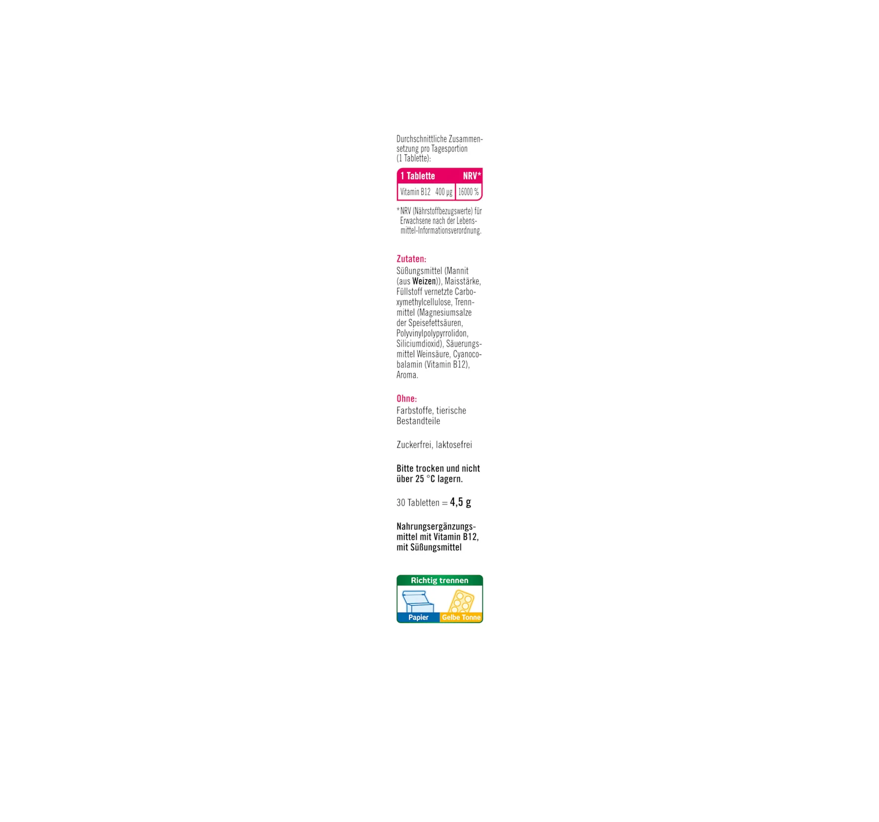 EXACT PRODUCT NAME: DIETARY SUPPLEMENT WITH VITAMIN B12, WITH SWEETENER. INGREDIENTS: SWEETENER (MANNITOL (FROM WHEAT)), CORN STARCH, CROSS-LINKED CARBOXYMETHYLCELLULOSE FILLER, ANTI-CAKING AGENTS (MAGNESIUM SALTS OF FATTY ACIDS, POLYVINYLPOLYPYRROLIDONE, SILICON DIOXIDE), ACIDIFIER TARTARIC ACID, CYANOCOBALAMIN (VITAMIN B12), FLAVORING. PLEASE NOTE THE ALLERGEN INFORMATION.