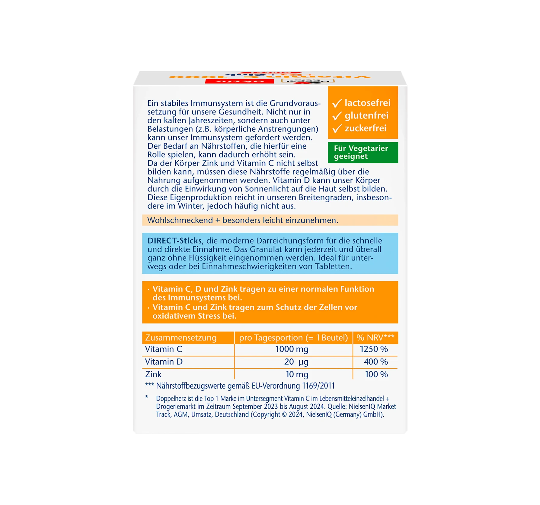 Doppelherz's Vitamin C 1000mg + Zinc Direct combines vitamin C and zinc in convenient direct granules. Vitamin C can contribute to the normal function of the immune system, and zinc can protect ...