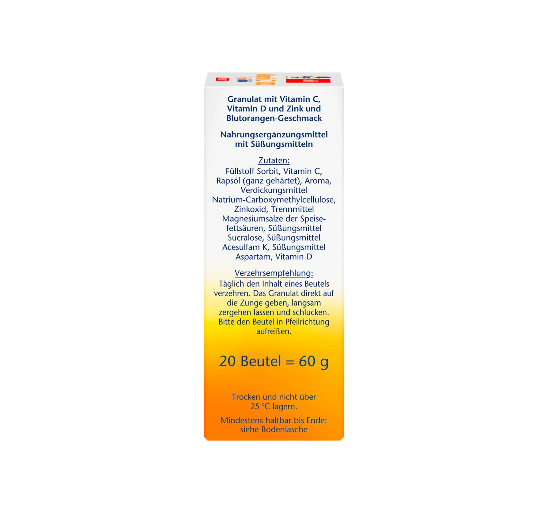 EXACT PRODUCT NAME: FOOD SUPPLEMENT WITH SWEETENERS, GRANULES WITH VITAMIN C, VITAMIN D AND ZINC AND BLOOD ORANGE FLAVOR INGREDIENTS: BULKING AGENT SORBITOL, VITAMIN C, RAPESEED OIL (FULLY HYDROGENATED), FLAVORING, THICKENER SODIUM CARBOXYMETHYLCELLULOSE, ZINC OXIDE, ANTI-CAKING AGENT MAGNESIUM SALTS OF FATTY ACIDS, SWEETENER SUCRALOSE, SWEETENER ACESULFAME K, SWEETENER ASPARTAME, VITAMIN D PLEASE NOTE THE INFORMATION ON ALLERGENS.