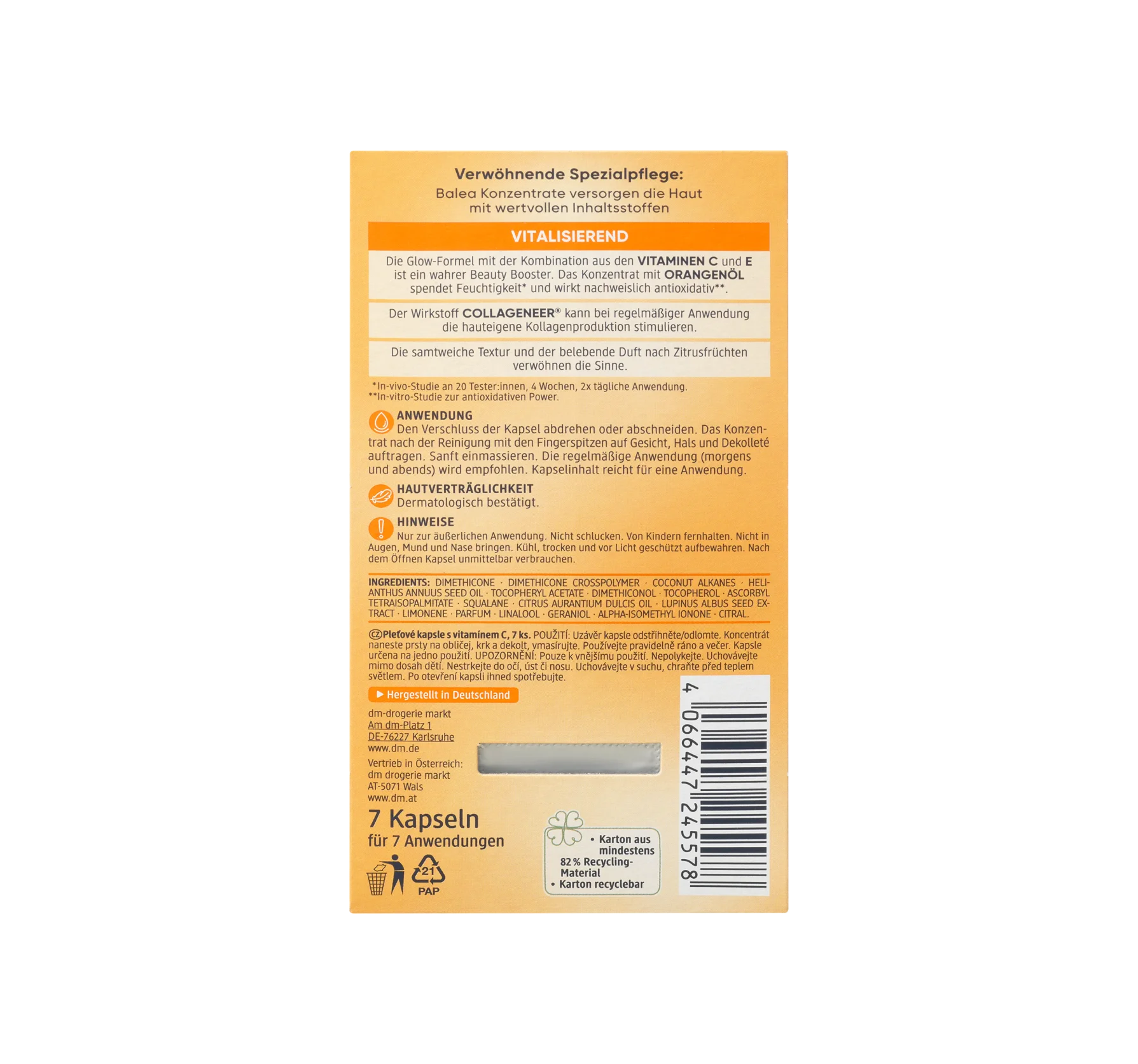 Skin compatibility dermatologically approved. Twist or cut off the capsule cap. After cleansing, apply the concentrate to your face, neck, and décolleté with your fingertips. Gently massage in. Regular use (morning and evening) is recommended. The contents of the capsule are sufficient for one application.