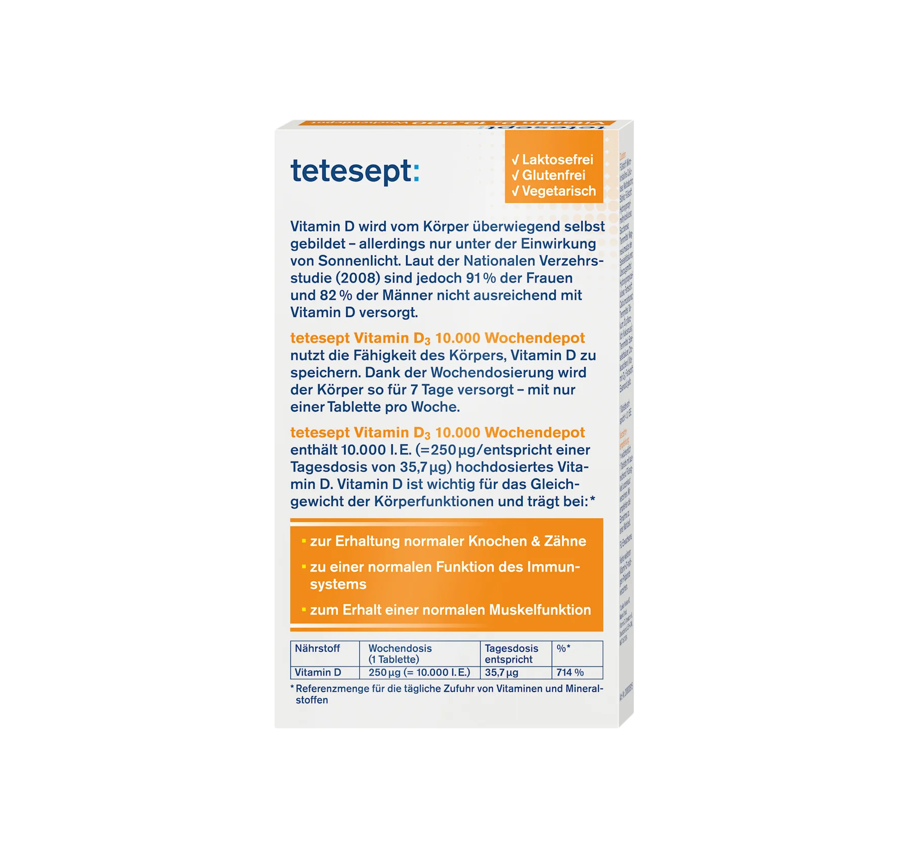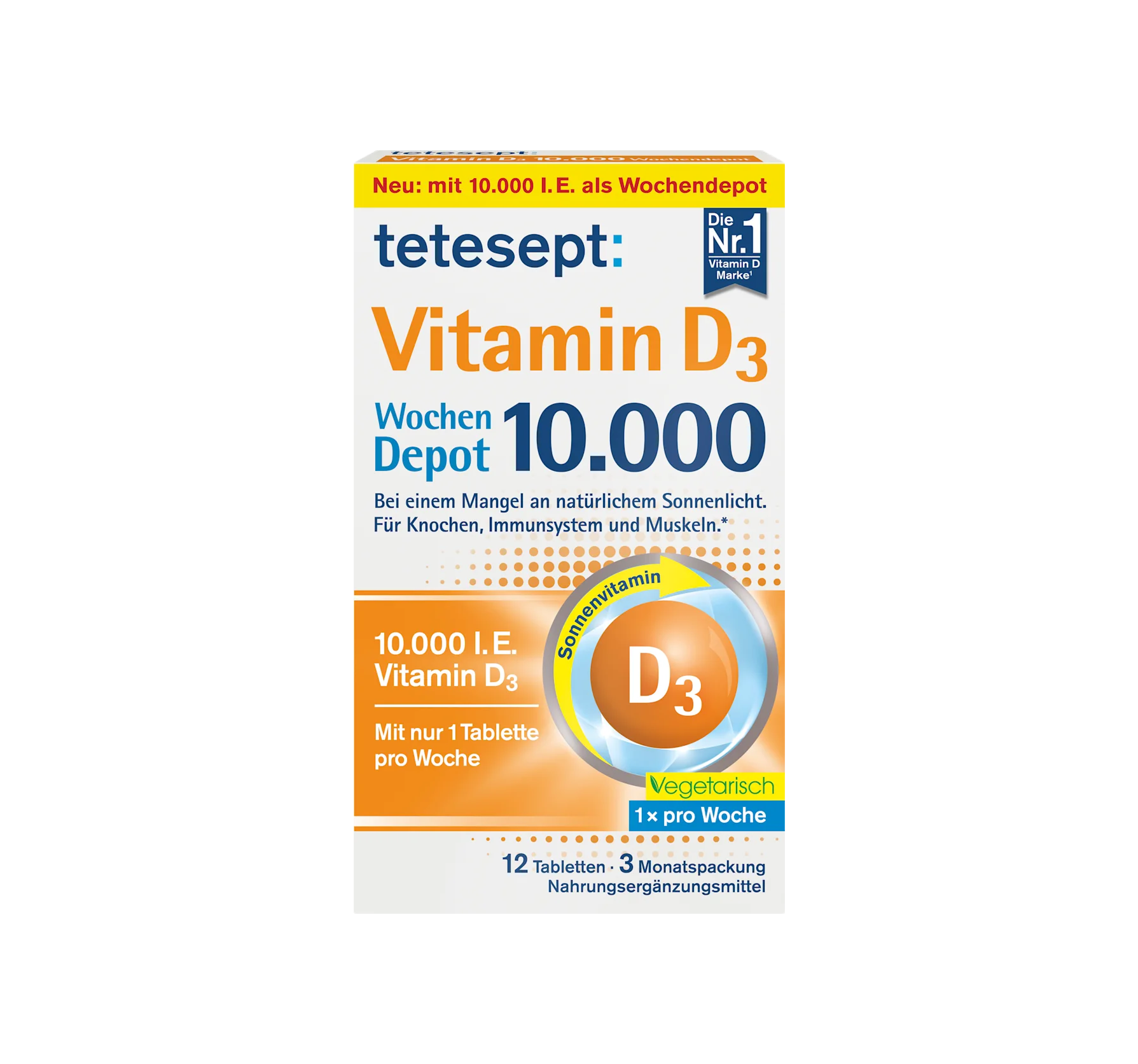 The Vitamin D3 10,000 IU Weekly Depot Tablets from tetesept are a practical dietary supplement specifically developed to support those with a lack of natural sunlight. The weekly dosage makes ta...
