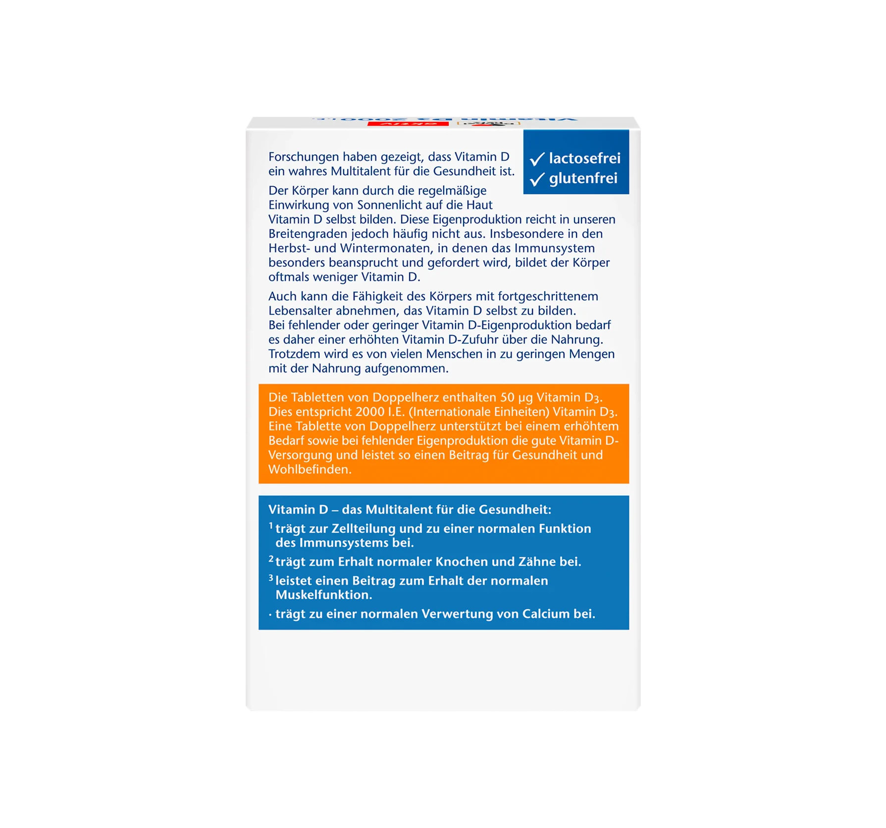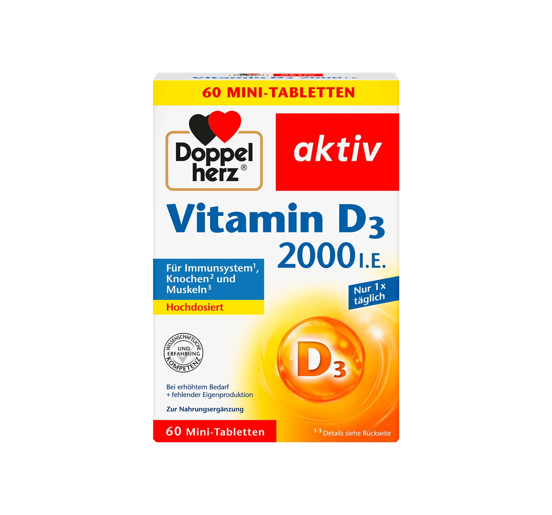 Doppelherz Vitamin D3 tablets contain 50 μg of vitamin D3. This corresponds to 2000 IU (International Units) of vitamin D3. One Doppelherz tablet supports a good vitamin D supply in cases of inc...