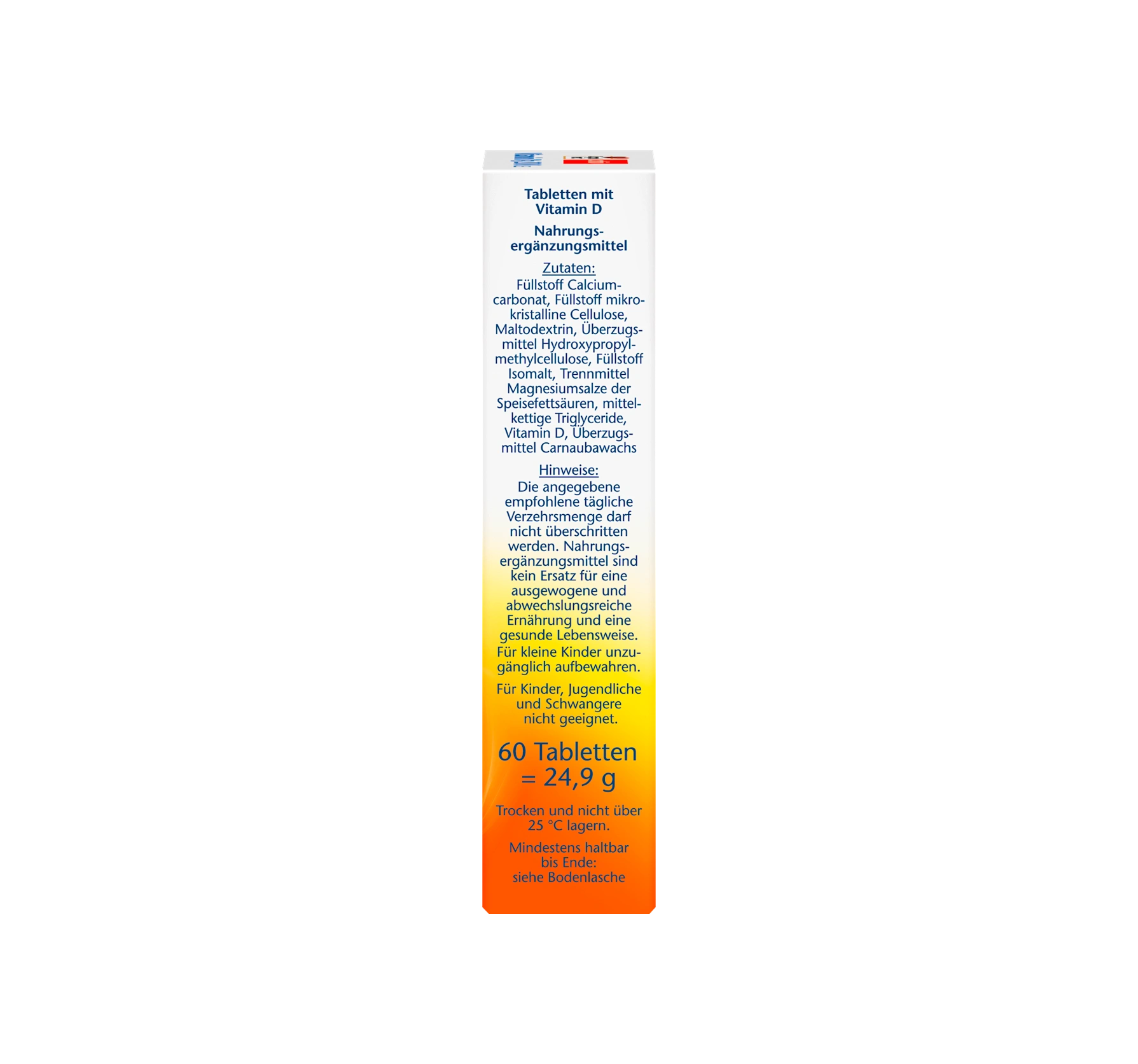EXACT PRODUCT NAME: TABLETS WITH VITAMIN D FOOD SUPPLEMENT INGREDIENTS: FILLER CALCIUM CARBONATE, FILLER MICROCRYSTALLINE CELLULOSE, MALTODEXTRIN, GLAZING AGENT HYDROXYPROPYLMETHYLCELLULOSE, FILLER ISOMALT, ANTI-CAKING AGENT MAGNESIUM SALTS OF FATTY ACIDS, MEDIUM-CHAIN TRIGLYCERIDES, CHOLECALCIFEROL, GLAZING AGENT CARNAUBA WAX PLEASE NOTE THE INFORMATION ON ALLERGENS.