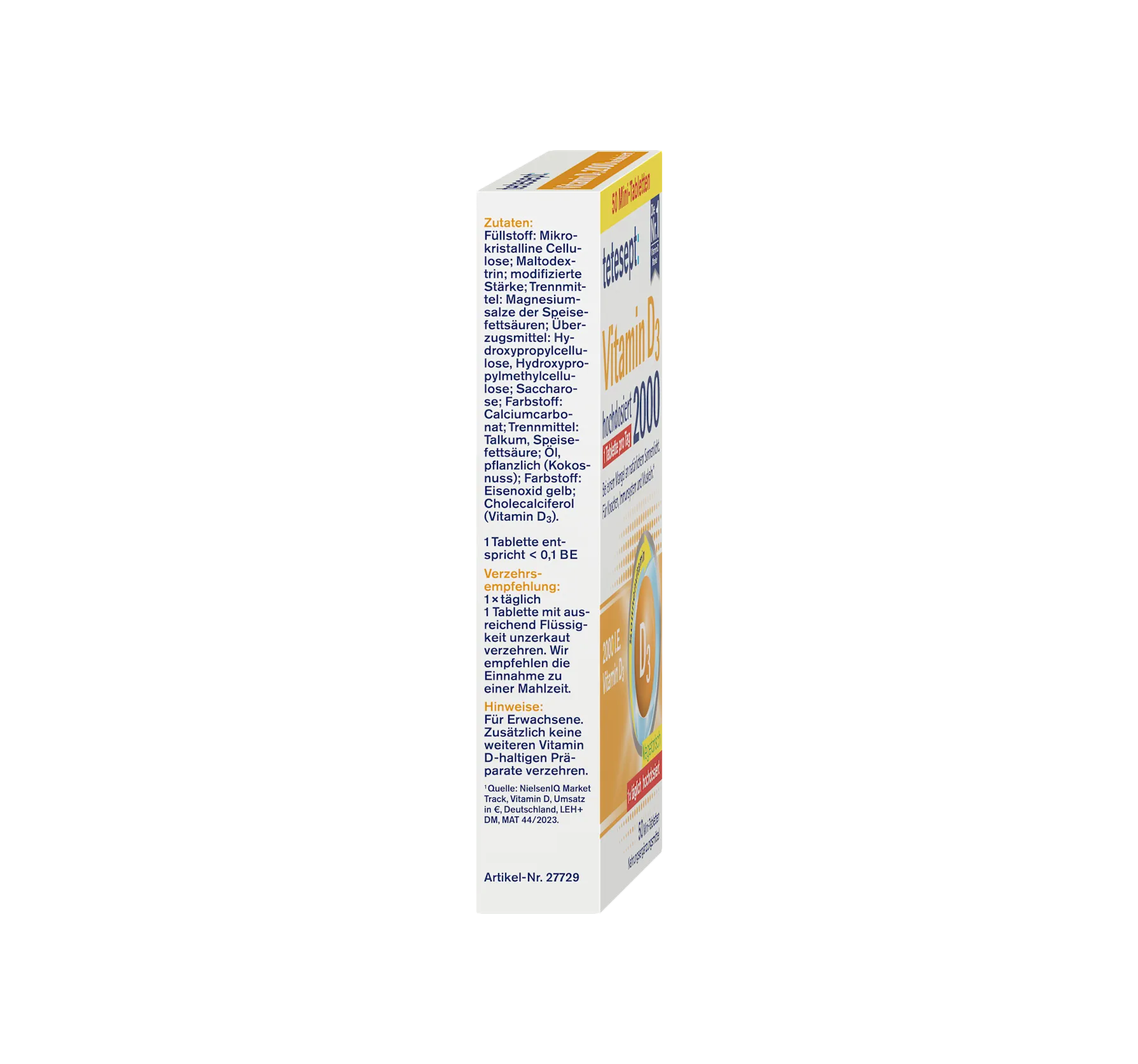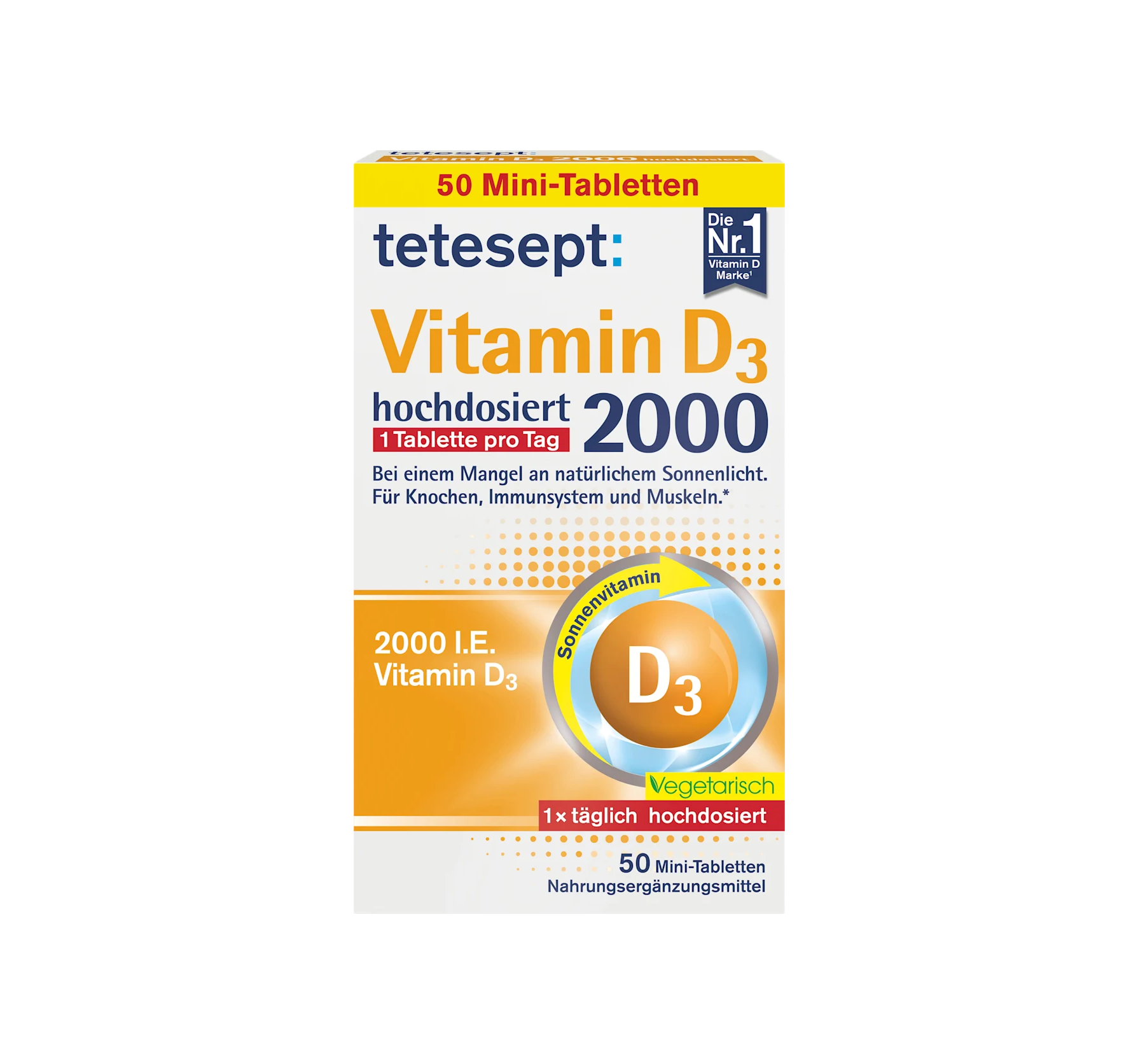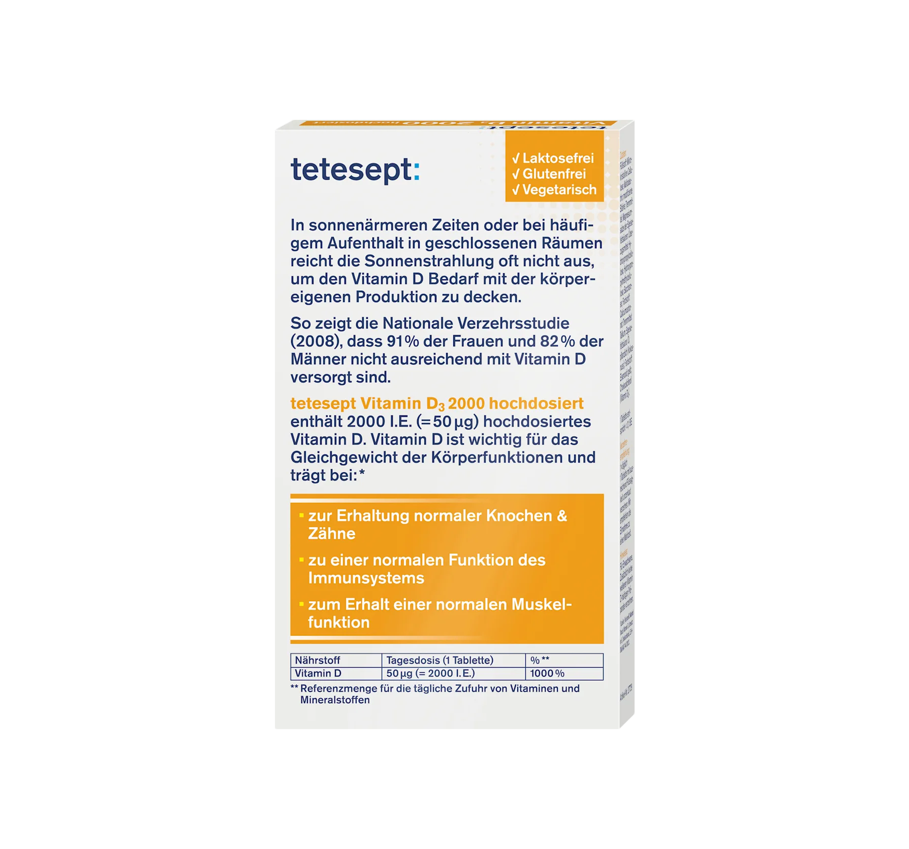 tetesept Vitamin D3 tablets contain a high dose of vitamin D3. This ensures the normal function of the immune system, the maintenance of normal muscle function and normal bones, and the maintena...