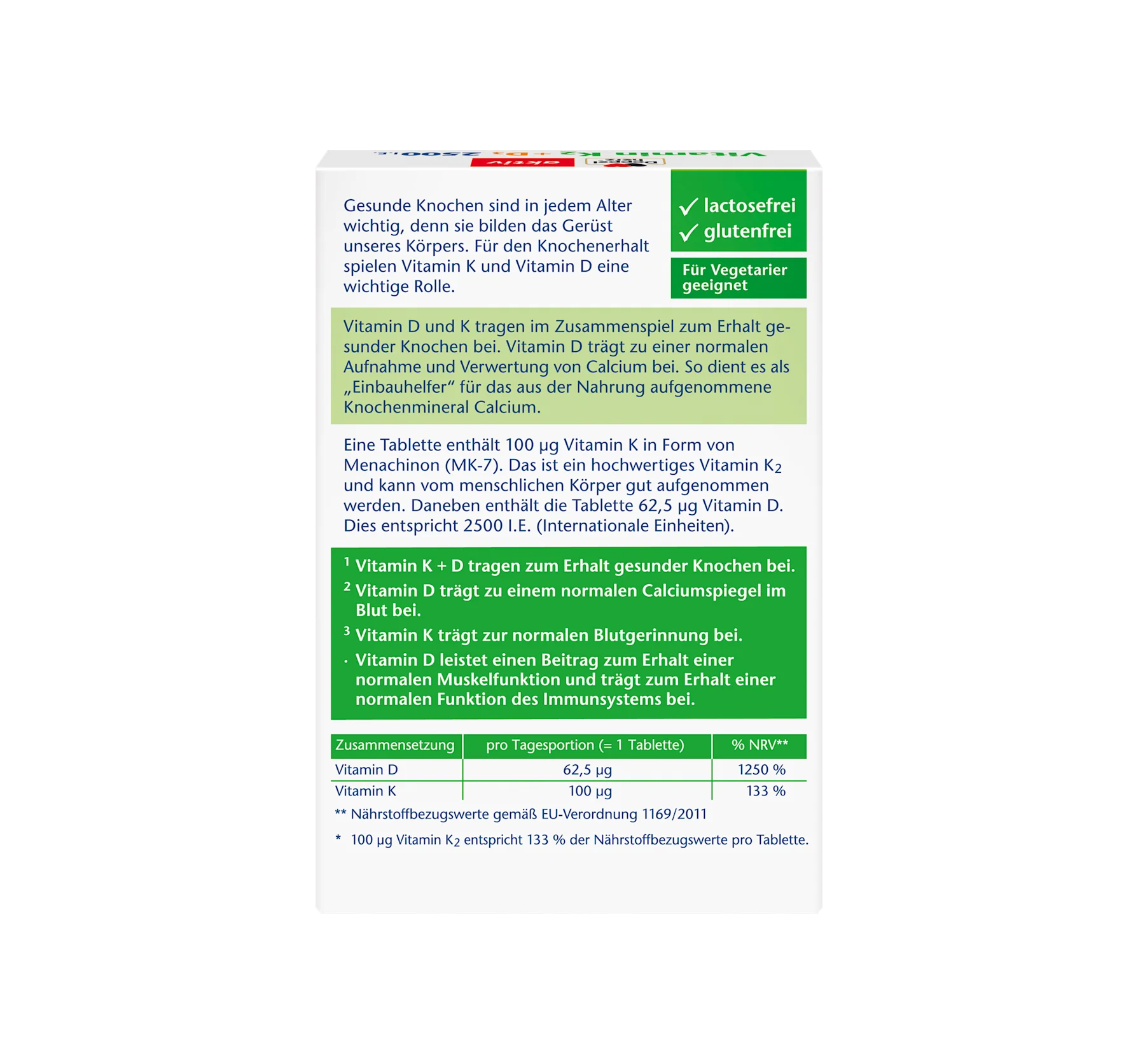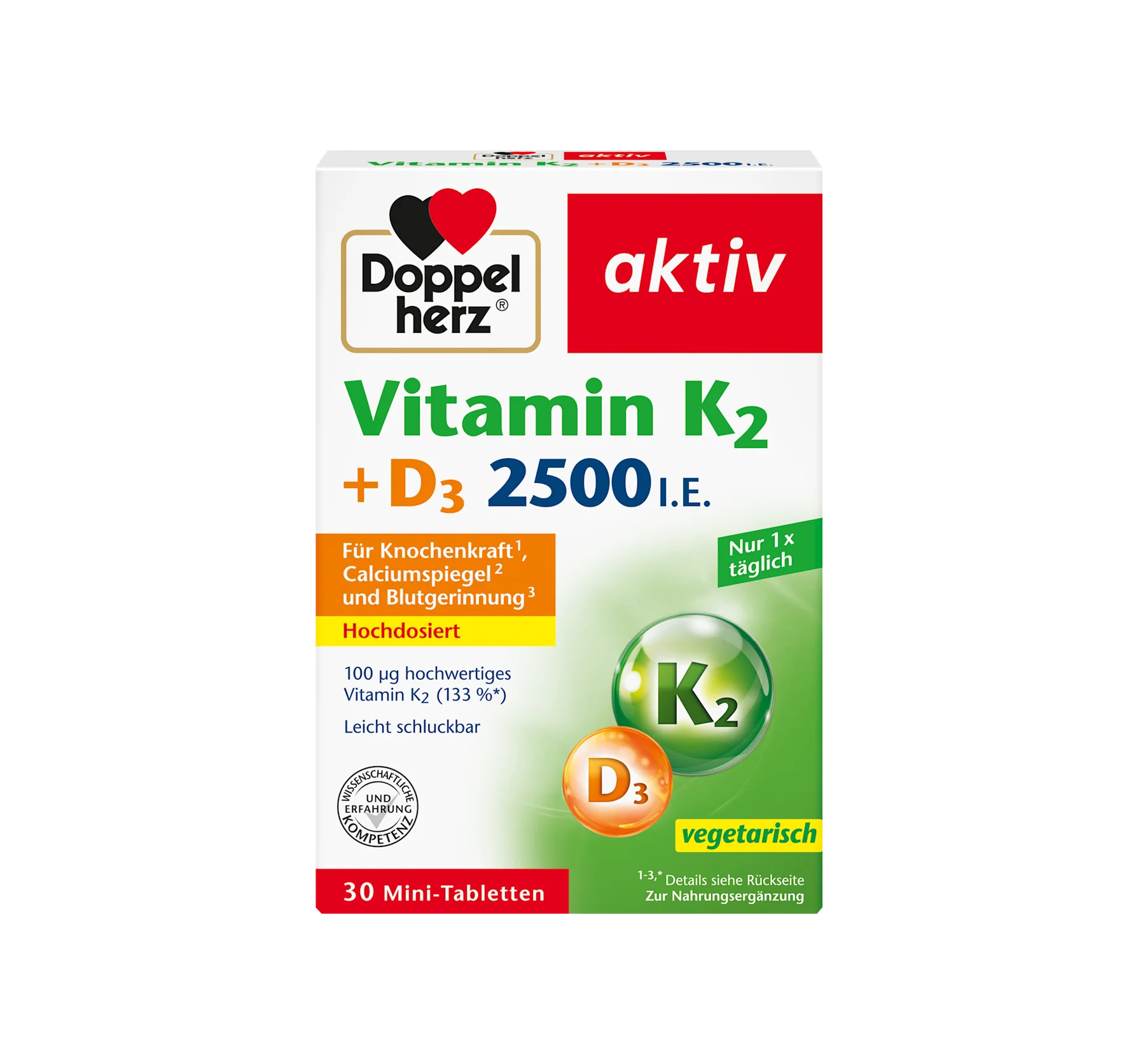 Doppelherz's Vitamin K2 + D3 2500 IU tablets can contribute to the maintenance of normal bones with the help of vitamins K and D. Vitamin K can also help maintain normal blood clotting. Vitamin ...