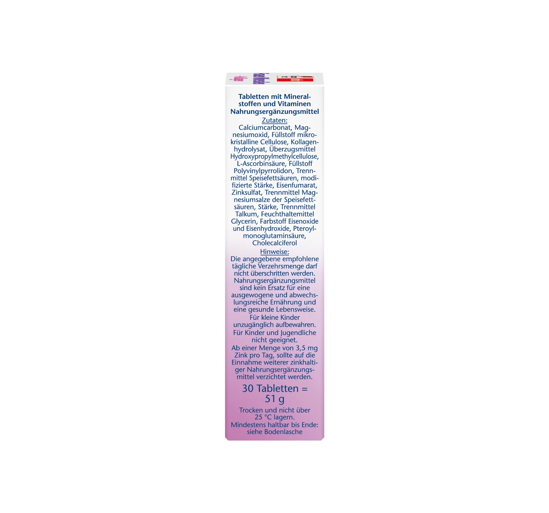 EXACT PRODUCT NAME: FOOD SUPPLEMENT TABLETS WITH MINERALS AND VITAMINS INGREDIENTS: CALCIUM CARBONATE, MAGNESIUM OXIDE, FILLER MICROCRYSTALLINE CELLULOSE, COLLAGEN HYDROLYSATE, GLAZING AGENT HYDROXYPROPYLMETHYLCELLULOSE, VITAMIN C, FILLER POLYVINYLPYRROLIDONE, ANTI-CAKING AGENT FATTY ACIDS, MODIFIED STARCH, IRON FUMARATE, ZINC SULFATE, ANTI-CAKING AGENT MAGNESIUM SALTS OF FATTY ACIDS, STARCH, ANTI-CAKING AGENT TALC, HUMECTANT GLYCEROL, COLOR IRON OXIDES AND IRON HYDROXIDES, FOLIC ACID, VITAMIN D PLEASE NOTE THE INFORMATION ON ALLERGENS.