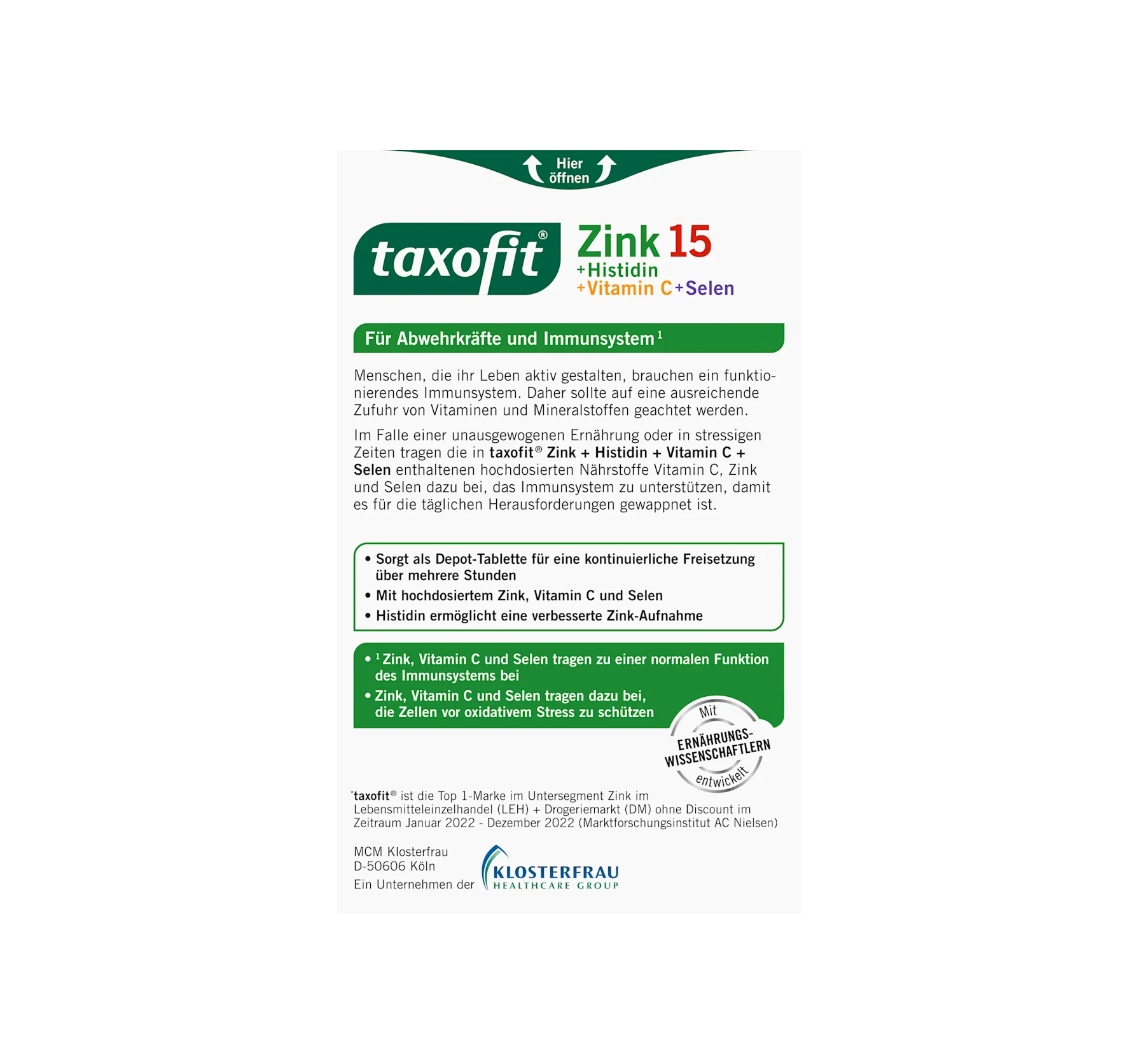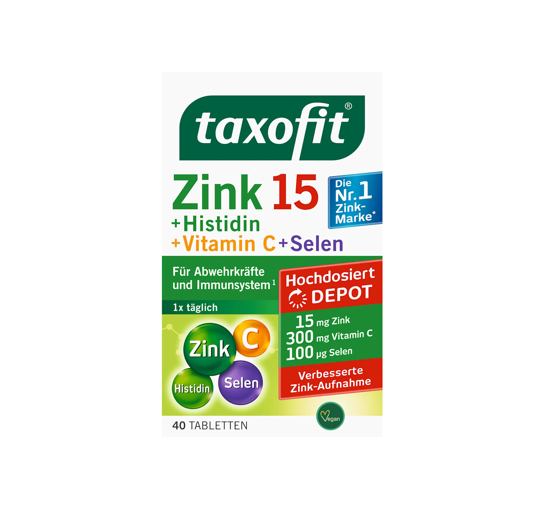 In the case of a balanced diet or during stressful times, the high-dose nutrients vitamin C, zinc, and selenium contained in taxofit Zinc + Histidine + Vitamin C + Selenium tablets help support ...