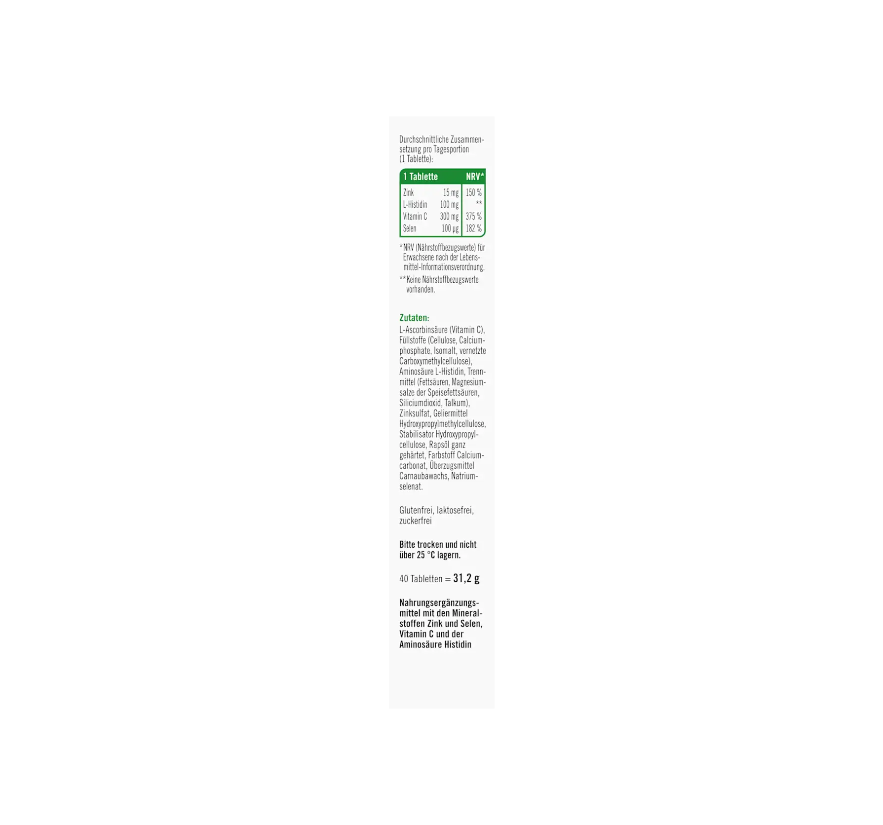 EXACT PRODUCT NAME: DIETARY SUPPLEMENT WITH THE MINERALS ZINC AND SELENIUM, VITAMIN C, AND THE AMINO ACID HISTIDINE. INGREDIENTS: L-ASCORBIC ACID (VITAMIN C), FILLERS (CELLULOSE, CALCIUM PHOSPHATES, ISOMALT, CROSS-LINKED CARBOXYMETHYLCELLULOSE), AMINO ACID L-HISTIDINE, ANTI-CAKING AGENTS (FATTY ACIDS, MAGNESIUM SALTS OF FATTY ACIDS, SILICON DIOXIDE, TALC), ZINC SULFATE, GELLING AGENT HYDROXYPROPYLMETHYLCELLULOSE, STABILIZER HYDROXYPROPYLCELLULOSE, FULLY HYDROGENATED RAPESEED OIL, COLORANT CALCIUM CARBONATE, GLAZING AGENT CARNAUBA WAX, SODIUM SELENATE. PLEASE NOTE THE ALLERGEN INFORMATION.
