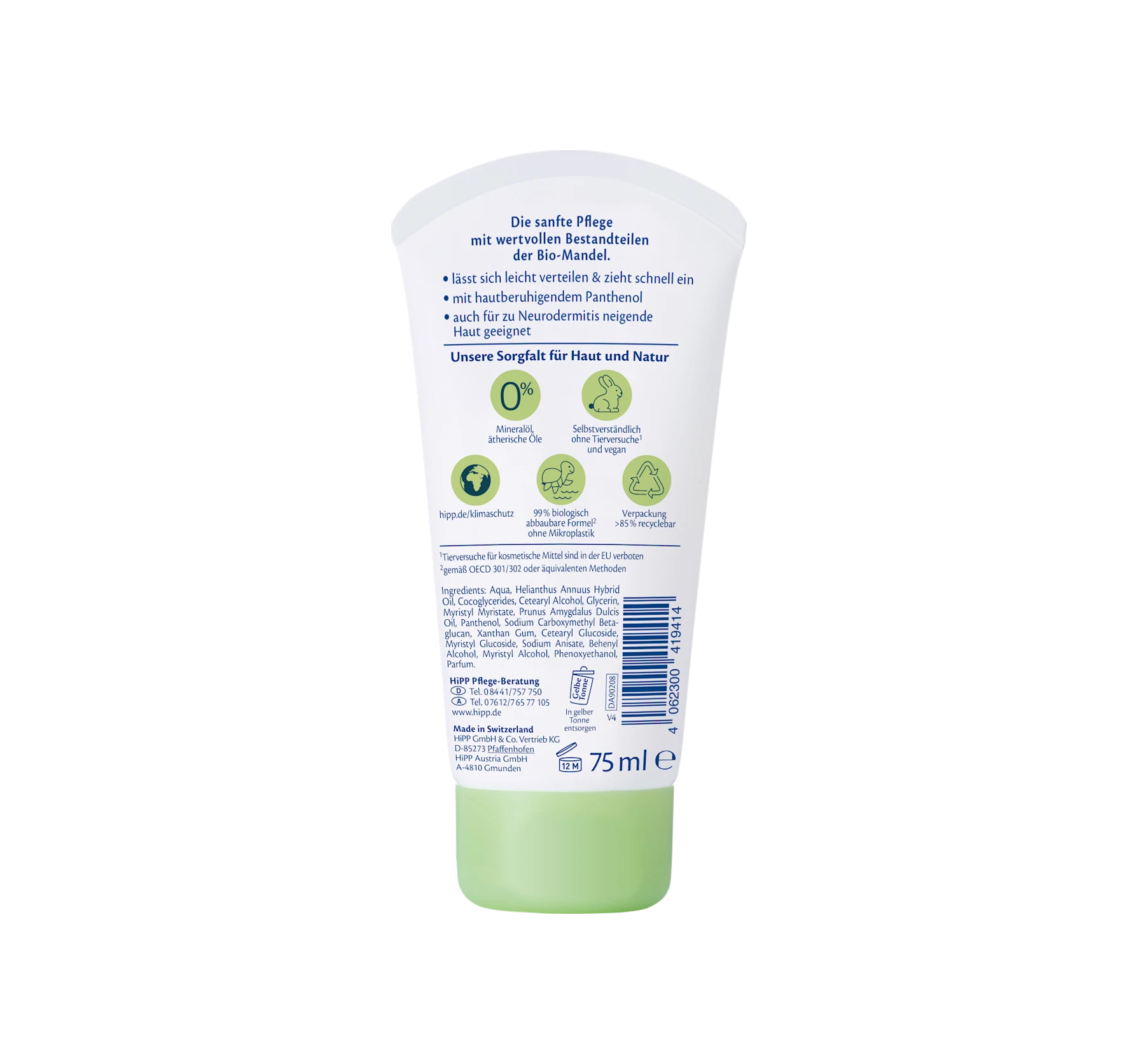 La crema de cuidado suave HiPP Babysanft con aceite de almendras orgánico protege la delicada piel del rostro y el cuerpo desde el primer día de vida. Se extiende fácilmente y se absorbe rápidam...