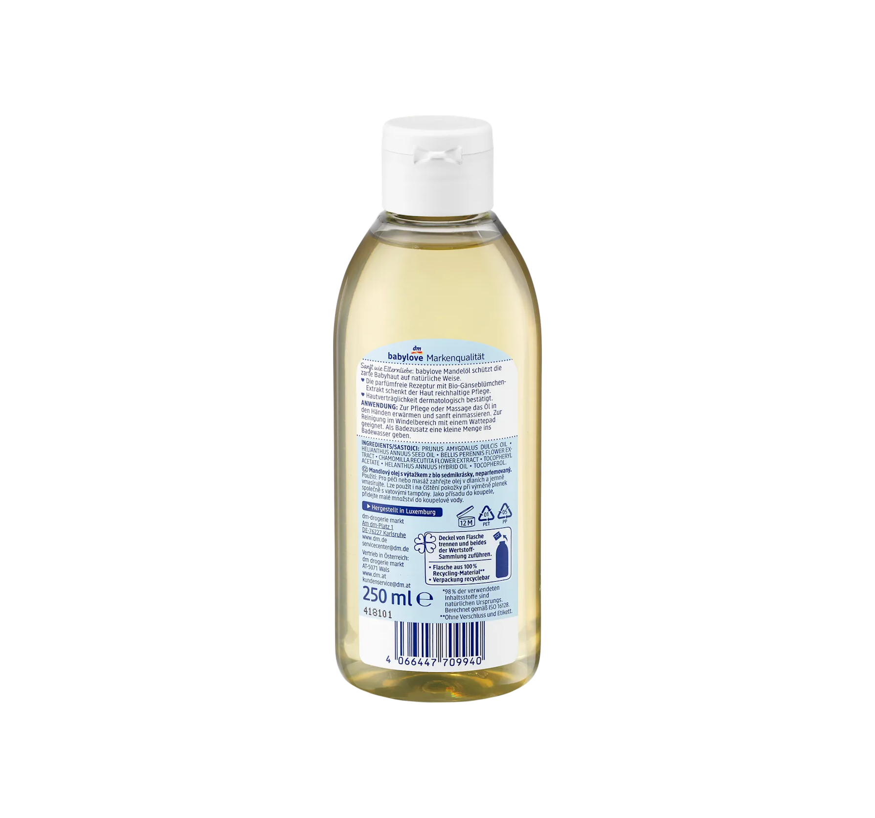 El aceite de almendras Babylove Nature protege de forma natural la delicada piel del bebé. Su fórmula sin perfume con extracto orgánico de margarita proporciona un cuidado enriquecido. Además, c...