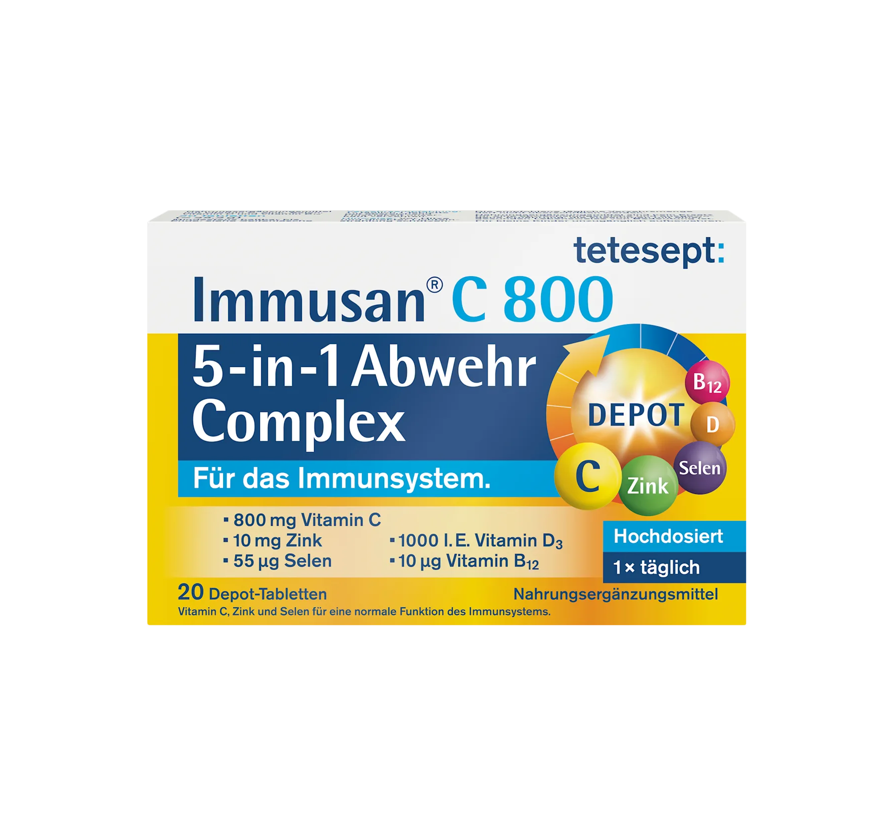 Los comprimidos tetesept Immusan C 800 Depot Complex refuerzan el sistema inmunitario y las defensas del organismo. Contienen los nutrientes necesarios en dosis especialmente altas. Además de 80...