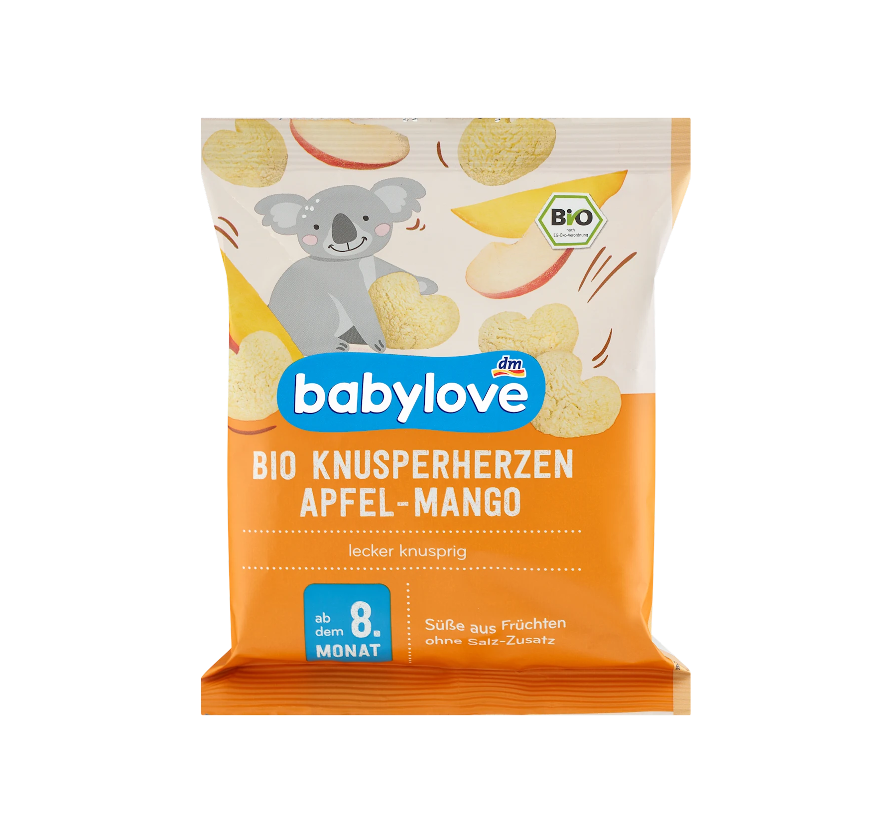 Fondants. Sans sucres ajoutés (les ingrédients contiennent naturellement du sucre) ni sel. Sans gluten. Biologiques. Les cœurs croquants pomme-mangue-maïs de babylove pour enfants à partir de 8 mois ont un goût délicieusement fruité et sont particulièrement faciles à mâcher pour les bébés. Ils conviennent parfaitement aux entre-repas et aux déplacements. Ils sont également parfaits comme en-cas croquant pour les adultes. Référence dm : 1588111. GTIN : 4066447349801