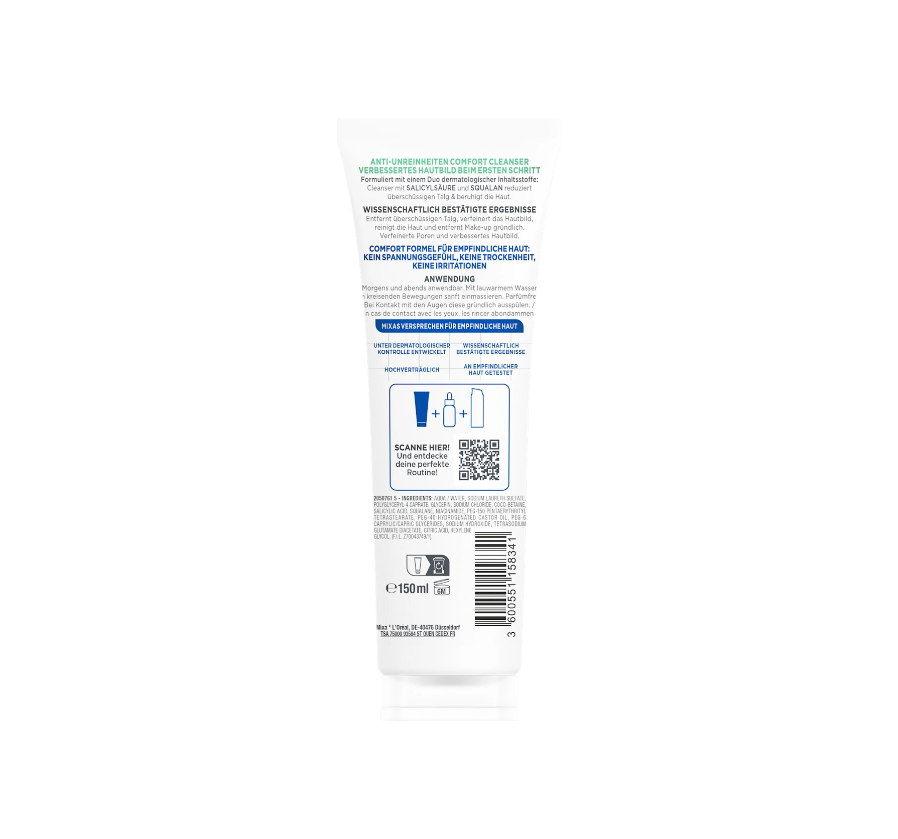 Nettoyez délicatement votre visage des impuretés, du sébum et du maquillage avec le Nettoyant Confort Anti-Imperfections. Déposez une petite quantité de gel nettoyant dans la paume de votre main et appliquez sur le visage humide. Faites mousser en effectuant de légers mouvements circulaires et massez en évitant le contour des yeux. Rincez et séchez soigneusement votre visage. Vous pouvez ensuite compléter votre routine de soins quotidienne avec le Sérum Anti-Imperfections et la Crème Anti-Imperfections.
