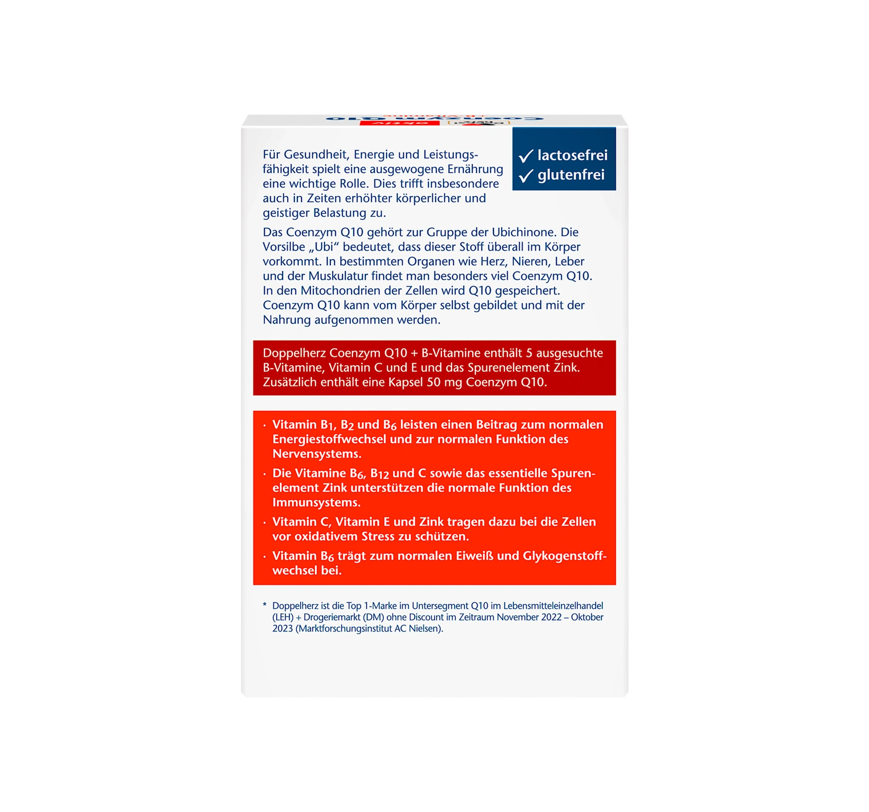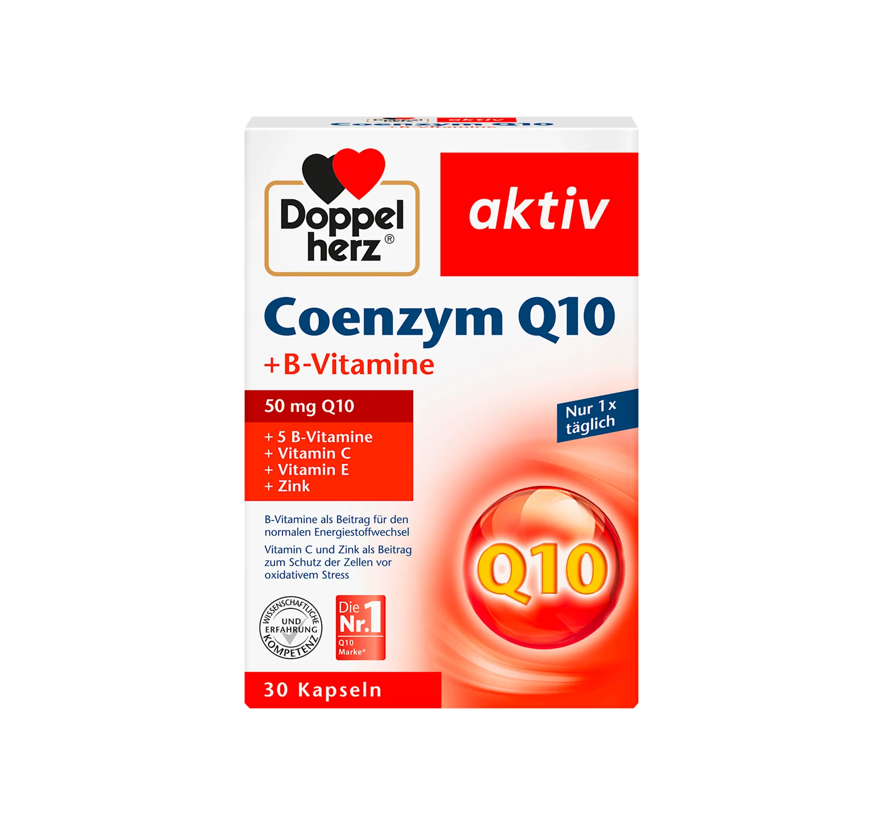Le produit sans lactose et sans gluten Doppelherz active Coenzyme Q10 contient des vitamines B ainsi que de la vitamine C ...