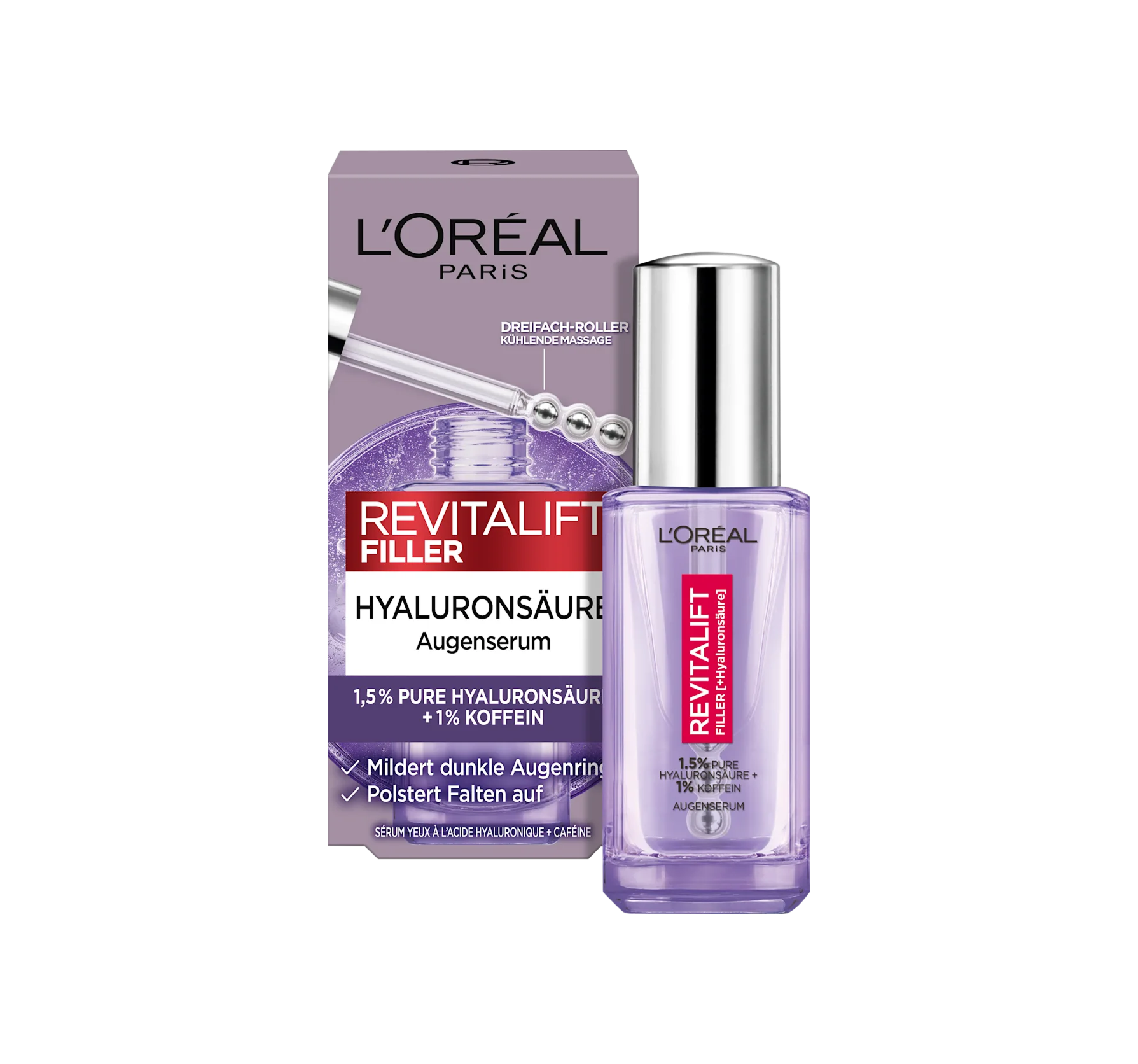 Le sérum contour des yeux Revitalift Filler Hyaluron de L'Oréal Paris, à 2,5 % (acide hyaluronique + caféine), comble les rides du contour de l'œil et atténue les cernes. Notre formule innovante...