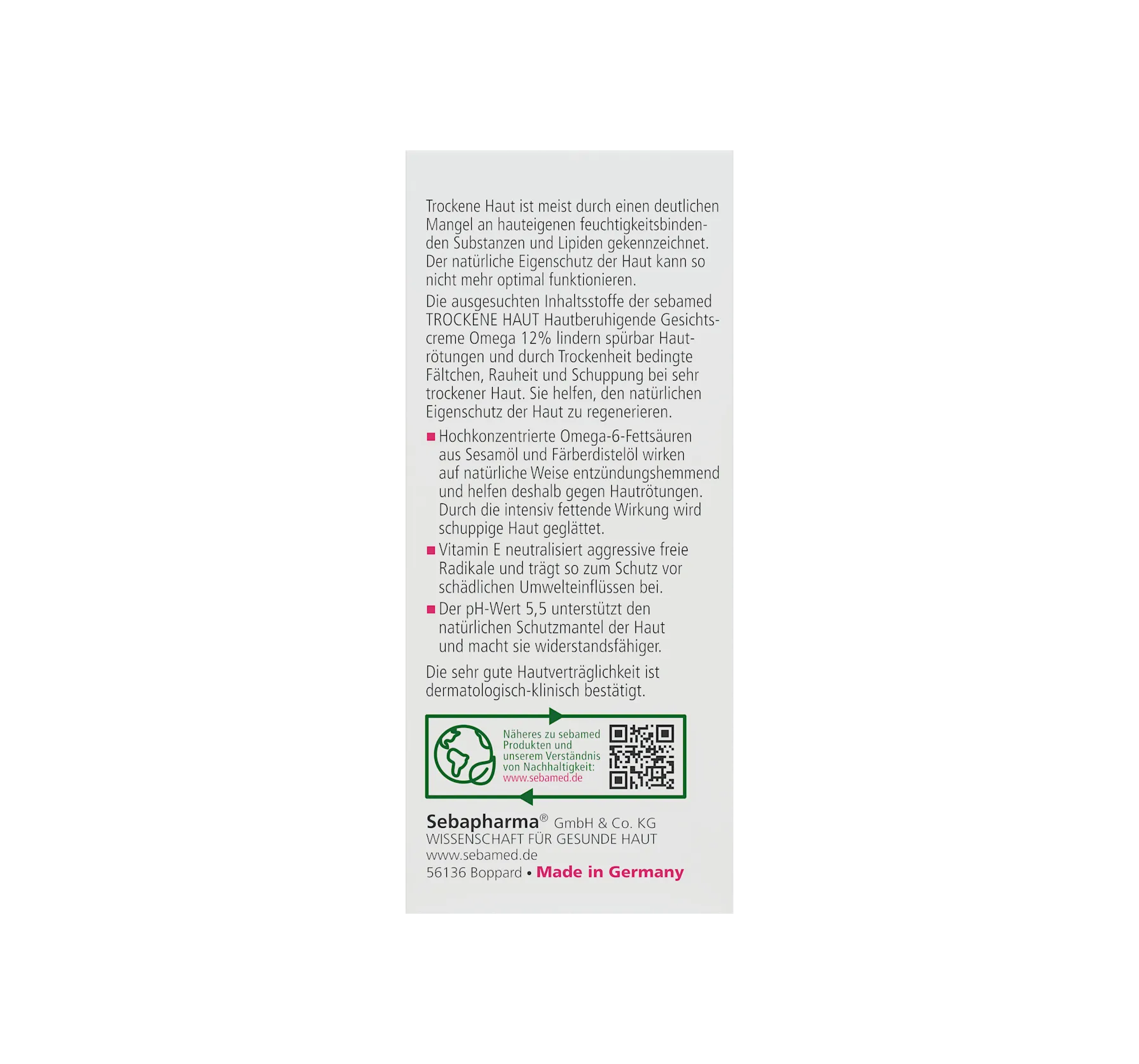 Cliniquement prouvée, la crème Sebamed Peau Sèche Oméga 12 % au pH de 5,5 soulage efficacement la sécheresse et les rougeurs, et réduit la rugosité et la desquamation. Elle est exempte de colora...