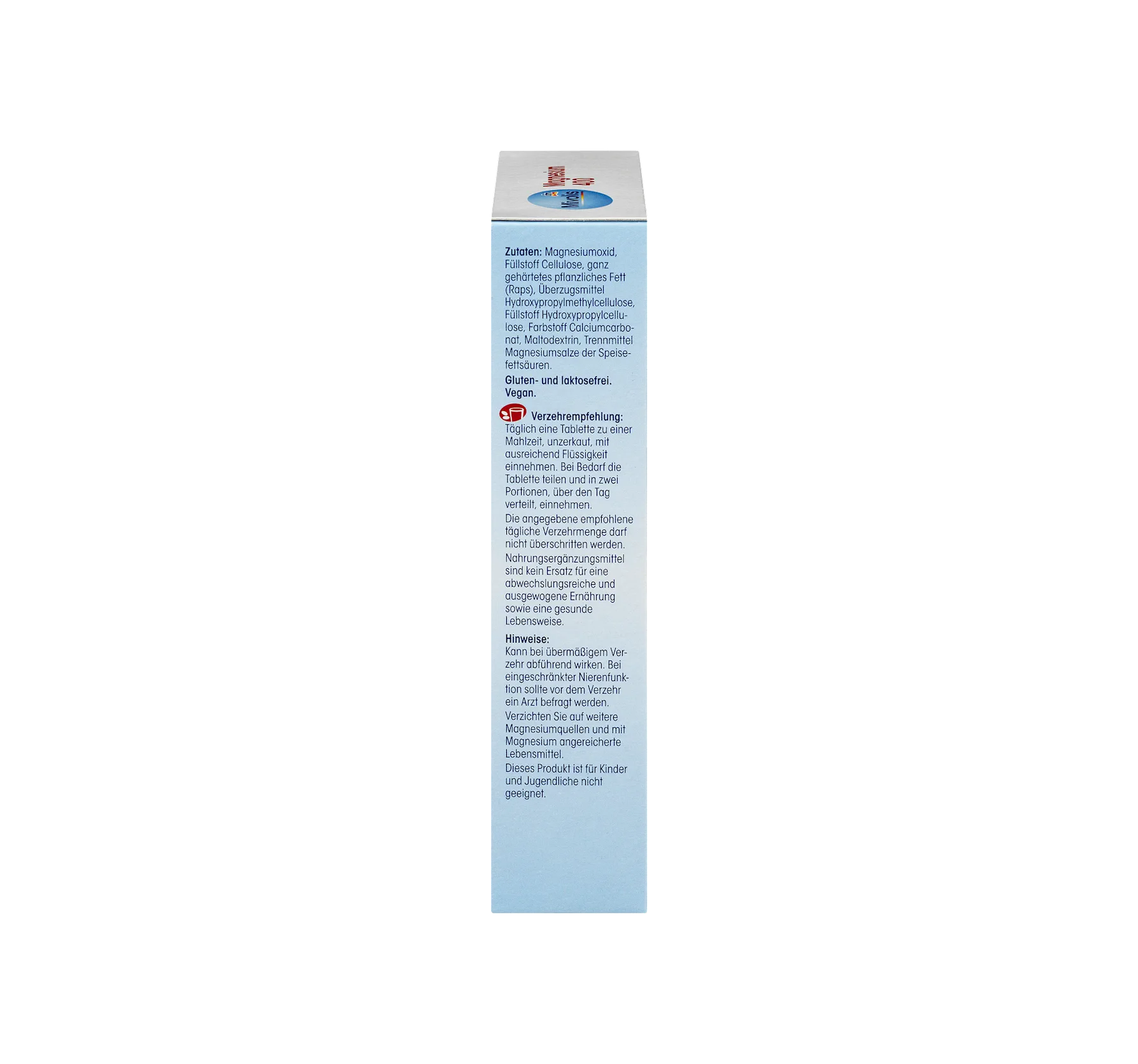 L'apport journalier recommandé ne doit pas être dépassé. Les compléments alimentaires ne se substituent pas à une alimentation variée et équilibrée et à un mode de vie sain. Une consommation excessive peut avoir un effet laxatif. En cas d'insuffisance rénale, consultez un médecin avant toute consommation. Évitez les autres sources de magnésium et les aliments enrichis en magnésium. Ce produit ne convient pas aux enfants et aux adolescents. Prendre un comprimé par jour au cours d'un repas, non croqué, avec suffisamment de liquide. Si nécessaire, diviser le comprimé en deux prises réparties sur la journée.