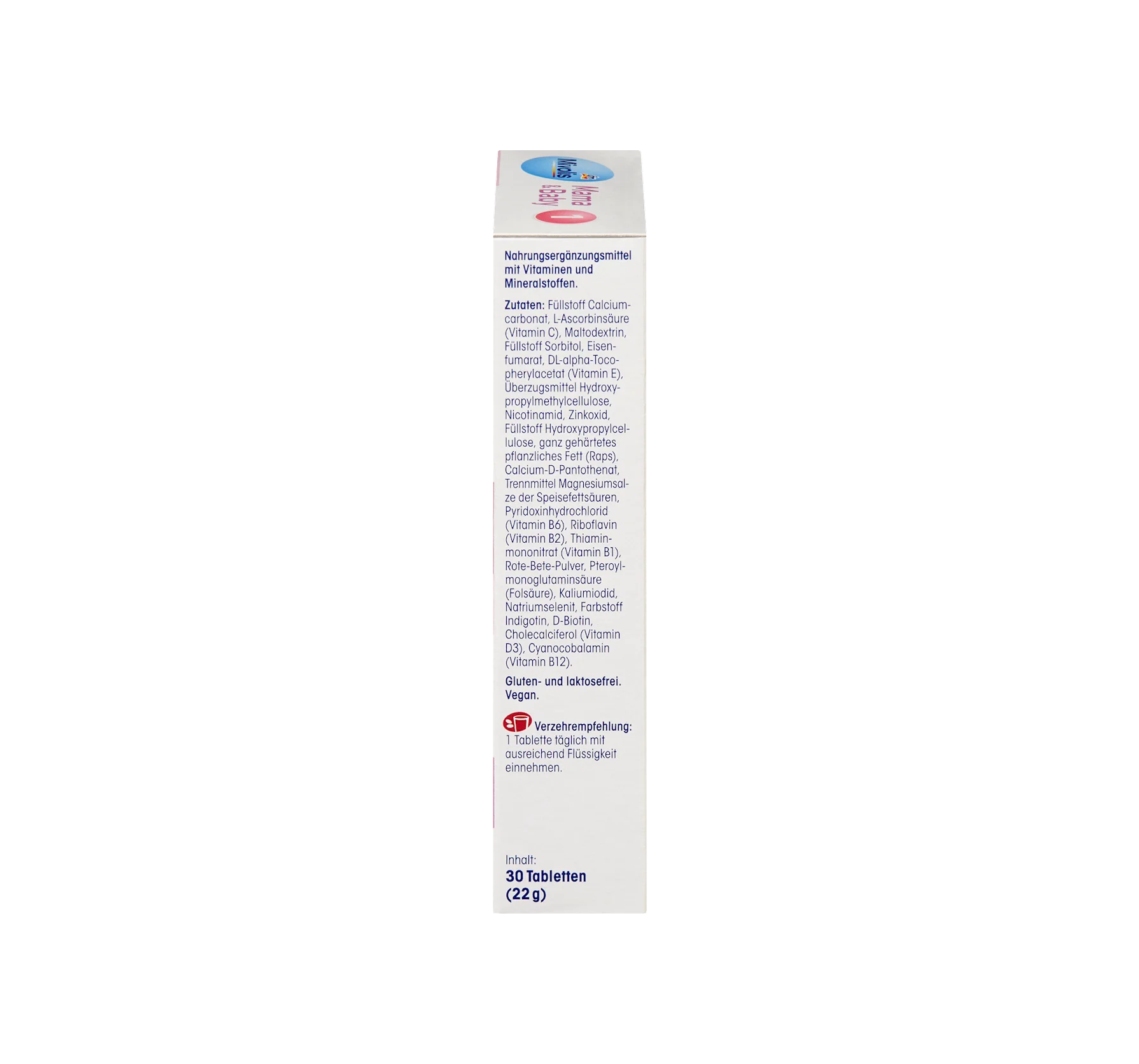 NOM EXACT DU PRODUIT : COMPLÉMENT ALIMENTAIRE AVEC VITAMINES ET MINÉRAUX. AGENT DE CHARGE : CARBONATE DE CALCIUM, ACIDE L-ASCORBIQUE (VITAMINE C), MALTODEXTRINE, AGENT DE CHARGE : SORBITOL, FUMARATE FERREUX, ACÉTATE DE DL-ALPHA-TOCOPHÉRYLE (VITAMINE E), AGENT D'ENROBAGE : HYDROXYPROPYLMÉTHYLCELLULOSE, NICOTINAMIDE, OXYDE DE ZINC, AGENT DE CHARGE : HYDROXYPROPYLCELLULOSE, MATIÈRE GRASSE VÉGÉTALE ENTIÈREMENT HYDROGÉNÉE (COLORAMIQUE), D-PANTOTHÉNATE DE CALCIUM, ANTIAGGLOMÉRANT : SELS DE MAGNÉSIUM D'ACIDES GRAS, CHLORHYDRATE DE PYRIDOXINE (VITAMINE B6), RIBOFLAVINE (VITAMINE B2), MONONITRATE DE THIAMINE (VITAMINE B1), POUDRE DE BETTERAVE, ACIDE PTÉROYLMONOGLUTAMIQUE (ACIDE FOLIQUE), IODURE DE POTASSIUM, SÉLÉNITE DE SODIUM, COLORANT : INDIGOTINE, D-BIOTINE, CHOLÉCALCIFÉROL (VITAMINE D3), CYANOCOBALAMINE (VITAMINE B12).