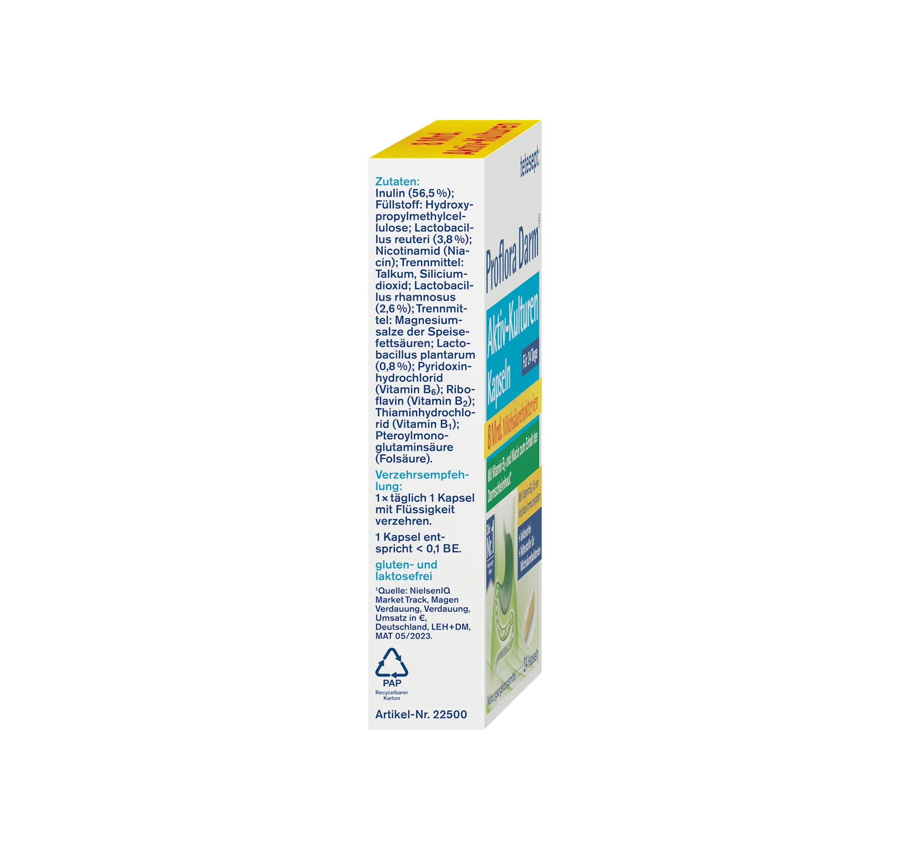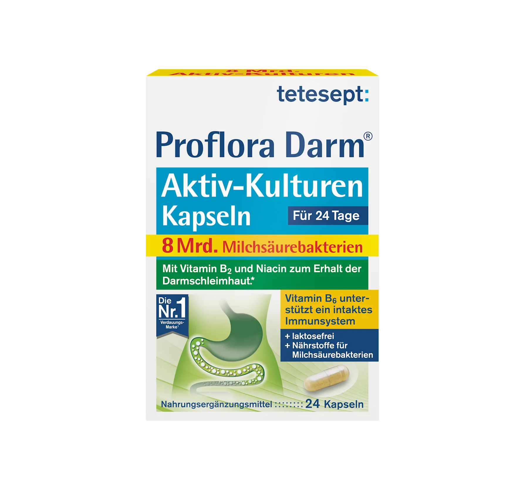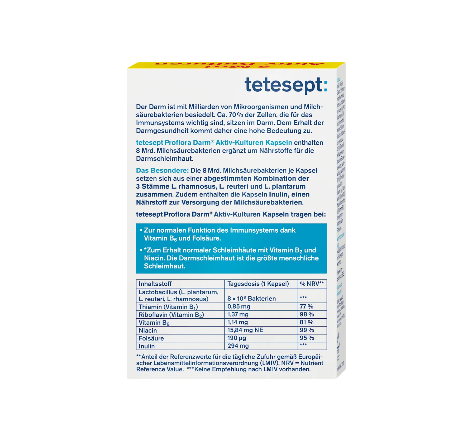 Les capsules de cultures intestinales actives Proflora sans lactose de Tetesept contiennent de la vitamine B2, qui contribue au maintien de muqueuses normales, notamment intestinales. La vitamin...