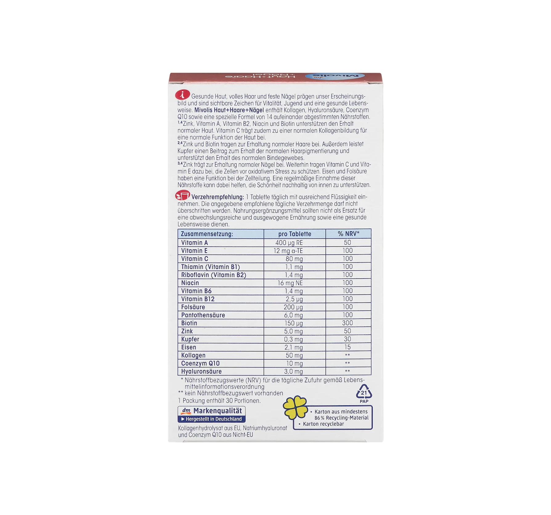 Mivolis Skin+Hair+Nails contient du collagène, de l'acide hyaluronique, de la coenzyme Q10 et une formule spéciale de 14 nutriments coordonnés. Le zinc, la vitamine A, la vitamine B2, la niacine...