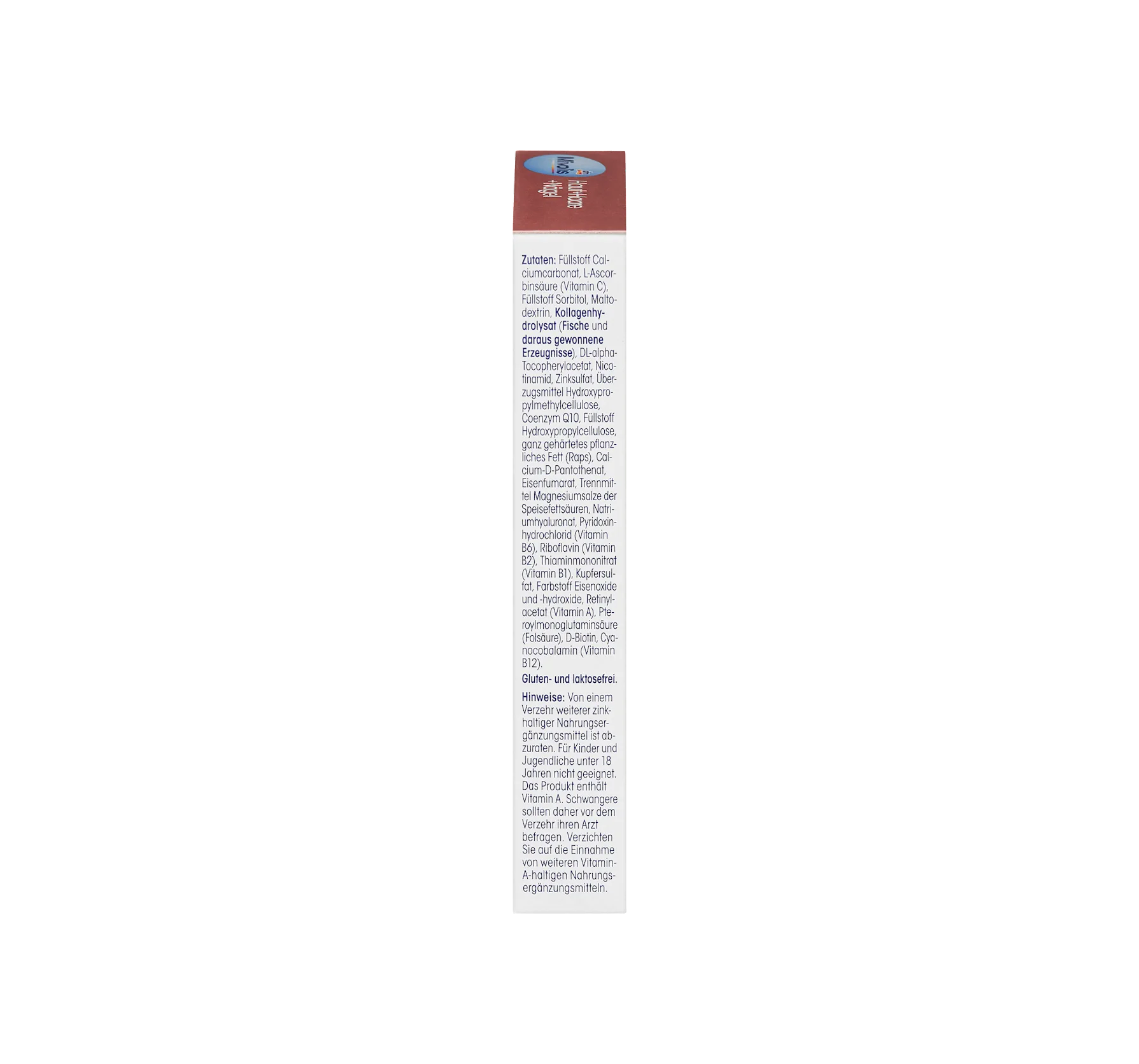 EXACT PRODUCT NAME: FOOD SUPPLEMENT WITH VITAMINS, MINERALS, HYALURONIC ACID, COLLAGEN AND COENZYME Q10. FILLER: CALCIUM CARBONATE, L-ASCORBIC ACID (VITAMIN C), FILLER: SORBITOL, MALTODEXTRIN, COLLAGEN HYDROLYSATE (FISH AND PRODUCTS DERIVED THEREFROM), DL-ALPHA TOCOPHERYL ACETATE, NICOTINAMIDE, ZINC SULFATE, GLAZING AGENT: HYDROXYPROPYLMETHYLCELLULOSE, COENZYME Q10, FILLER: HYDROXYPROPYLCELLULOSE, FULLY HYDROGENATED VEGETABLE FAT (RAPESEED), CALCIUM D-PANTOTHENATE, IRON FUMARATE, ANTI-CAKING AGENT: MAGNESIUM SALTS OF FATTY ACIDS, SODIUM HYALURONATE, PYRIDOXINE HYDROCHLORIDE (VITAMIN B6), RIBOFLAVIN (VITAMIN B2), THIAMINE MONONITRATE (VITAMIN B1), COPPER SULFATE, COLOR: IRON OXIDES AND HYDROXIDES, RETINYL ACETATE (VITAMIN A), PTEROYLMONOGLUTAMIC ACID (FOLIC ACID), D-BIOTIN, CYANOCOBALAMIN. (VITAMIN B12). PLEASE NOTE THE ALLERGEN INFORMATION.