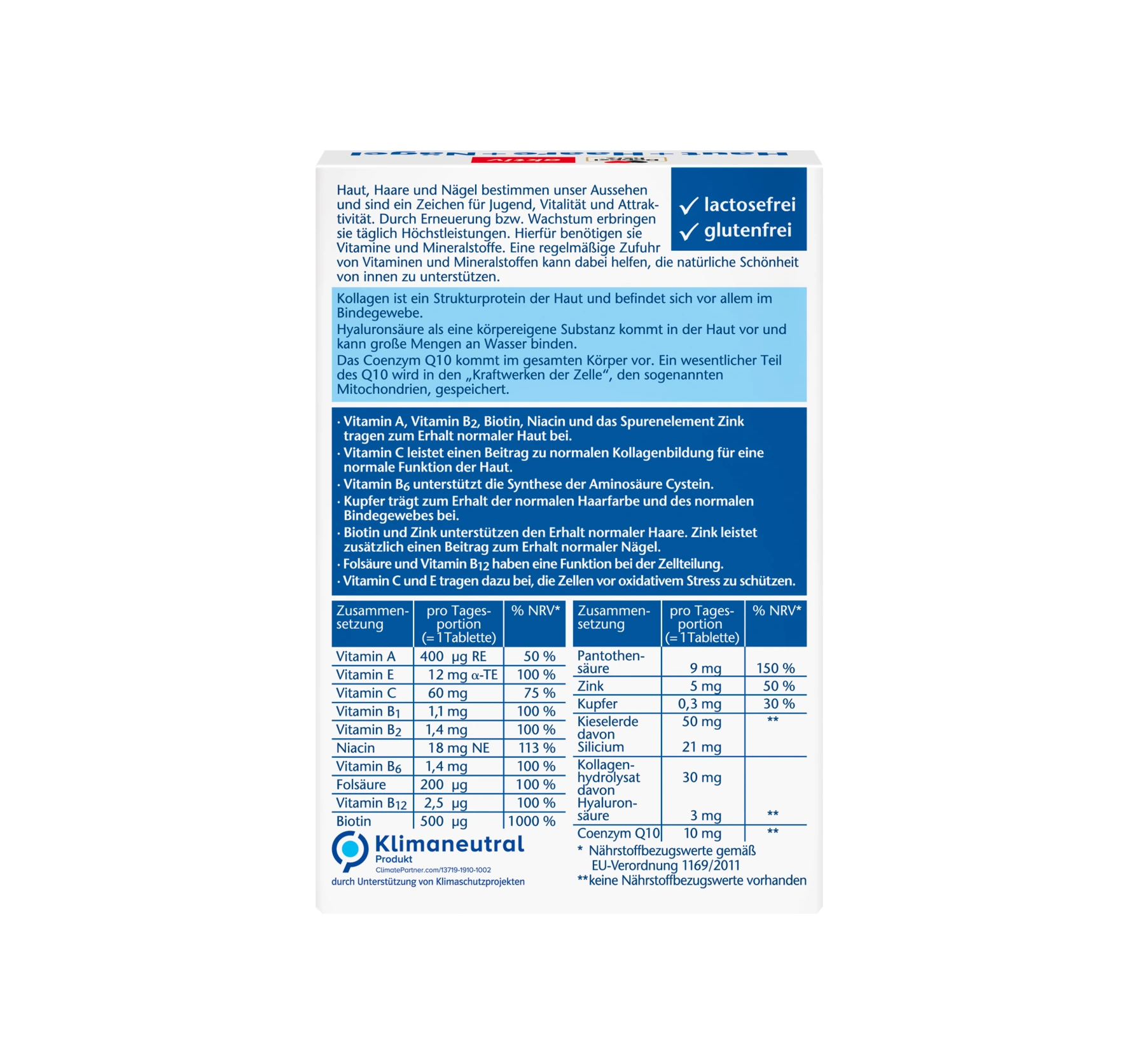 NOM EXACT DU PRODUIT : COMPLÉMENTS DE COMPLÉMENT ALIMENTAIRE AVEC SILICE, HYDROLYSAT DE COLLAGÈNE, COENZYME Q10, MINÉRAUX ET VITAMINES INGRÉDIENTS : AGENT DE REMPLISSAGE CELLULOSE MICROCRISTALLINE, ACIDE L-ASCORBIQUE, SILICE, HYDROLYSAT DE COLLAGÈNE CONTENANT DE L'ACIDE HYALURONIQUE, NICOTINAMIDE, ACÉTATE DE DL-ALPHA-TOCOPHÉRYLE, POUDRE DE CELLULOSE DE REMPLISSAGE, AGENT DE REMPLISSAGE CARBOXYMÉTHYLCELLULOSE RÉTICULÉE, ANTIAGGLOMÉRANT DIOXYDE DE SILICIUM, AGENT D'ENROBAGE HYDROXYPROPYLMÉTHYLCELLULOSE, D-PANTOTHÉNATE DE CALCIUM, COENZYME Q10, ANTIAGGLOMÉRANT SELS DE MAGNÉSIUM D'ACIDES GRAS, OXYDE DE ZINC, ANTIAGGLOMÉRANT HYDROXYDE DE MAGNÉSIUM CARBONATE, AGENT ANTIAGGLOMÉRANT CARBONATE DE CALCIUM, CHARGE HYDROXYPROPYLCELLULOSE, AGENT ANTIAGGLOMÉRANT TALC, AGENT D'ENROBAGE POLYÉTHYLÈNE GLYCOL, CHLORHYDRATE DE PYRIDOXINE, RIBOFLAVINE, MONONITRATE DE THIAMINE, COLORANTS OXYDES DE FER ET HYDROXYDES DE FER, SULFATE DE CUIVRE, ACÉTATE DE RÉTINYLE, D-BIOTINE, ACIDE PTÉROYLMONOGLUTAMIQUE, CYANOCOBALAMINE VEUILLEZ NOTER LES INFORMATIONS SUR LES ALLERGÈNES.