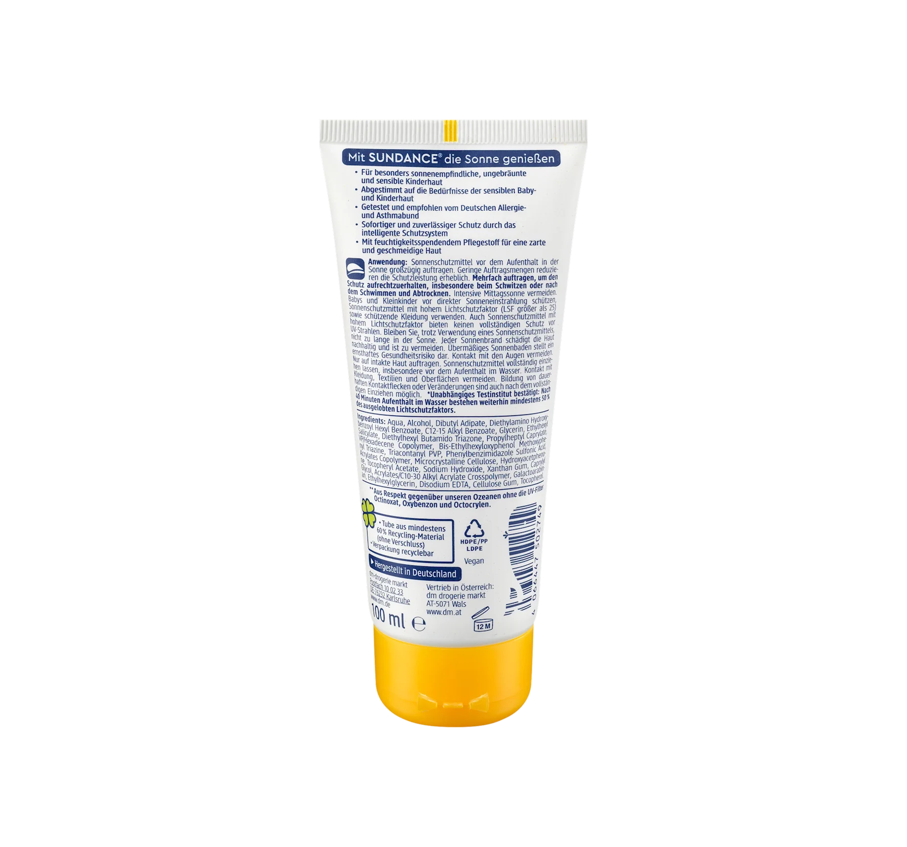Application : Appliquez généreusement de la crème solaire avant de vous exposer au soleil. Une application insuffisante réduira considérablement le niveau de protection. Renouvelez l’application pour maintenir la protection, surtout en cas de transpiration ou après vous être baigné et séché. Évitez le soleil intense de midi. Protégez les bébés et les jeunes enfants du soleil direct, utilisez une crème solaire à indice de protection élevé (SPF supérieur à 25) et portez des vêtements protecteurs. Même les crèmes solaires à indice de protection élevé n’offrent pas une protection complète contre les rayons UV. Ne restez pas trop longtemps au soleil, même avec une crème solaire. Tout coup de soleil peut endommager durablement la peau et doit être évité. La surexposition au soleil est un risque grave pour la santé. Évitez le contact avec les yeux. Appliquez uniquement sur une peau intacte. Laissez la crème solaire pénétrer complètement, surtout avant d’aller dans l’eau.