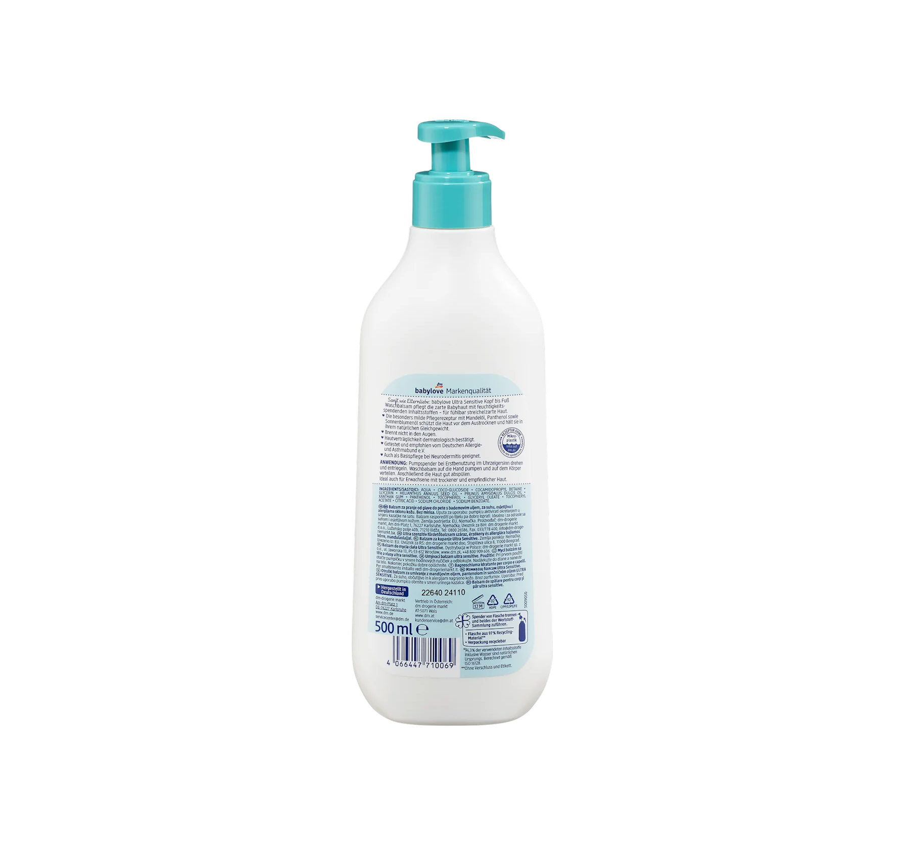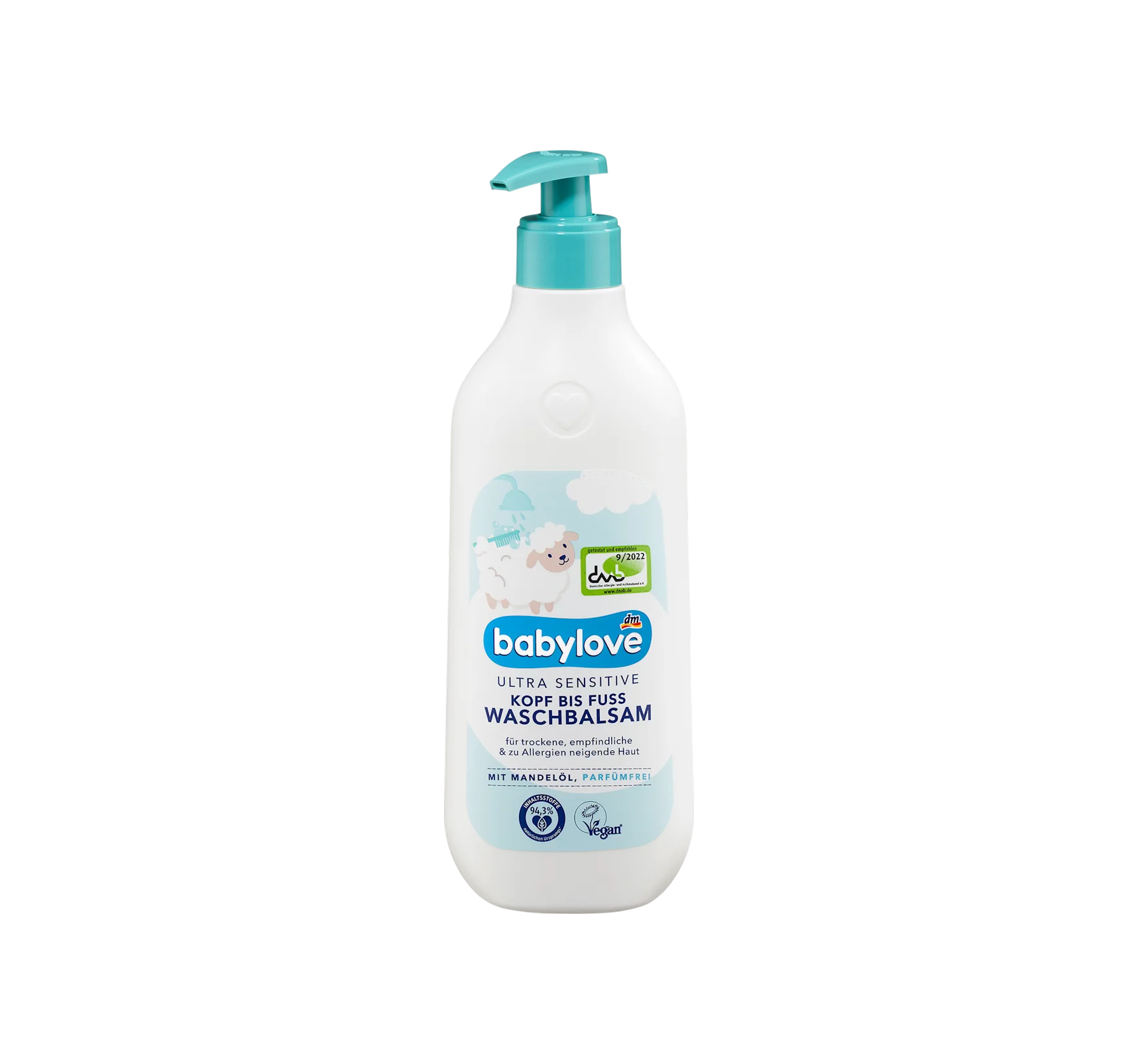 Le baume lavant babylove Ultra Sensitive de la tête aux pieds nourrit la peau délicate de bébé grâce à un tiers de lait corporel hydratant. Sa formule particulièrement douce à base d'huile d'ama...