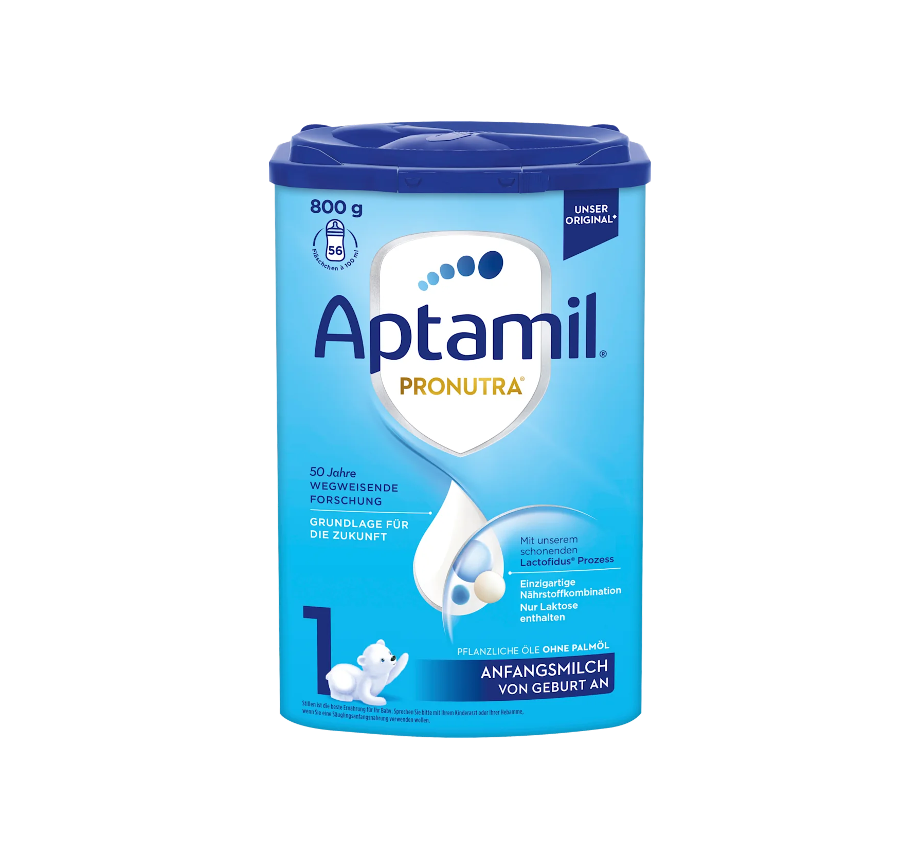 Aptamil Pronutra 1 可以从出生开始作为唯一食物或补充剂喂养。与母乳一样,可以根据宝宝的需要随时喂食。适用于直到奶瓶喂养结束。打开的包装应在四周内用完。准备:准备 Aptamil® 1 时,请仔细遵循使用说明。不正确的准备和储存会导致有害细菌滋生,从而导致健康问题。每次喂奶前新鲜准备食物并立即喂食。请勿重复使用剩余的食物。彻底清洁奶瓶、奶嘴和奶嘴环。请勿在微波炉中加热奶粉(过热风险)。1. 将新鲜的煮沸饮用水冷却至约 40°C,然后将所需水量的 2/3 倒入奶瓶中。2. 为了准确计量奶粉,请使用附带的量匙刮平奶粉。只能使用附带的量匙。3. 将所需量的奶粉倒入奶瓶中。将量匙存放在勺架中。 4. 盖上瓶盖,垂直用力摇晃约10秒钟,加入剩余的饮用水,再次用力摇晃。5. 打开瓶盖,安装奶嘴。检查瓶内液体的饮用温度(约37°C)。