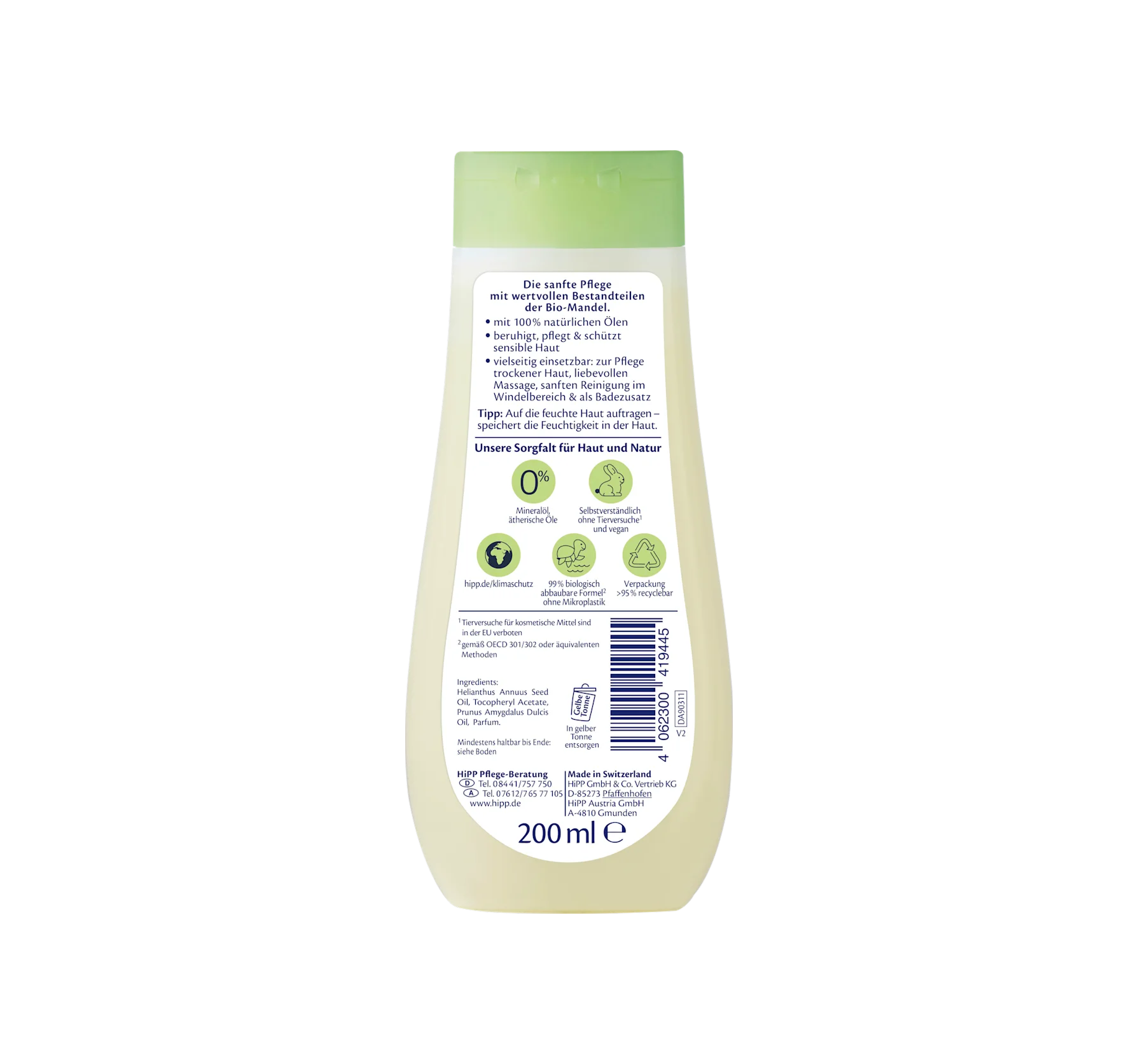 HiPP 婴儿沐浴油蕴含有机杏仁油和其他天然油脂,从宝宝出生第一天起即可温和滋养、舒缓并保护敏感肌肤。它用途广泛:可用于护理干性肌肤、进行爱抚按摩、温和清洁尿布区域,以及作为沐浴添加剂。小贴士:涂抹于湿润的肌肤上,有助于锁住水分。