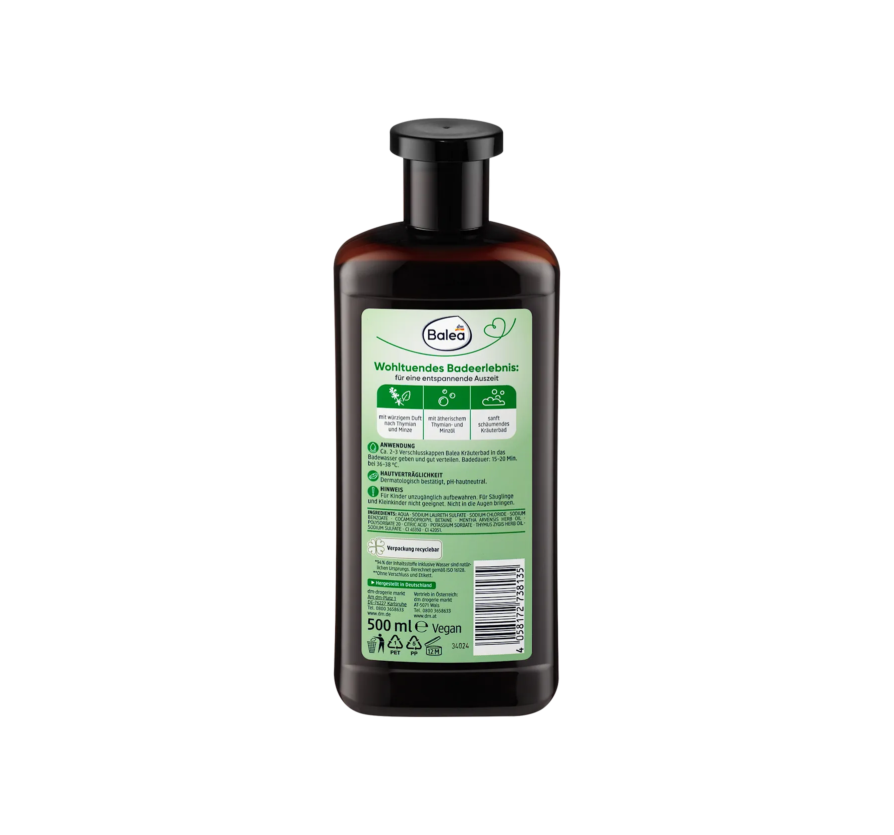 将约2-3瓶盖的Balea草本沐浴露加入洗澡水中,并充分混合。沐浴时间:15-20分钟,水温36-38°C。