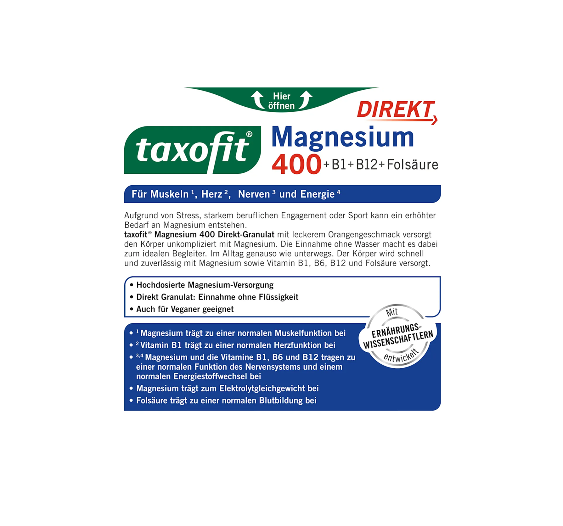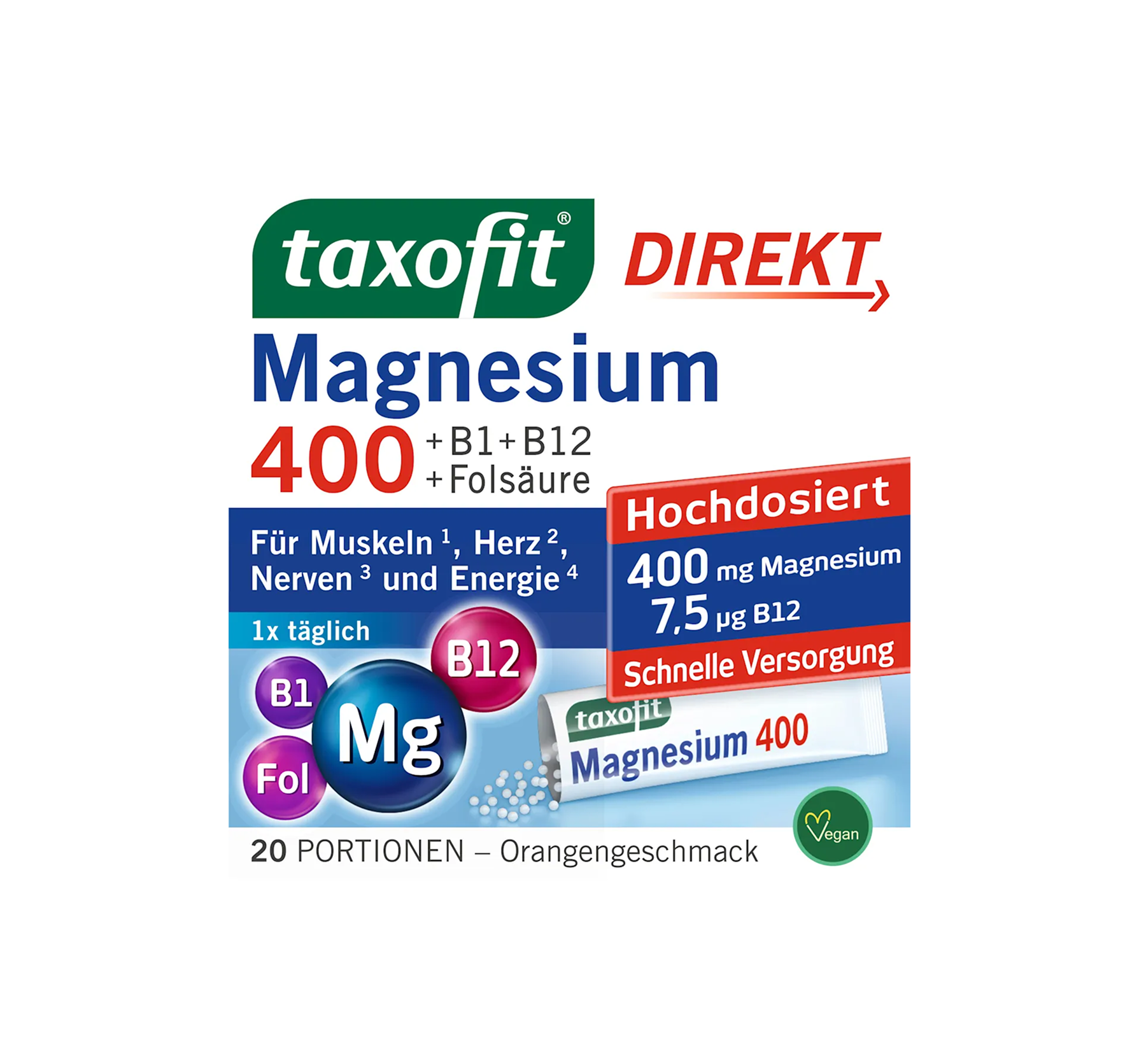 taxofit 镁 400 颗粒含有维生素 B12。镁有助于维持正常的肌肉功能。本产品为纯素产品。20 袋,每袋 2.0 克。taxofit 镁 400 颗粒为纯素产品。