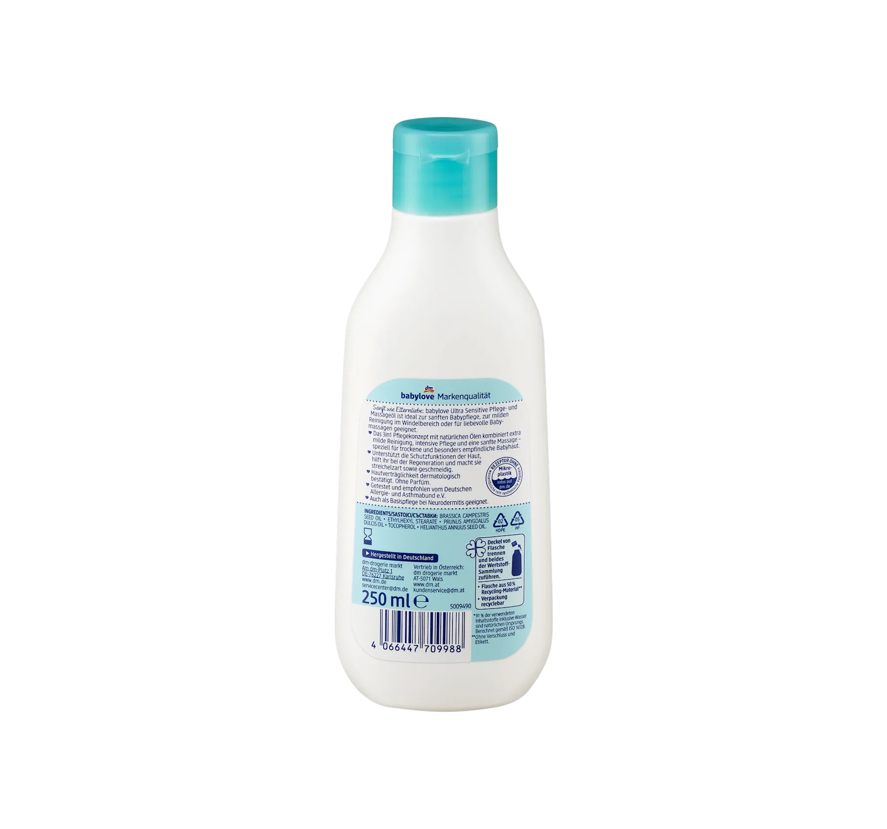 Babylove 超敏感护理按摩油蕴含菜籽油和杏仁油,是温和呵护宝宝或进行爱抚按摩的理想之选。这款三合一护理理念蕴含天然油脂,集超温和清洁、密集护理和轻柔按摩于一体,尤其适用于干燥敏感的婴儿肌肤。它非常适合温和清洁尿布区域和进行婴儿按摩。它能够增强肌肤的保护功能,促进肌肤再生,令肌肤柔软水润。配方不含微塑料和水溶性纯合成聚合物。