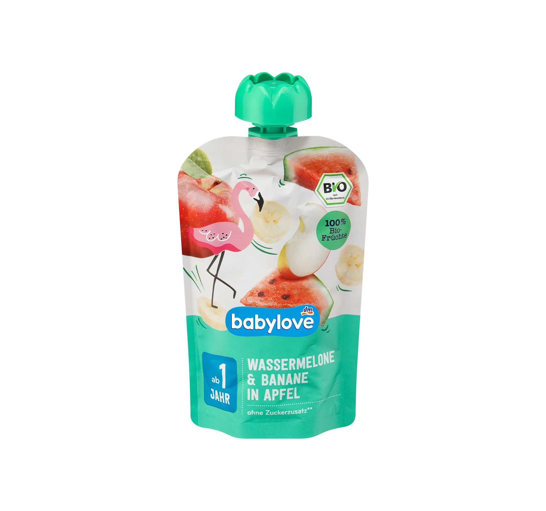 Babylove 西瓜香蕉苹果味挤压袋装,适合1岁以上宝宝食用,内含100%有机水果制成的美味果泥。这款无麸质果泥不添加糖、牛奶、乳制品或增稠剂。**所有成分天然含糖。