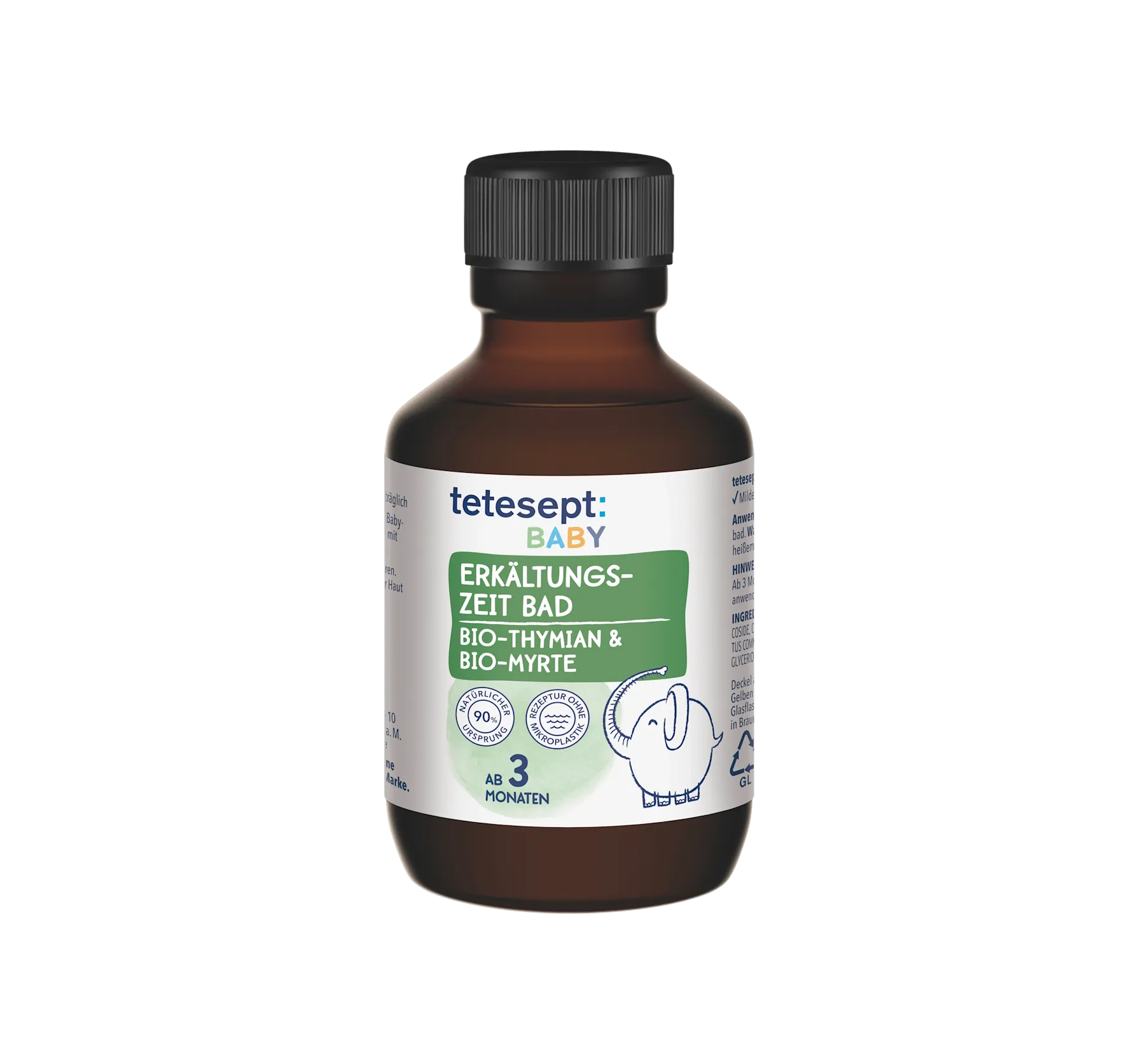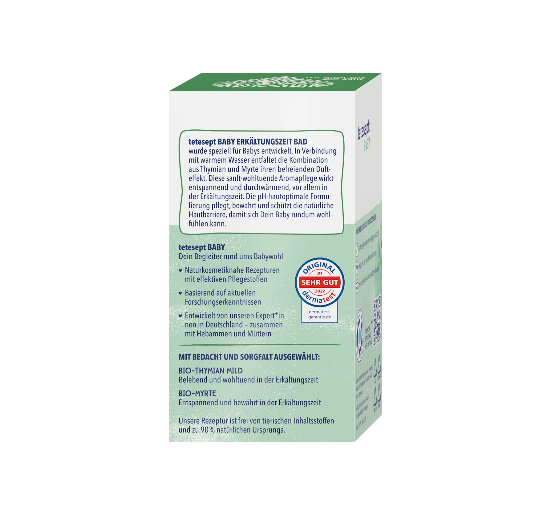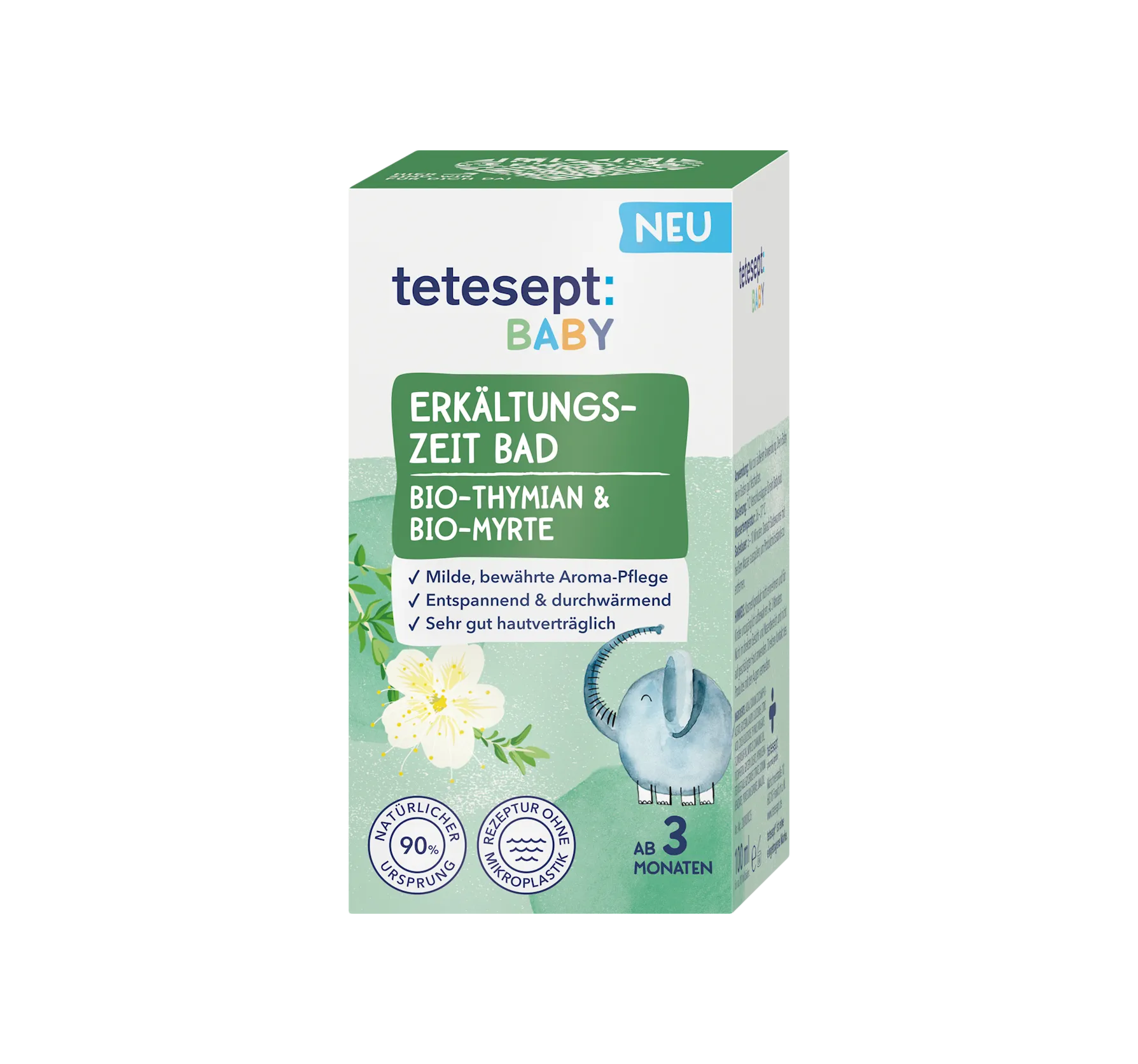 Tetesept 嬰兒感冒季節沐浴乳專為寶寶研發。百里香與桃金孃的芬芳與溫水混合,散發出令人心曠神怡的芬芳。這款溫和舒緩的香氛護理產品,尤其適合寒冷季節,帶來放鬆和溫暖的感受。 pH 值優化的配方能夠滋養、維護和保護寶寶的天然肌膚屏障,讓寶寶倍感舒適。這款沐浴露由德國 Tetesept 專家與助產士和媽媽們共同研發。