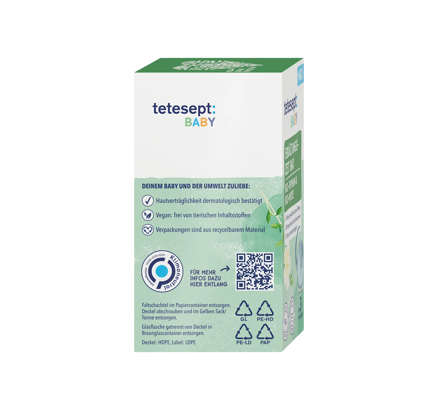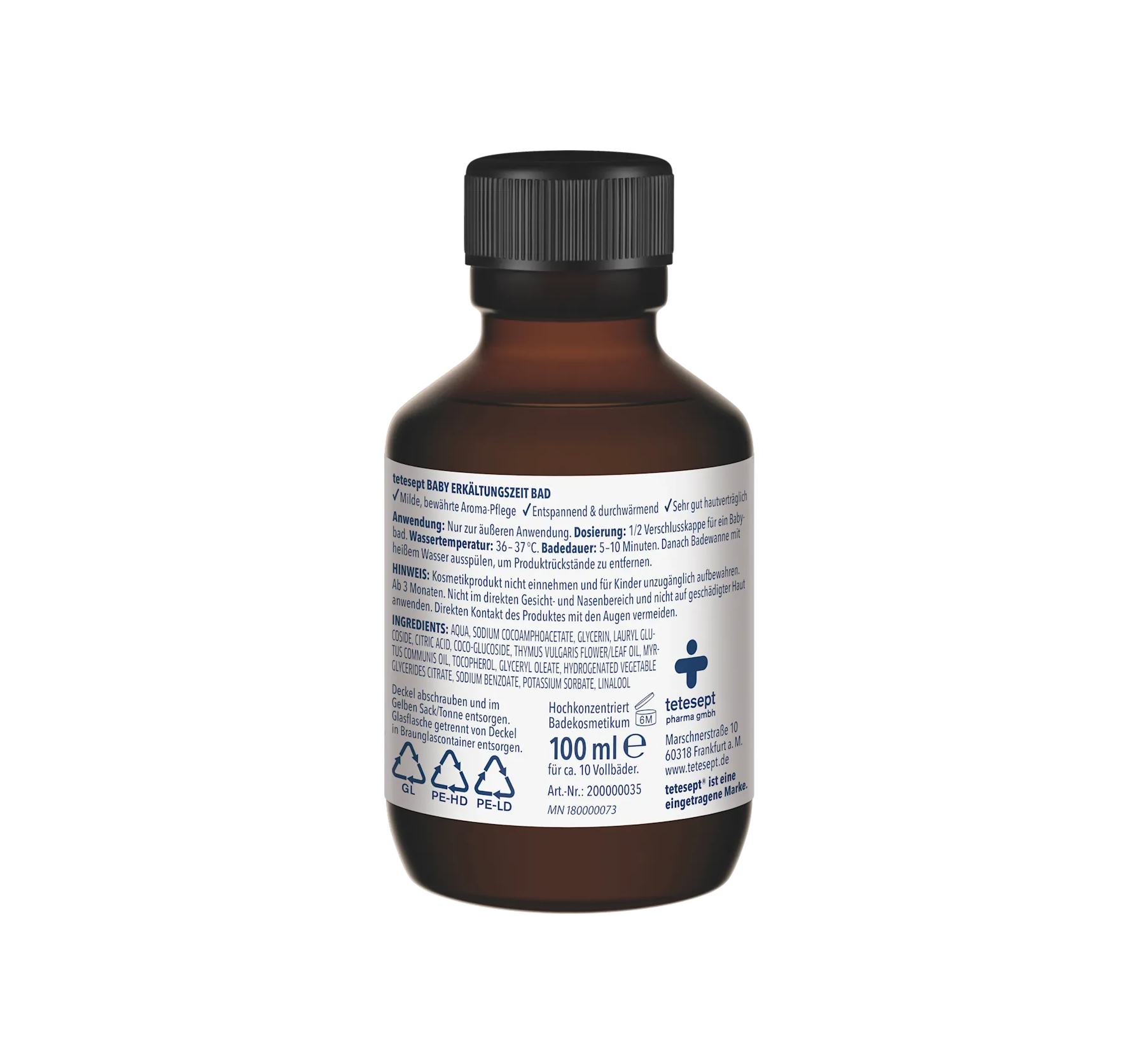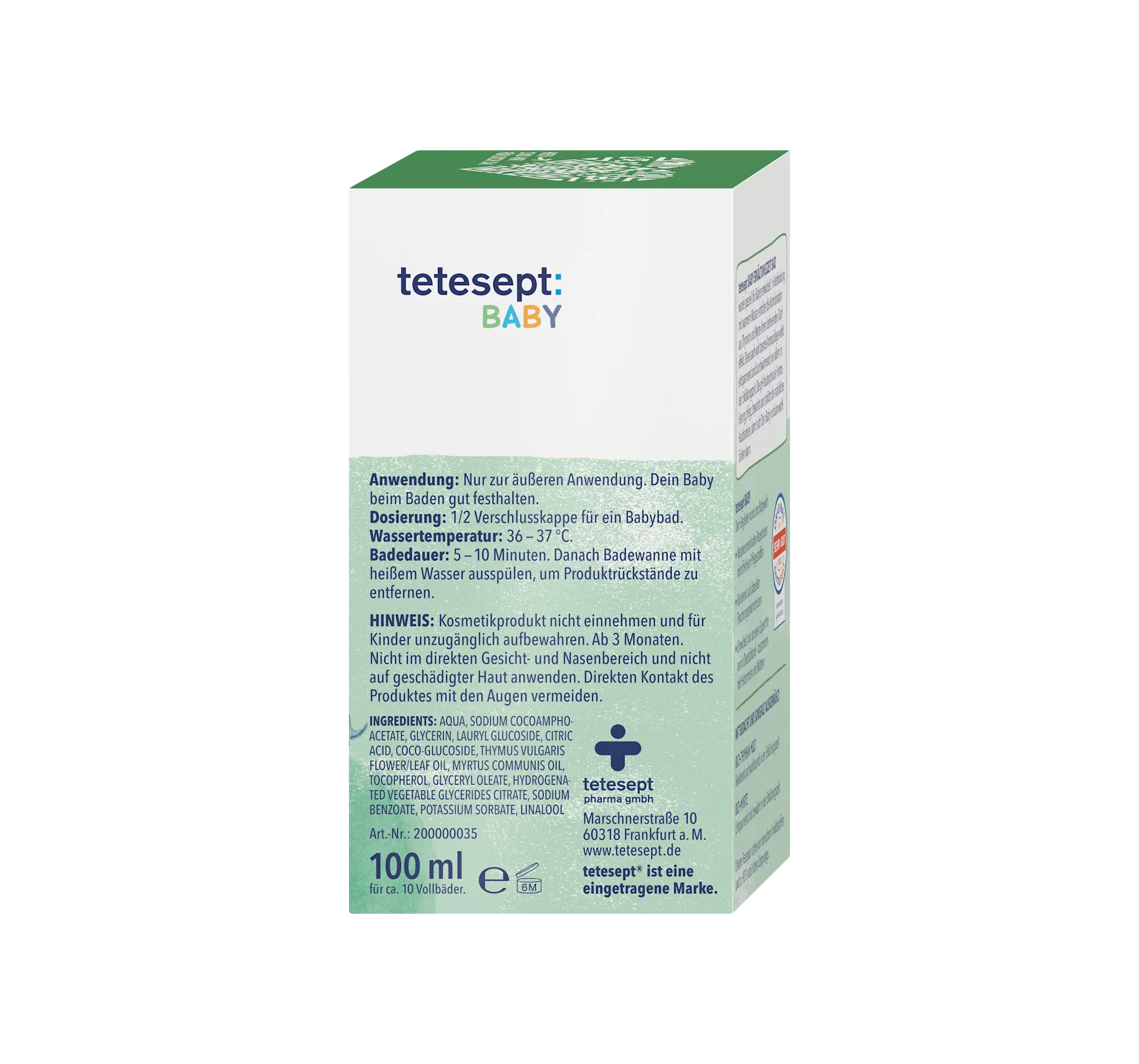 Tetesept 嬰兒感冒季節沐浴乳專為寶寶研發。百里香與桃金孃的芬芳與溫水混合,散發出令人心曠神怡的芬芳。這款溫和舒緩的香氛護理產品,尤其適合寒冷季節,帶來放鬆和溫暖的感受。 pH 值優化的配方能夠滋養、維護和保護寶寶的天然肌膚屏障,讓寶寶倍感舒適。這款沐浴露由德國 Tetesept 專家與助產士和媽媽們共同研發。