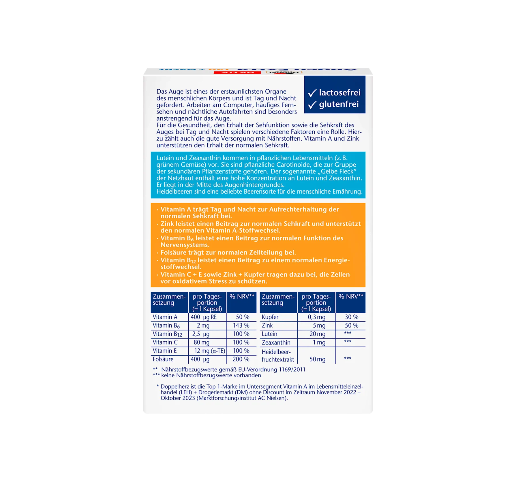 我們的眼睛每天都在使用,無論是閱讀、工作或駕駛。 Doppelherz 的這款膳食補充劑,可以幫助您在日常生活中保持視力。無論您的眼睛如何受到挑戰,您都可以使用 Eye Extra Day + Night 膠囊為身體提供所需的營養。膠囊富含維生素 A 和鋅,有助於維持視力。這款膳食補充劑還含有葉黃素、玉米黃質和藍莓萃取物。