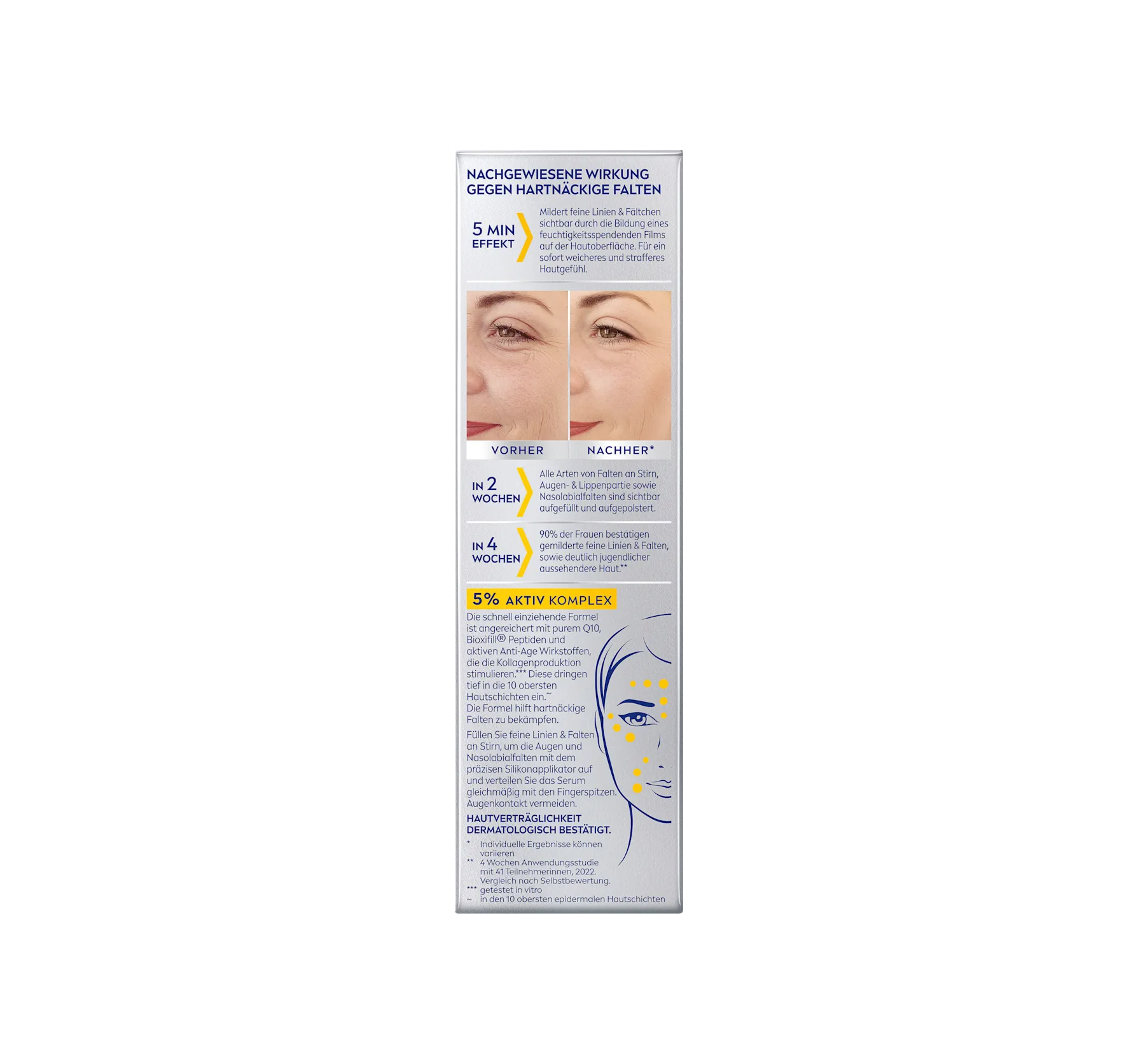 使用精確的矽膠塗抹器填充額頭、眼睛周圍和法令紋的細紋和皺紋,並用指尖均勻塗抹精華液。
