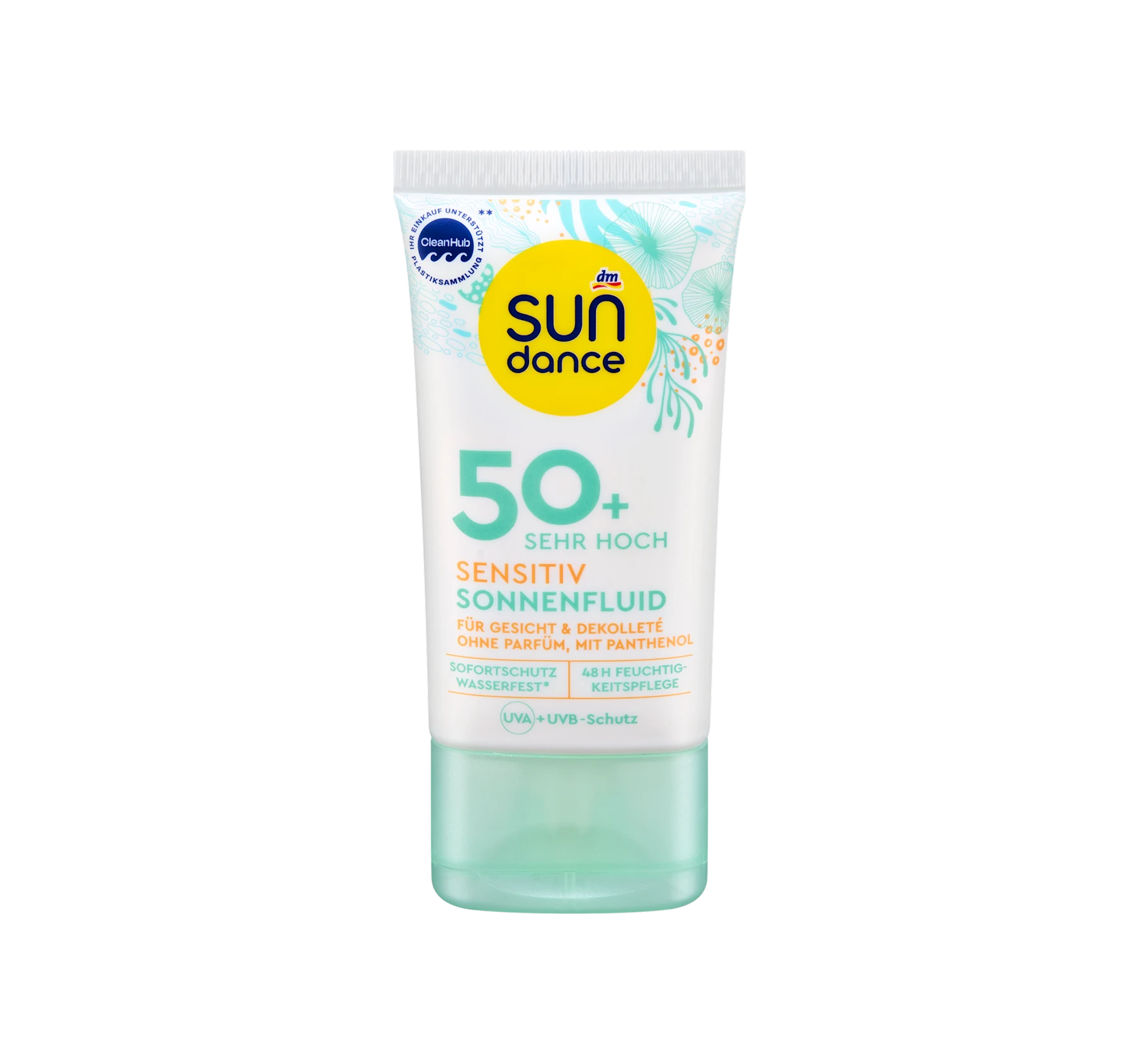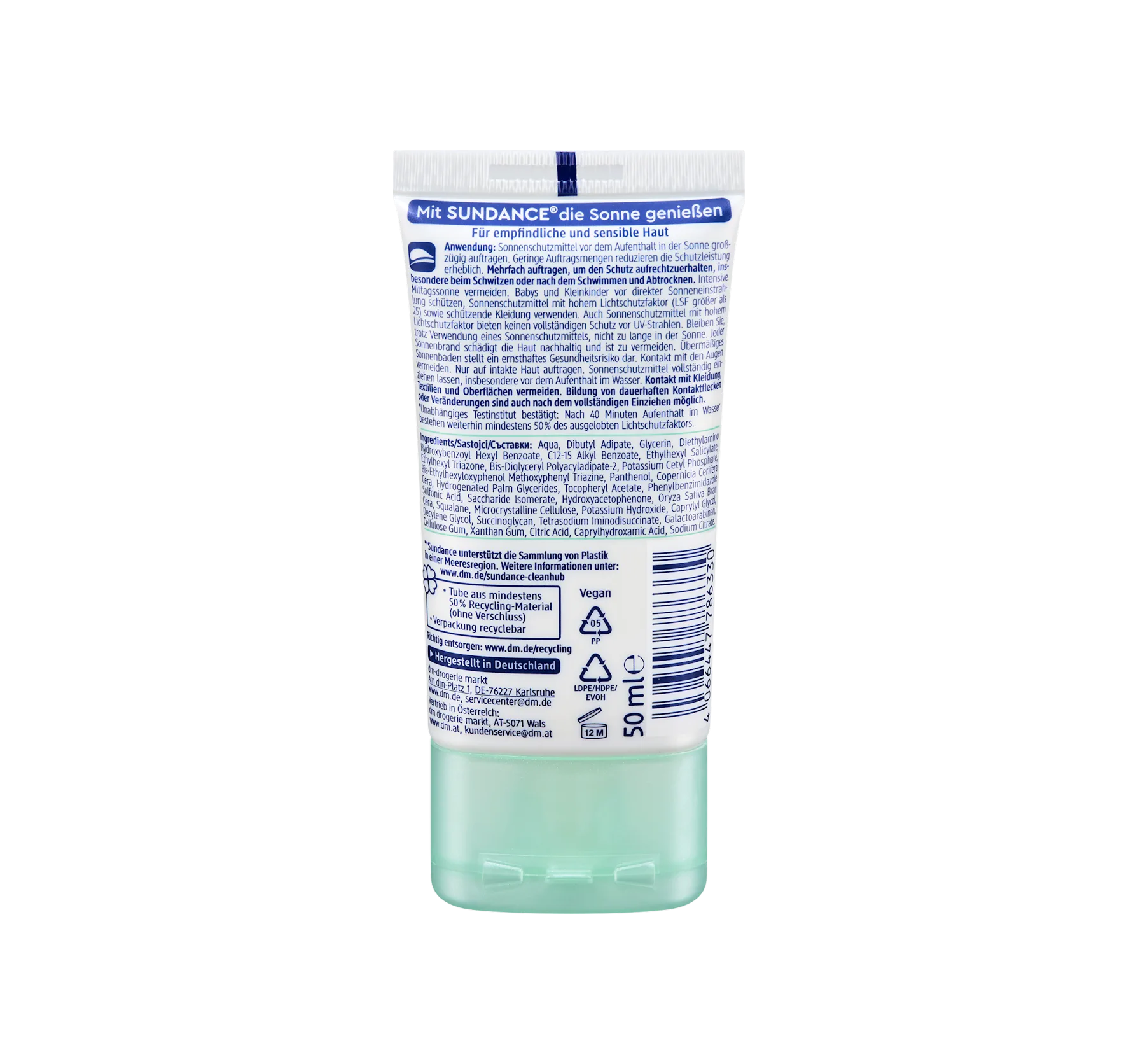 專為嬌嫩敏感肌膚打造:SUNDANCE 臉部及肩頸敏感防曬霜,SPF 50+,防水*,不含有害紫外線過濾劑辛辛酸酯、氧苯酮和奧克立林。其配方不含微塑膠和水溶性純合成聚合物。 (*經獨立檢測機構確認:浸泡在水中 40 分鐘後,至少能維持額定防曬係數的 50%。)