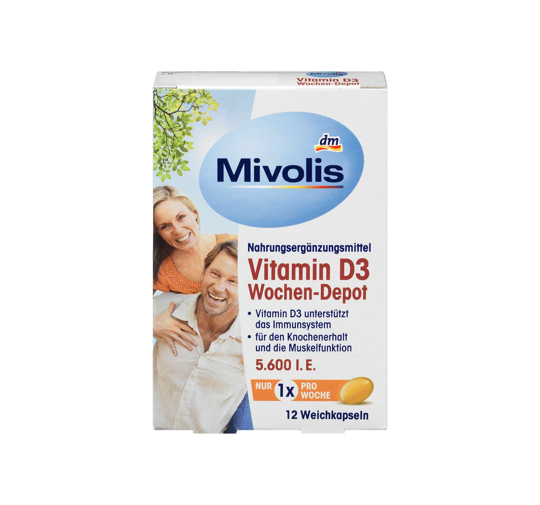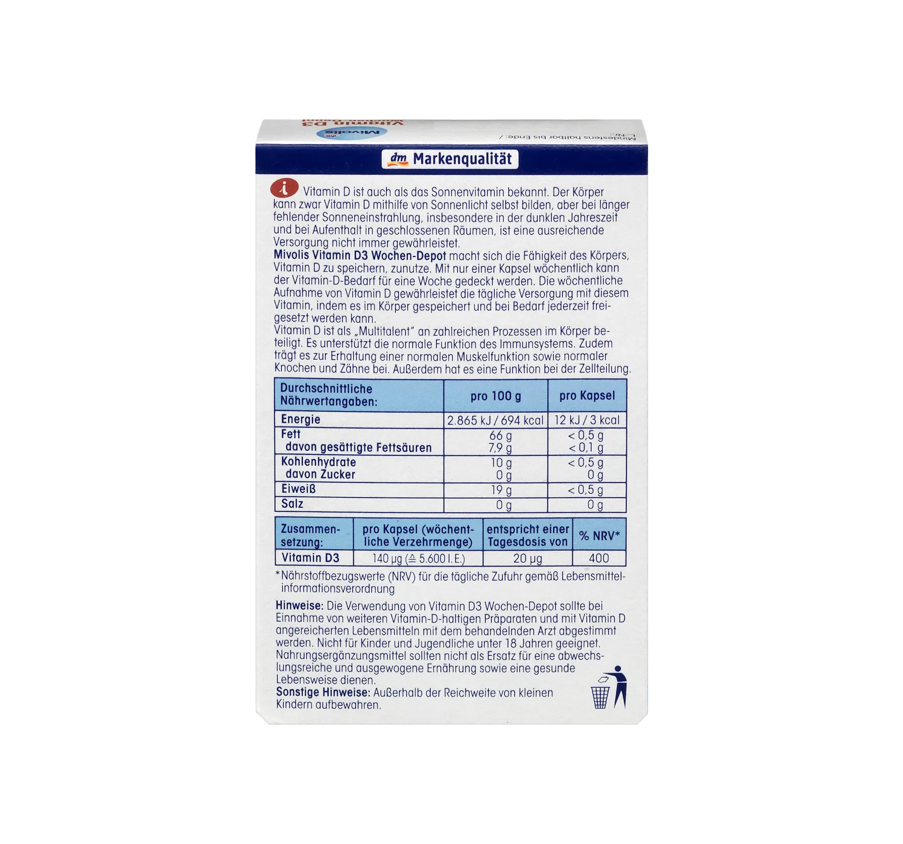 維生素 D 也被稱為「陽光維生素」。雖然人體可以藉助陽光自行產生維生素 D,但長期缺乏陽光,尤其是在一年中較暗的月份以及待在室內時,往往無法保證充足的維生素 D 供應。 Mivolis 維生素 D3 週劑量膠囊充分利用了人體儲存維生素 D 的能力。每週只需一顆膠囊即可滿足您一週的維生素 D 需求。每週攝取維生素 D 可確保每日維生素 D 的供應,因為它可以儲存在體內,並在需要時隨時釋放...