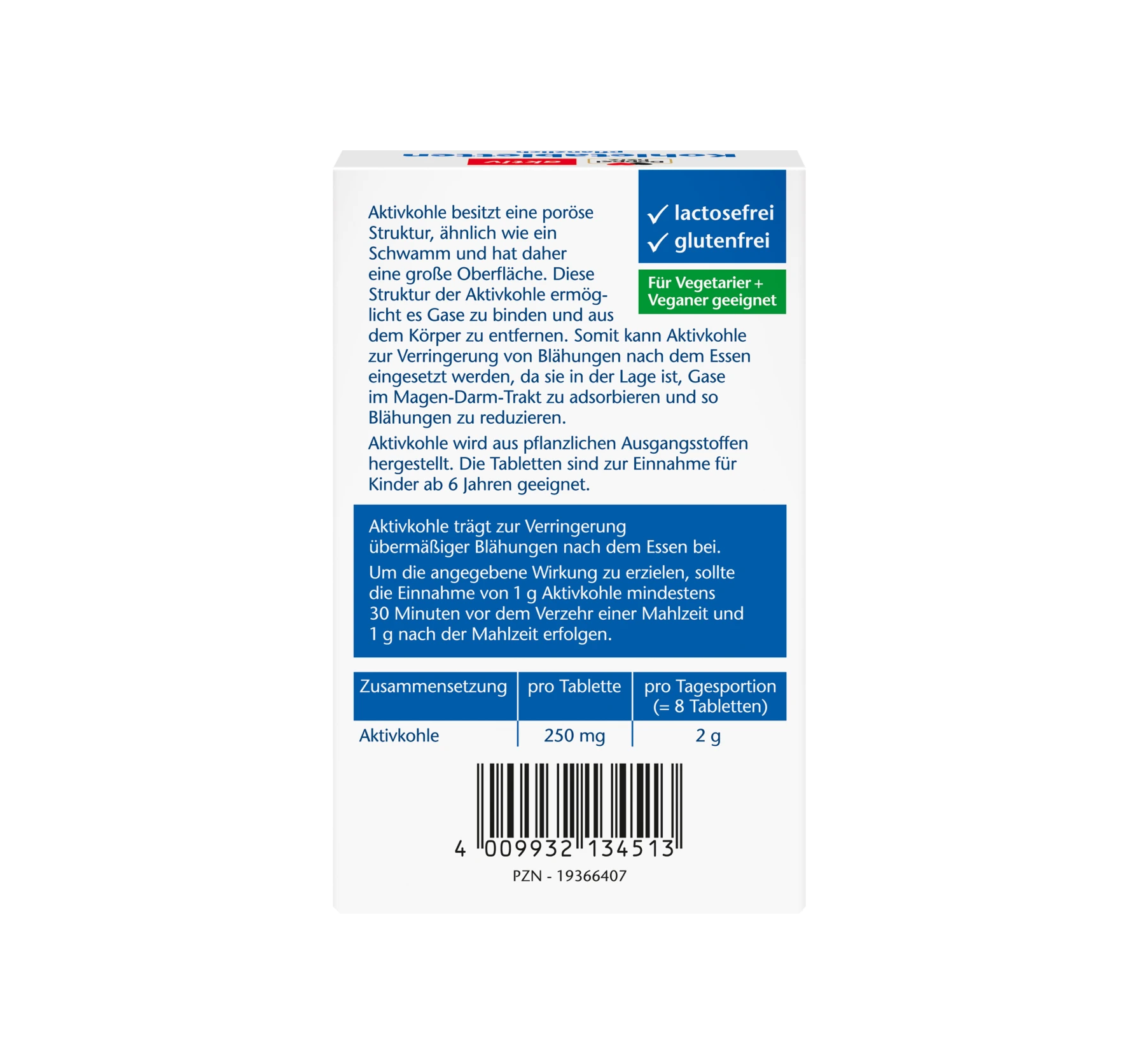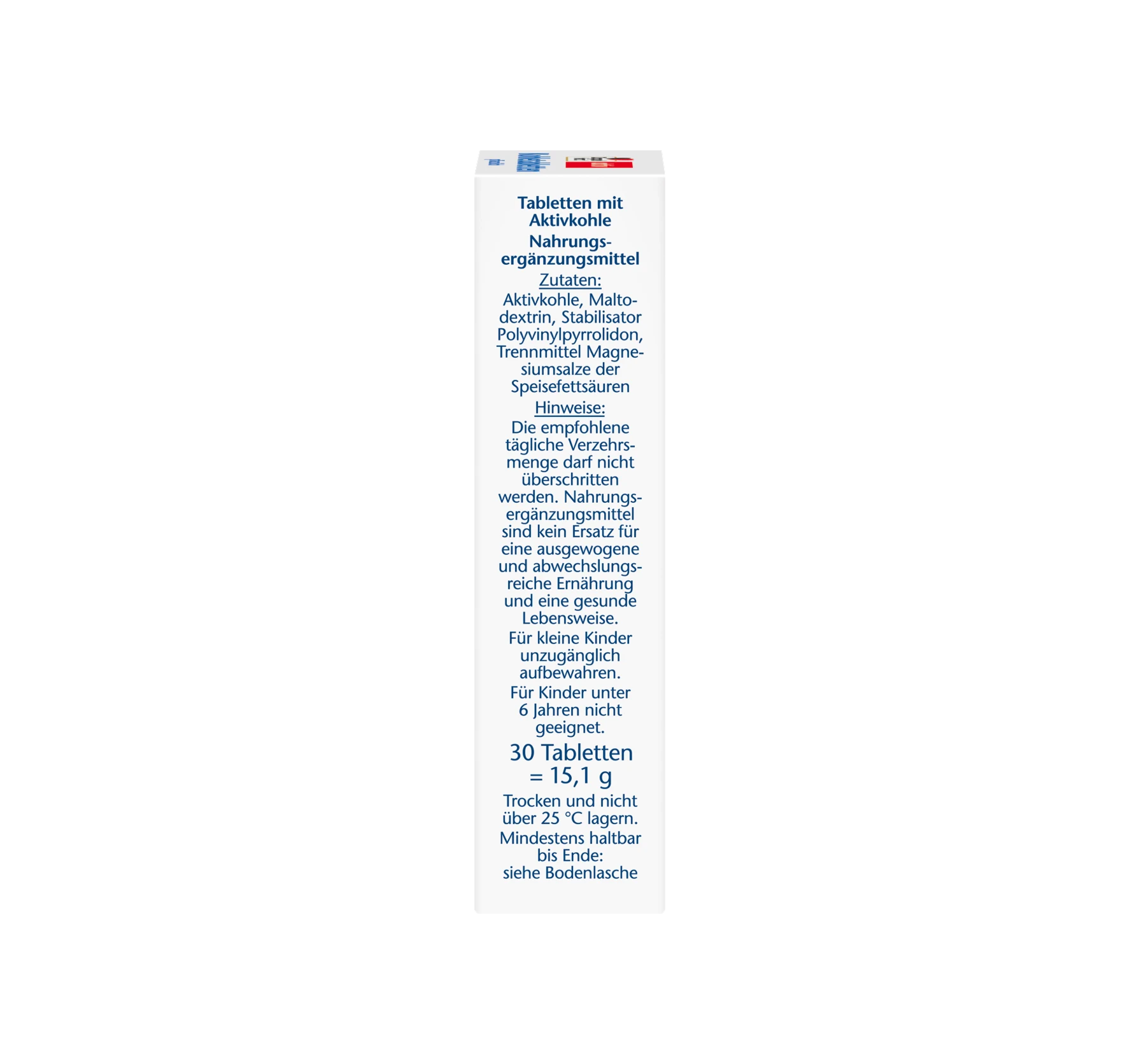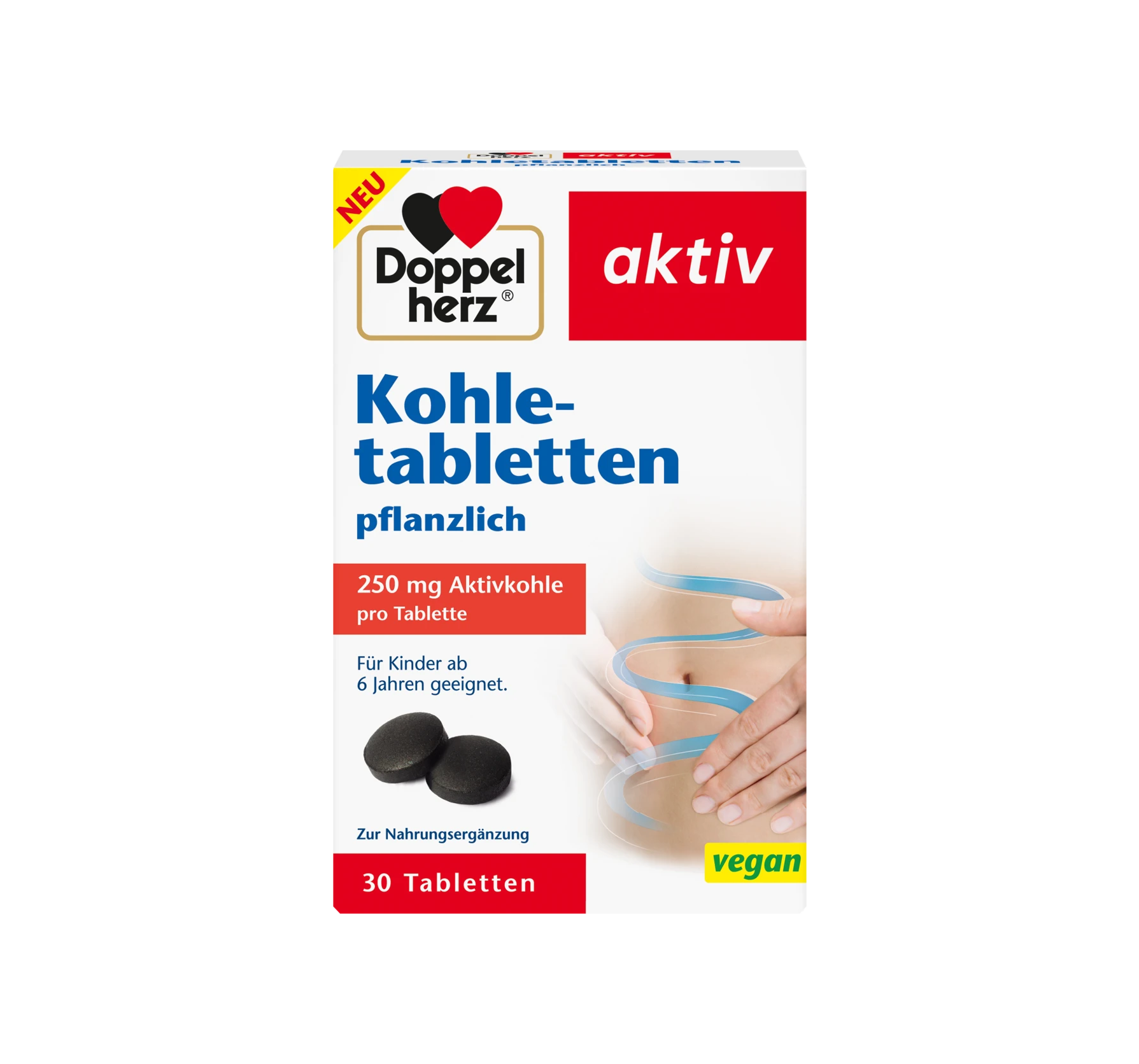 多普勒斯 (Doppelherz) 實用活性碳片,富含活性炭,有助於緩解脹氣。活性碳的結構使其能夠吸附氣體,從而減少脹氣。為了達到此效果,請在餐前至少 30 分鐘服用 1 克活性炭,餐後再服用 1 克。此藥片適用於 6 歲及以上兒童。