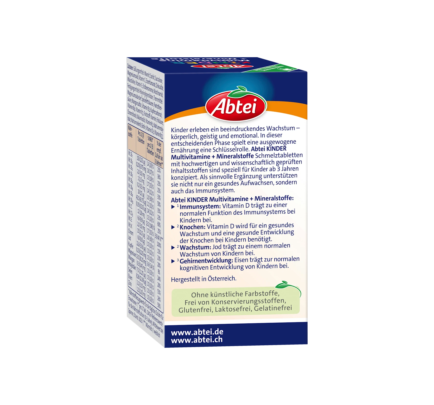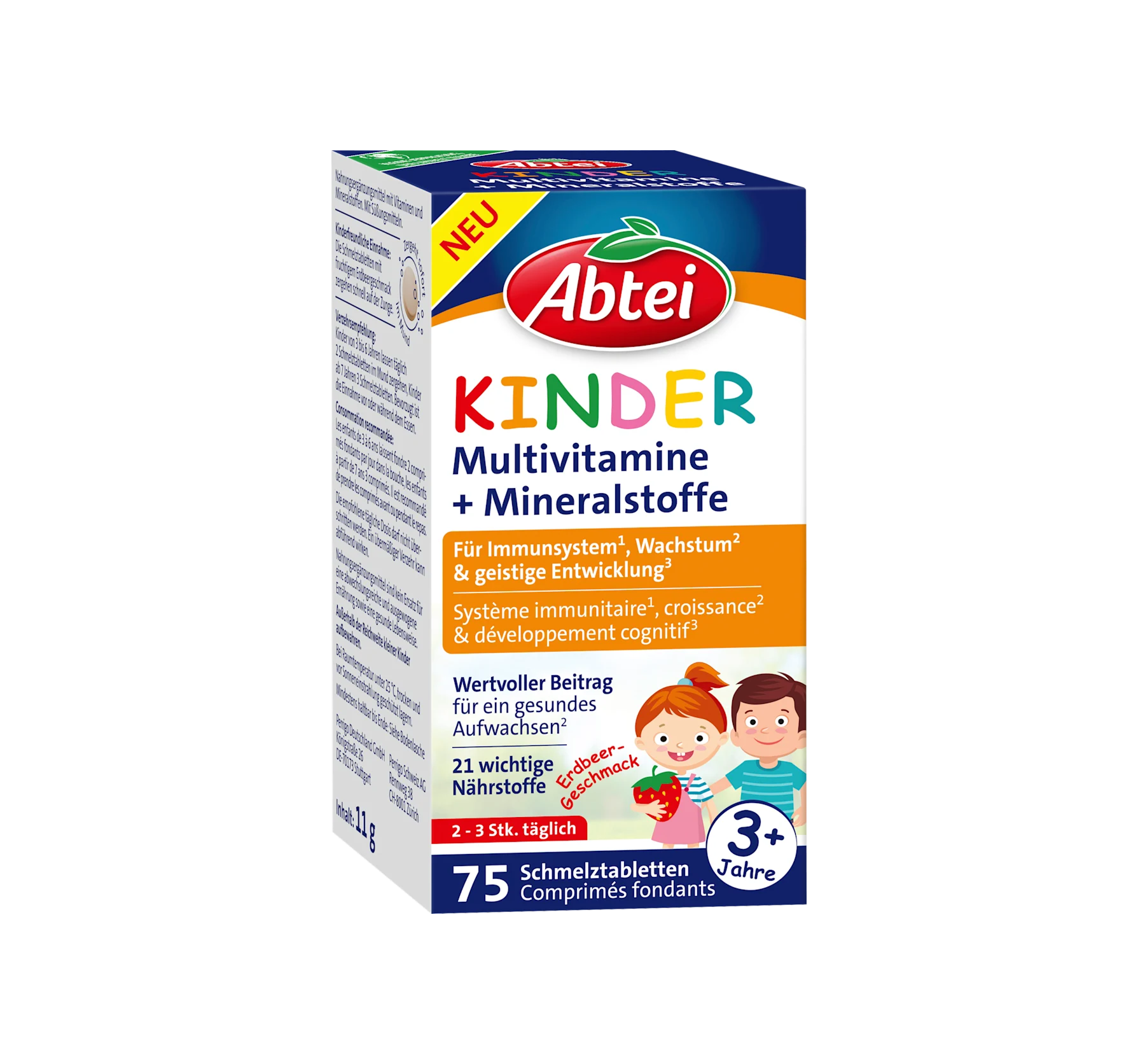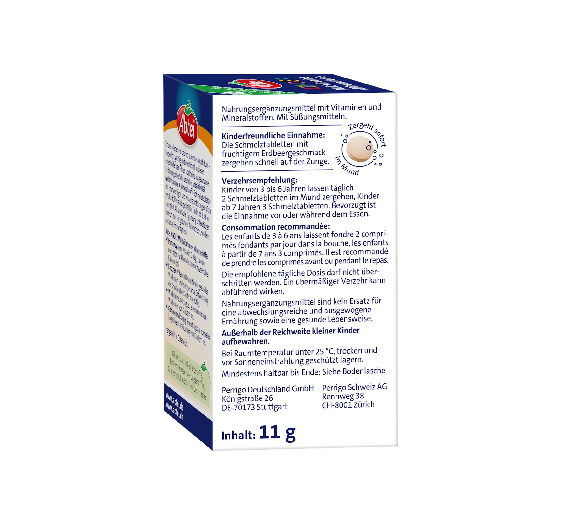 Abtei 的兒童複合維生素入口即化片劑,具有美味的草莓口味,富含 21 種營養素,包括維生素 D、碘和鐵。維生素 D 有助於維持免疫系統的正常功能和骨骼的正常發育。碘有助於維持正常的生長發育,鐵則有助於正常的認知發展。這些片劑不含人工色素、防腐劑、麩質、乳糖和明膠。