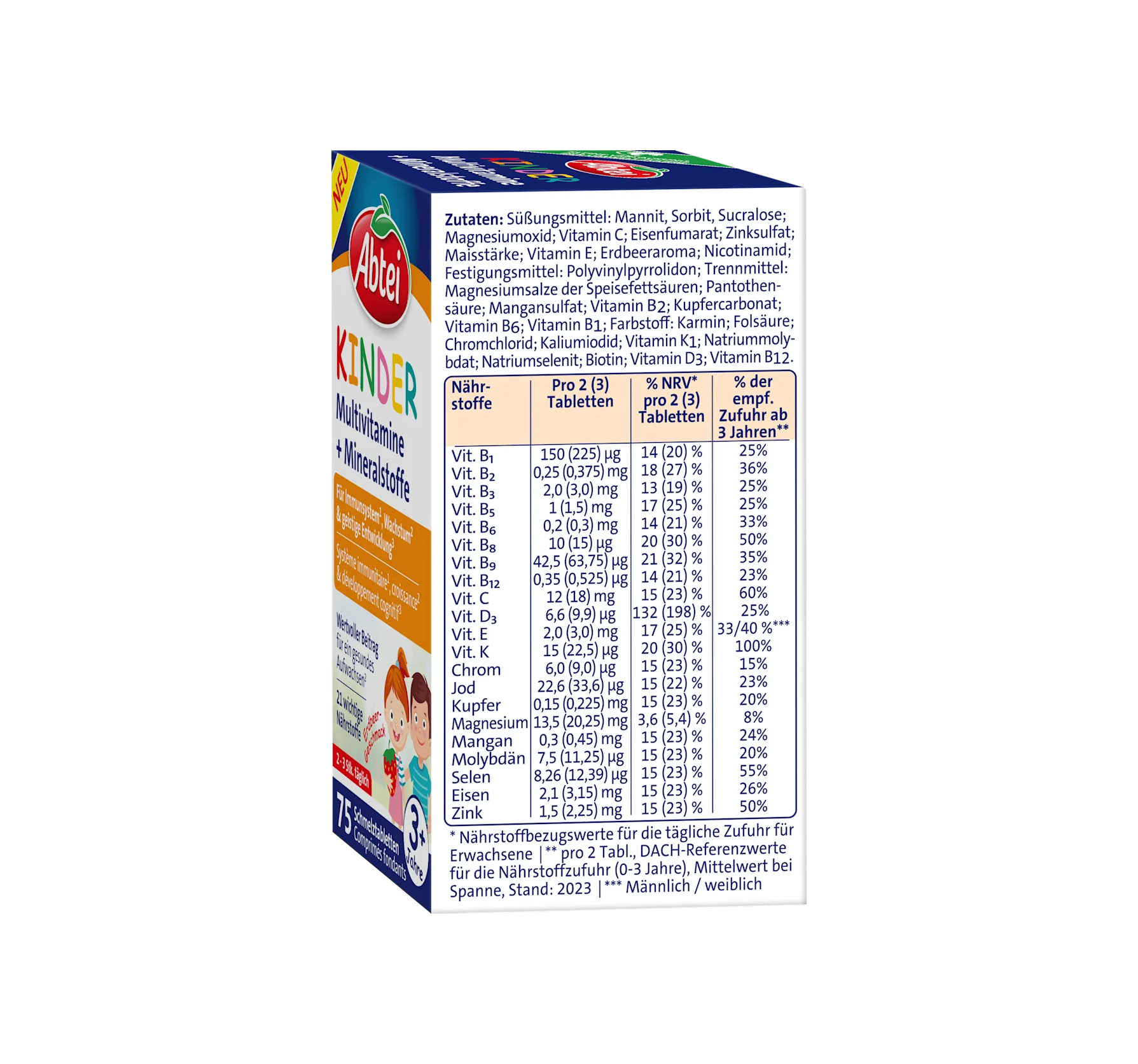 確切產品名稱:含維生素和礦物質的食品補充劑。含甜味劑。成分:甜味劑:甘露醇、山梨糖醇、三氯蔗糖;氧化鎂;維生素 C;富馬酸亞鐵;硫酸鋅;玉米澱粉;維生素 E;草莓香料;煙鹼醯胺;固化劑:​​聚乙烯吡咯烷酮;抗結劑:脂肪酸鎂鹽;泛酸;硫酸錳;維生素 B2;碳酸鈣維生素維生素 B6;維生素 B1;脂肪酸鎂脂酸; K1;鉬酸鈉;亞硒酸鈉;生物素;維生素 D3;維生素 B12。