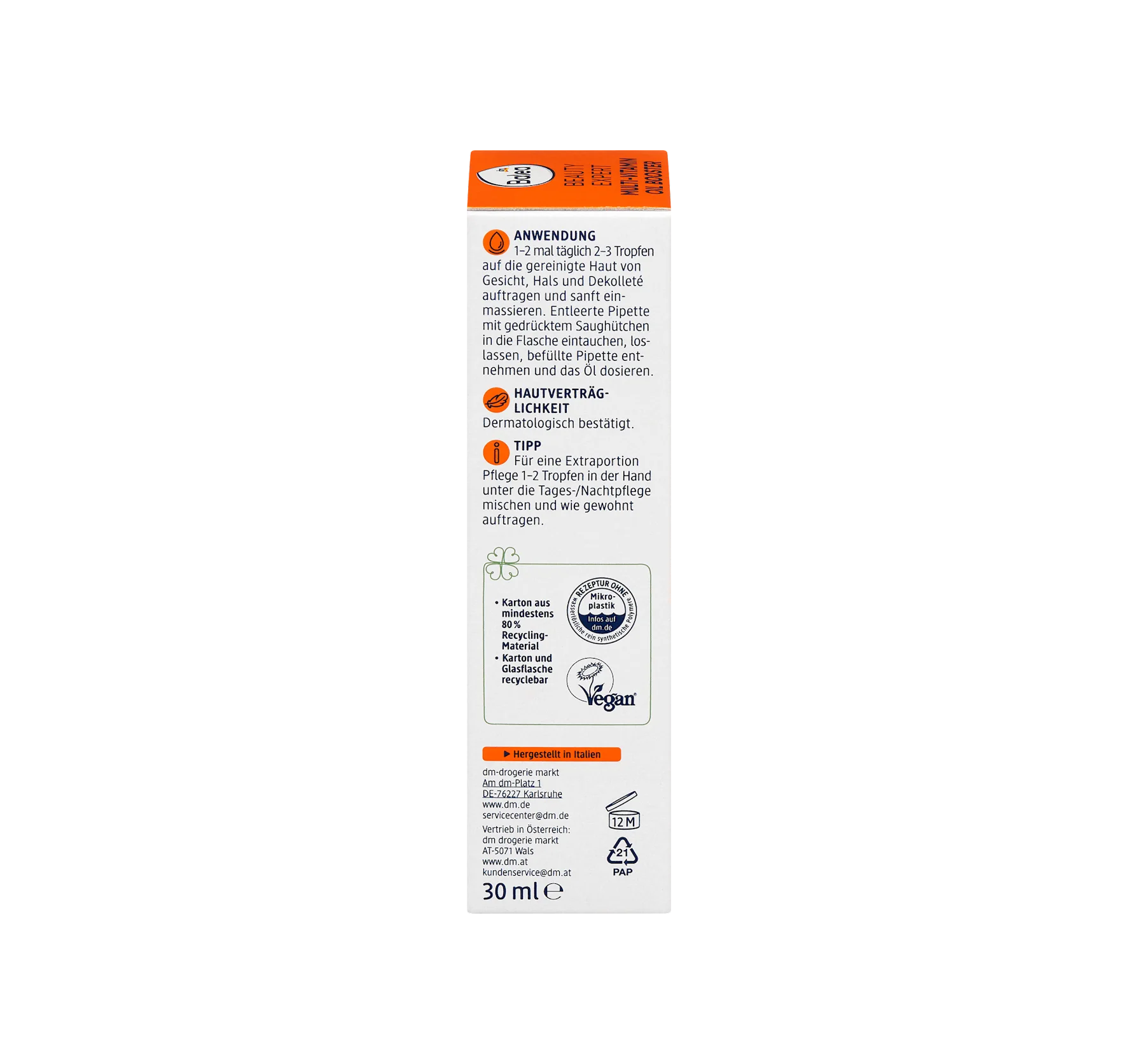 成分:甜扁桃油、二辛醚、葡萄籽油、霍霍巴籽油、胡蘿蔔籽油、亞麻油酸、生育酚乙酸酯、泛醇三乙酸酯、抗壞血酸四異棕櫚酸酯、亞麻酸、抗壞血酸棕櫚酸酯、向日葵籽油、生育酚、迷迭香葉萃取、卵磷脂。