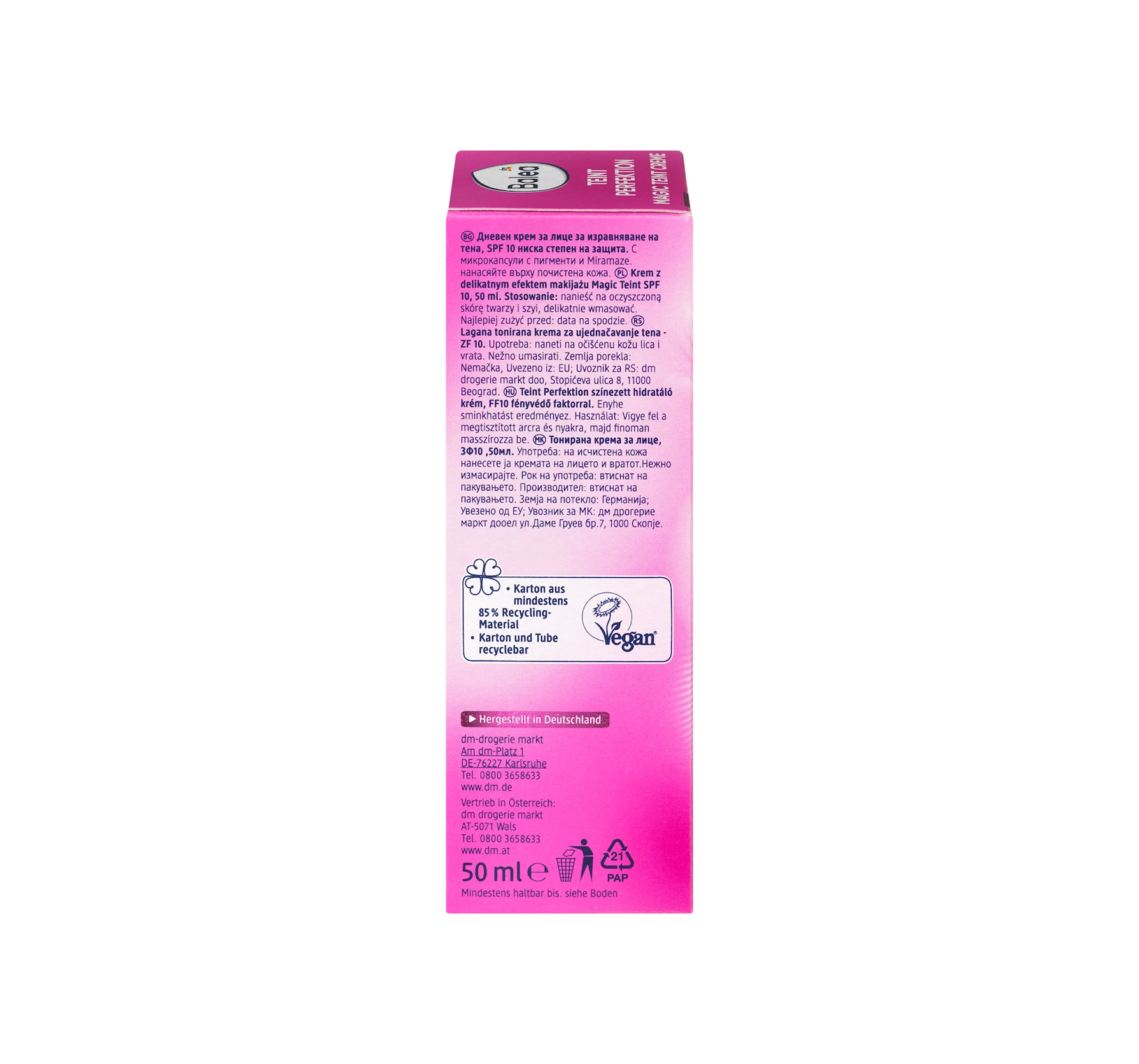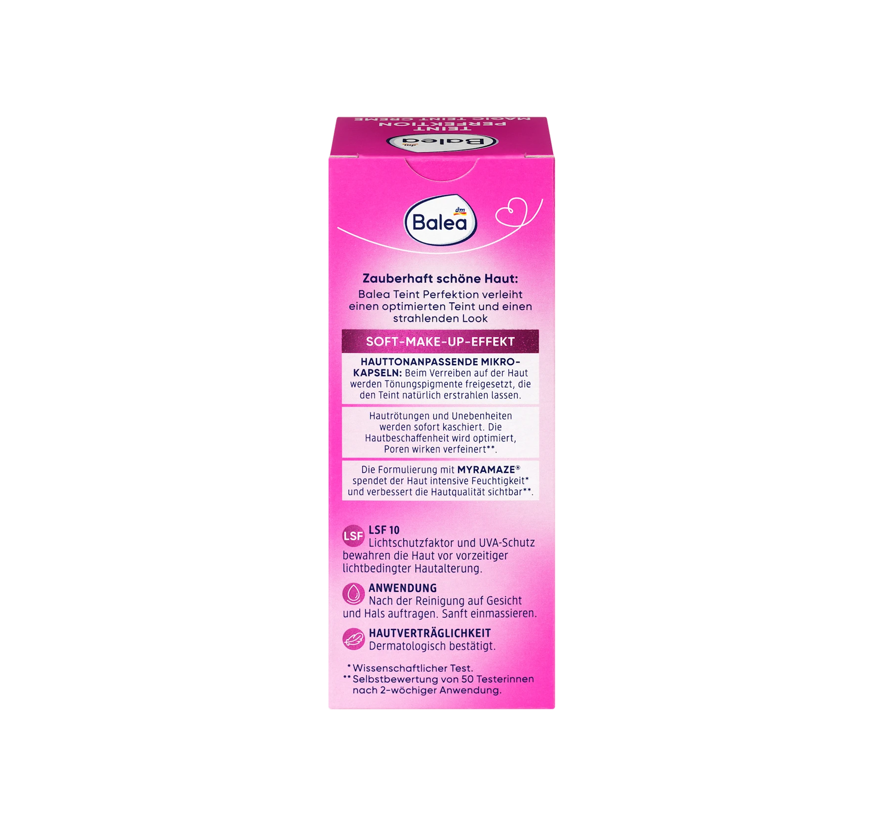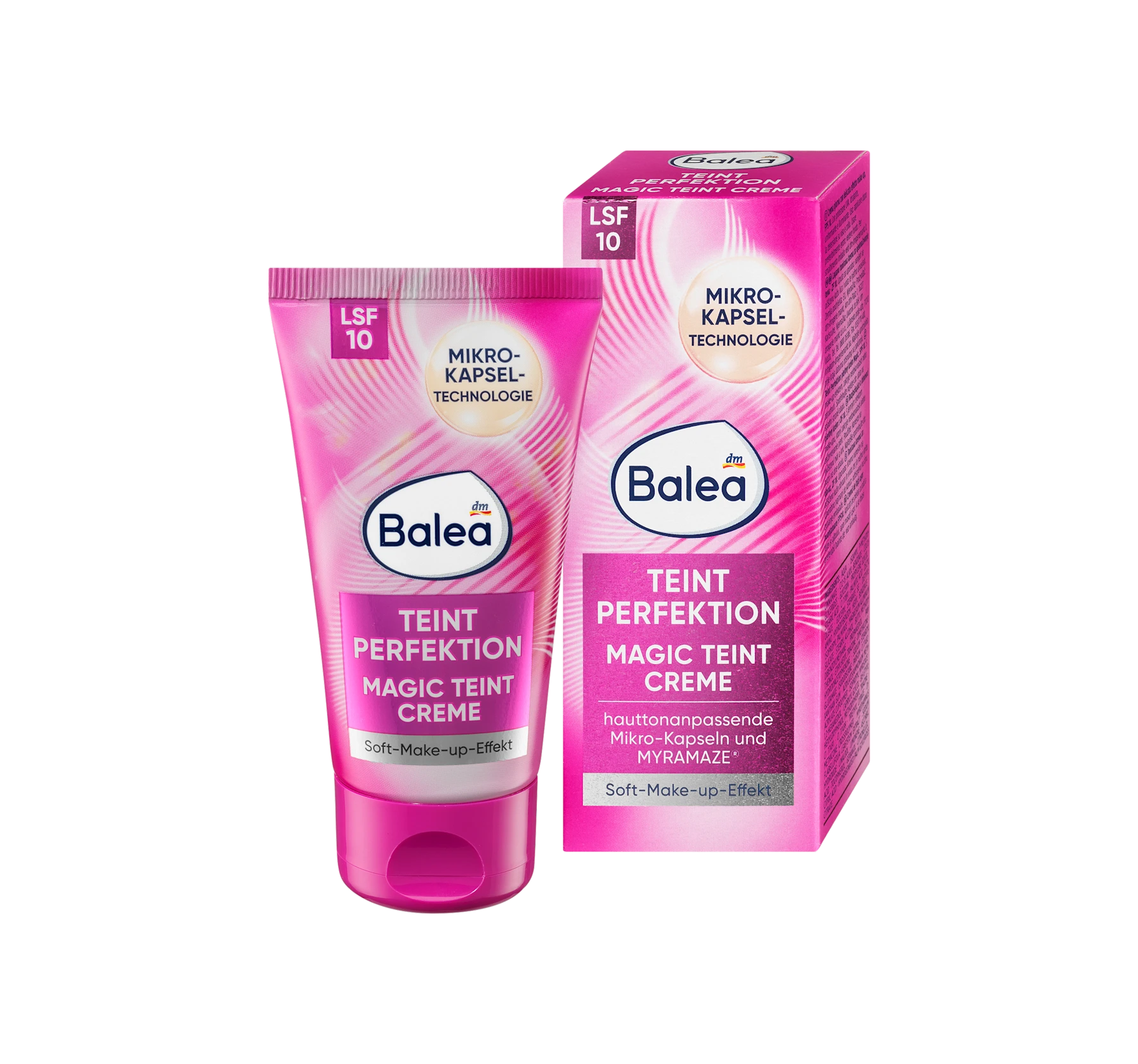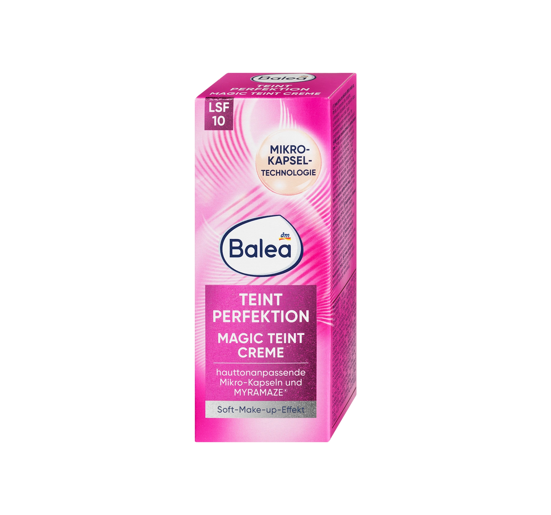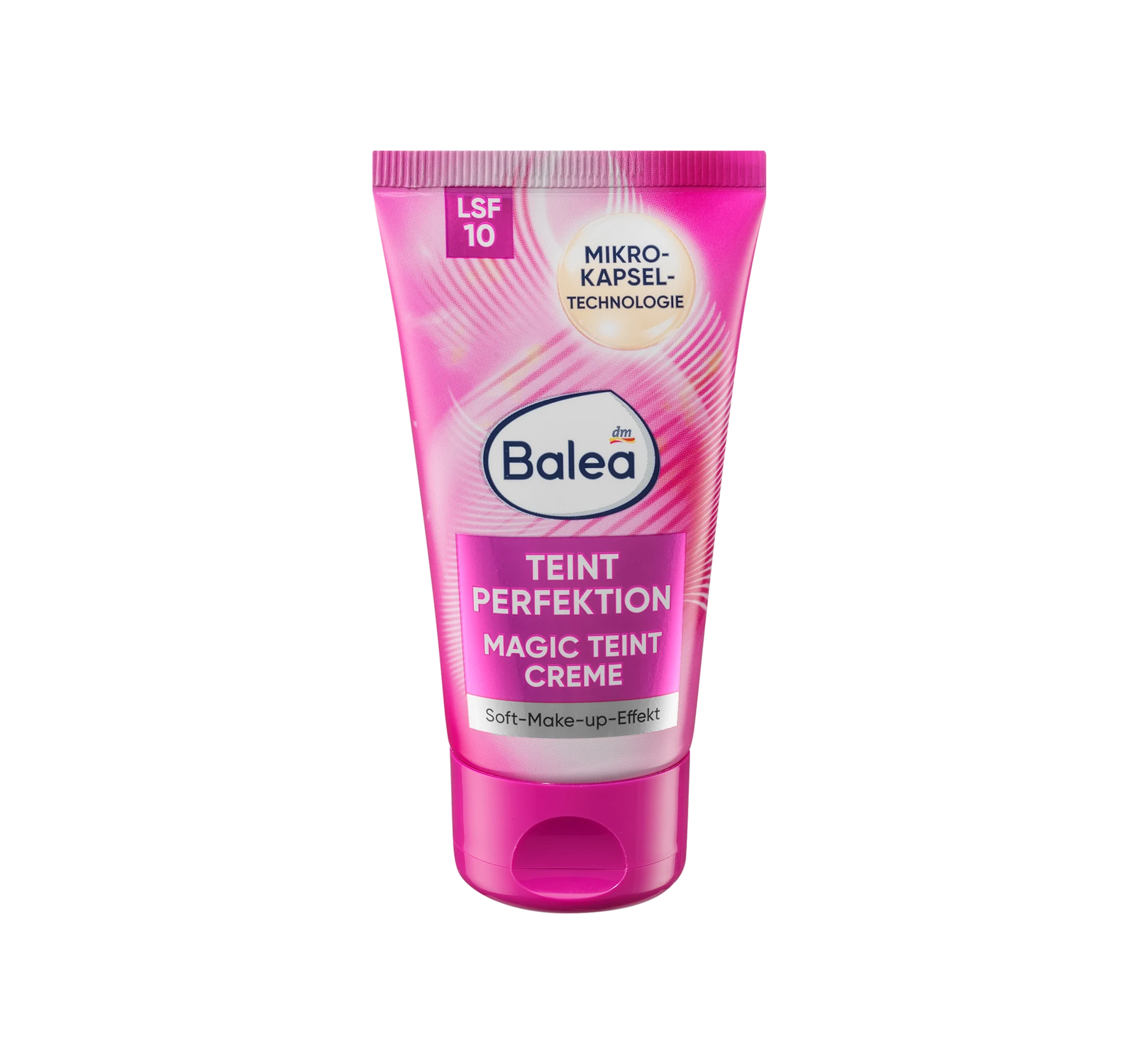 潔面後,將Balea Teint Perfektion Magic Teint Cream塗抹於臉部和頸部,輕輕按摩。